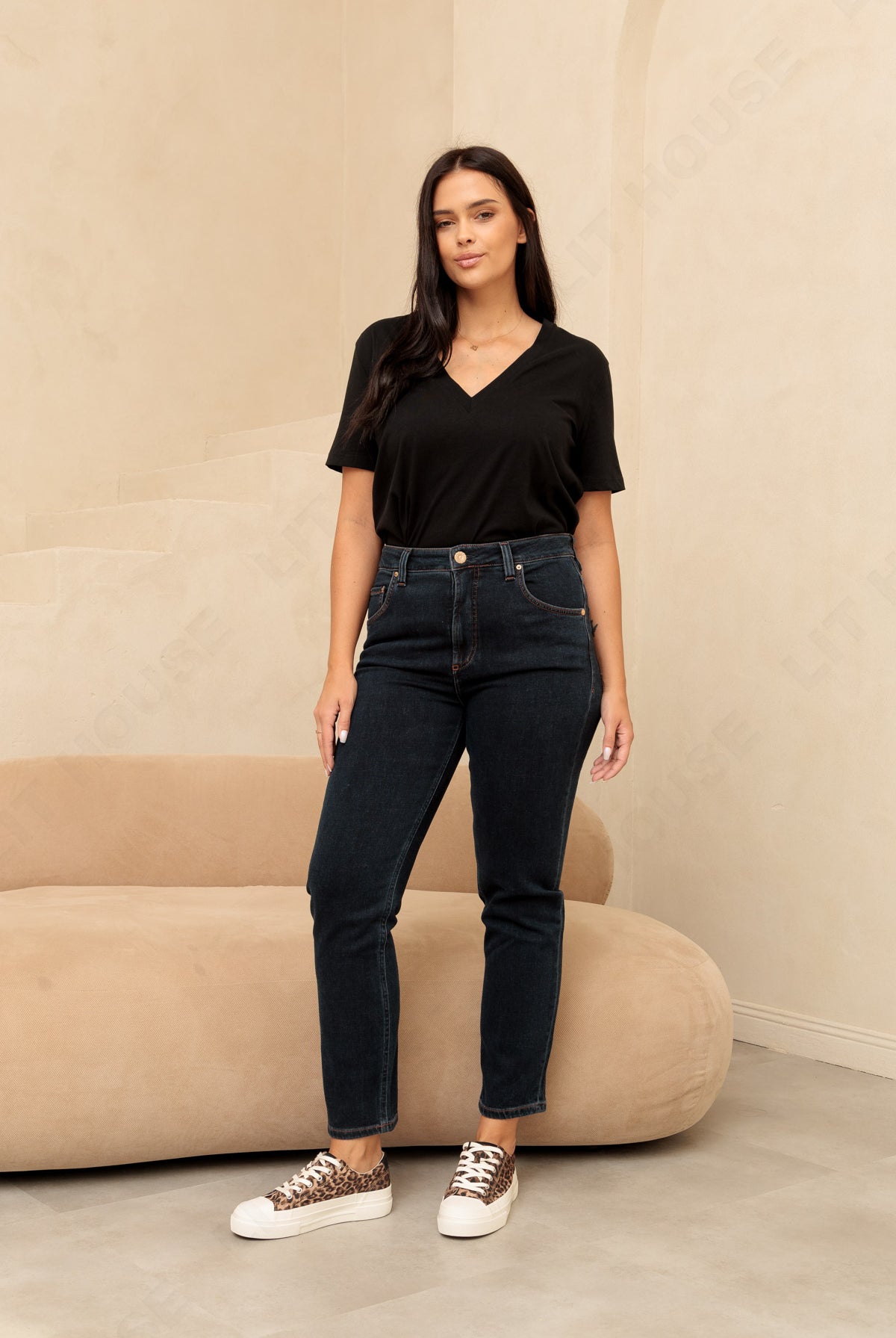 Granatowe jeansy z prostą nogawką to podstawa kapsułowej szafy. Głęboki odcień, uzyskany dzięki selektywnie dobranym barwnikom, optycznie wysmukla, a minimalne przeszycia w kolorze tkaniny podkreślają nowoczesny minimalizm.