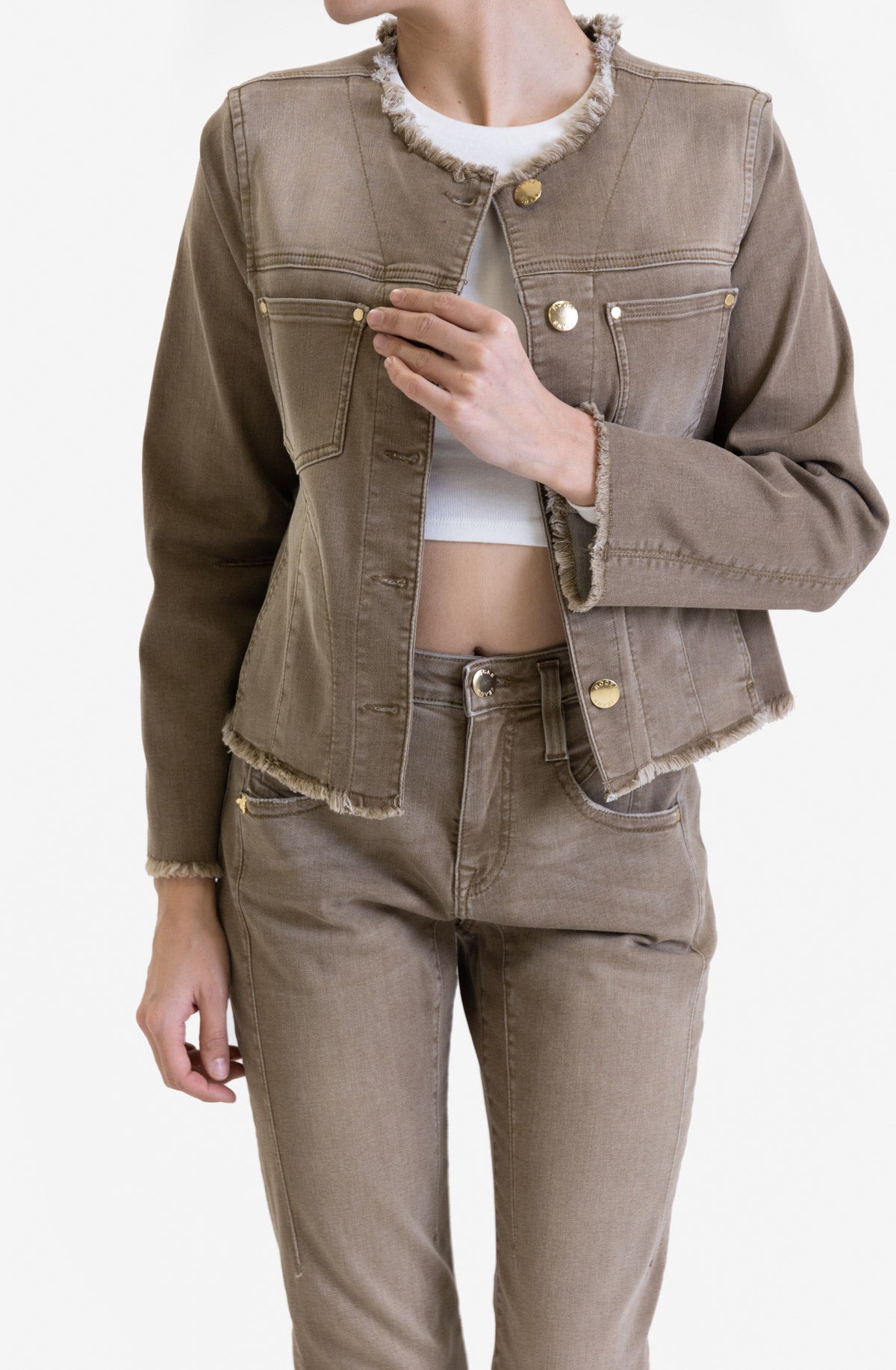 New in! Our bestseller jacket NOLITA made of thin and elastic fabric in beige colour. Our Model is 172 cm tall and wears size S.