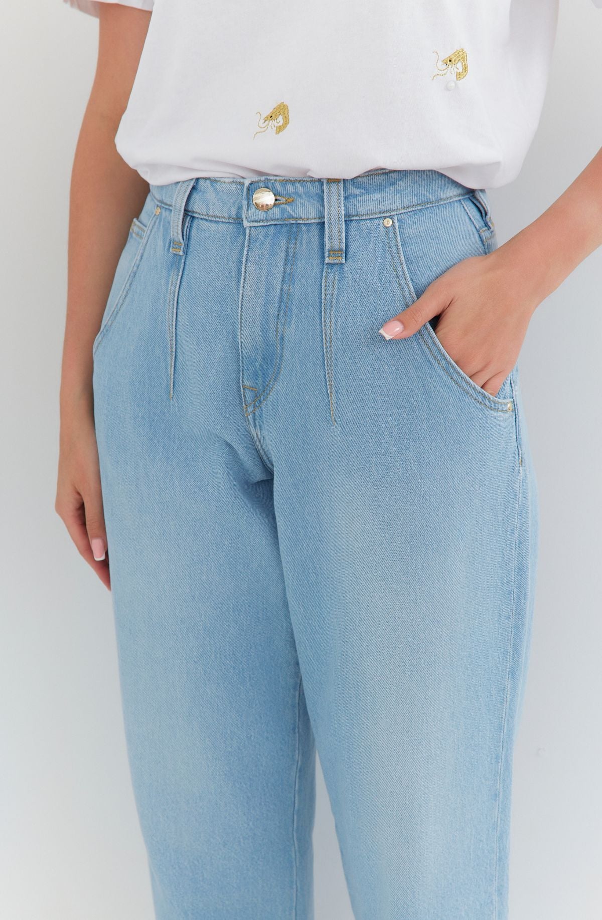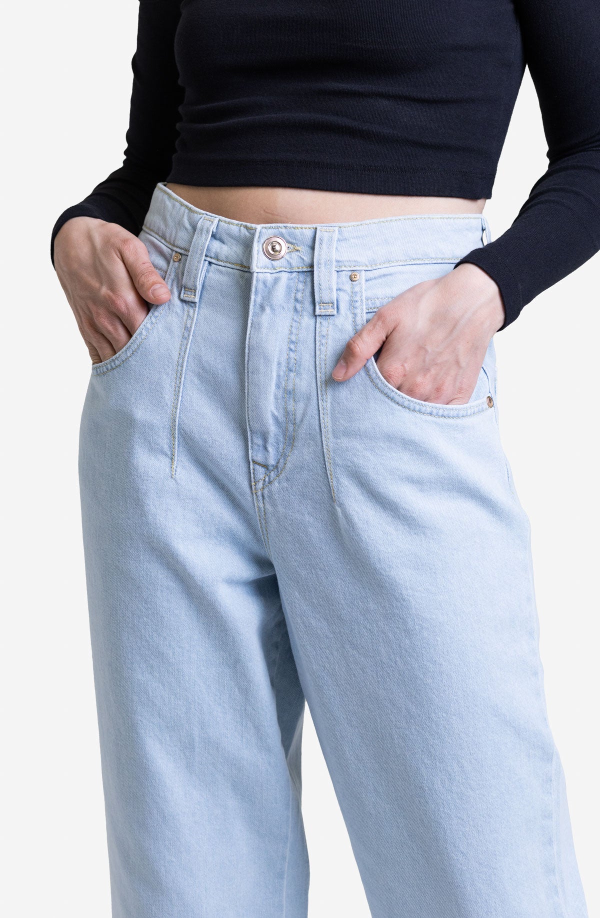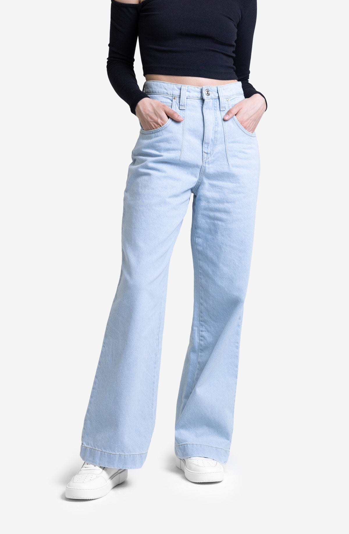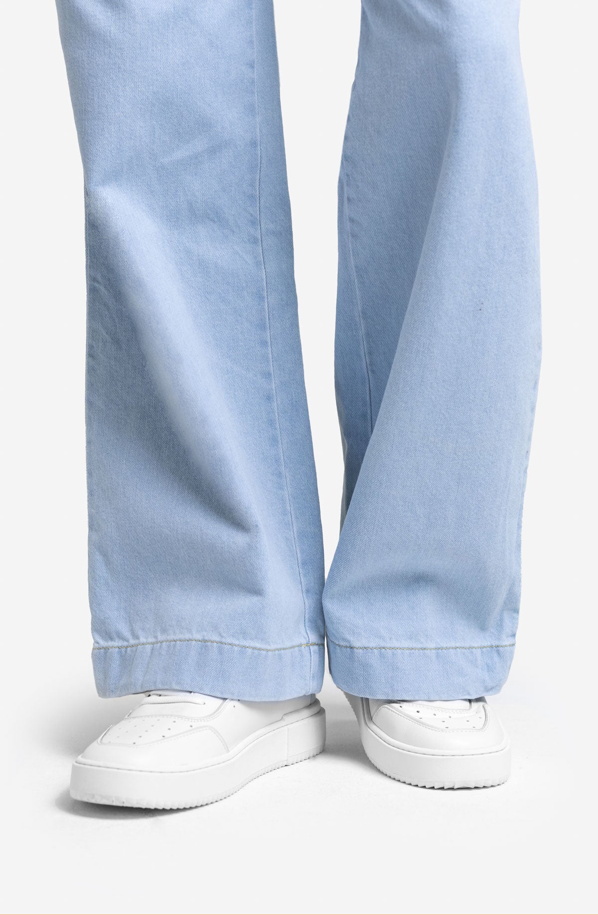 High waist, wide leg jeans made of heavenly soft fabric in light blue colour. High waist. Our Model is 172 cm tall and wears size S.