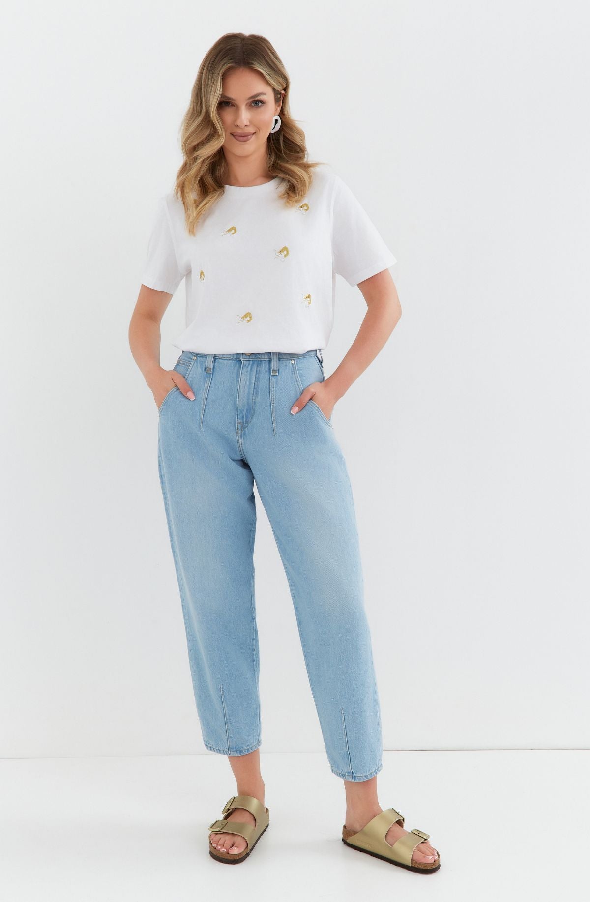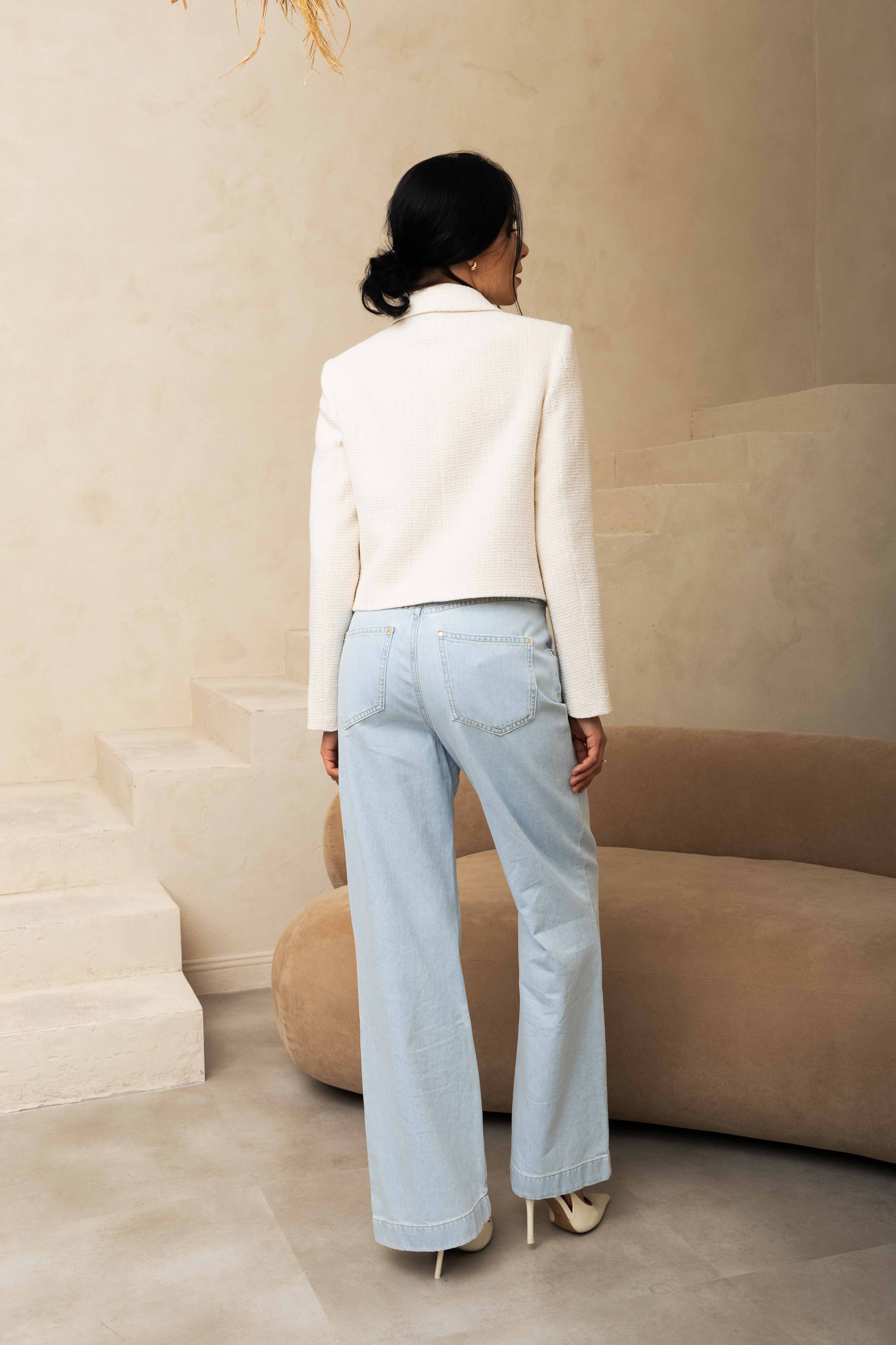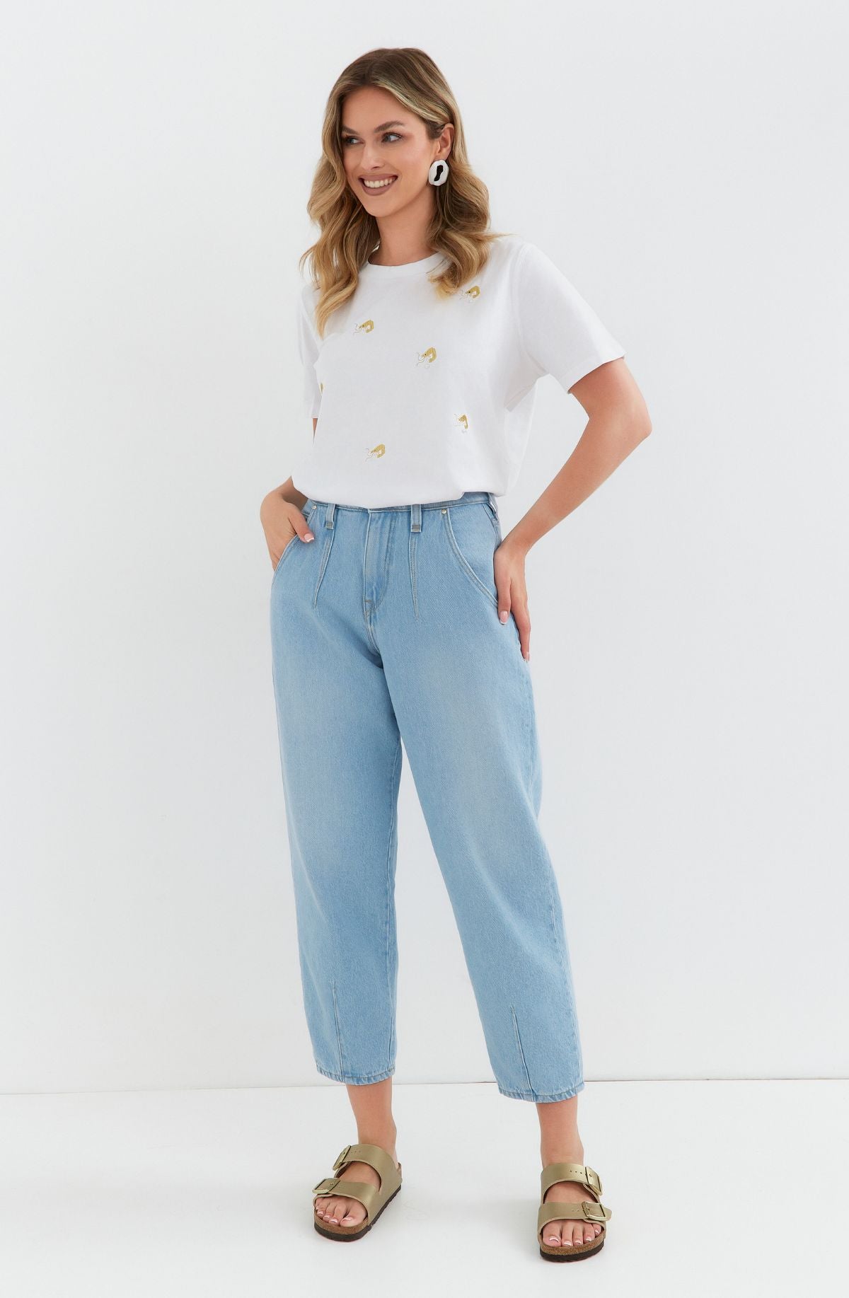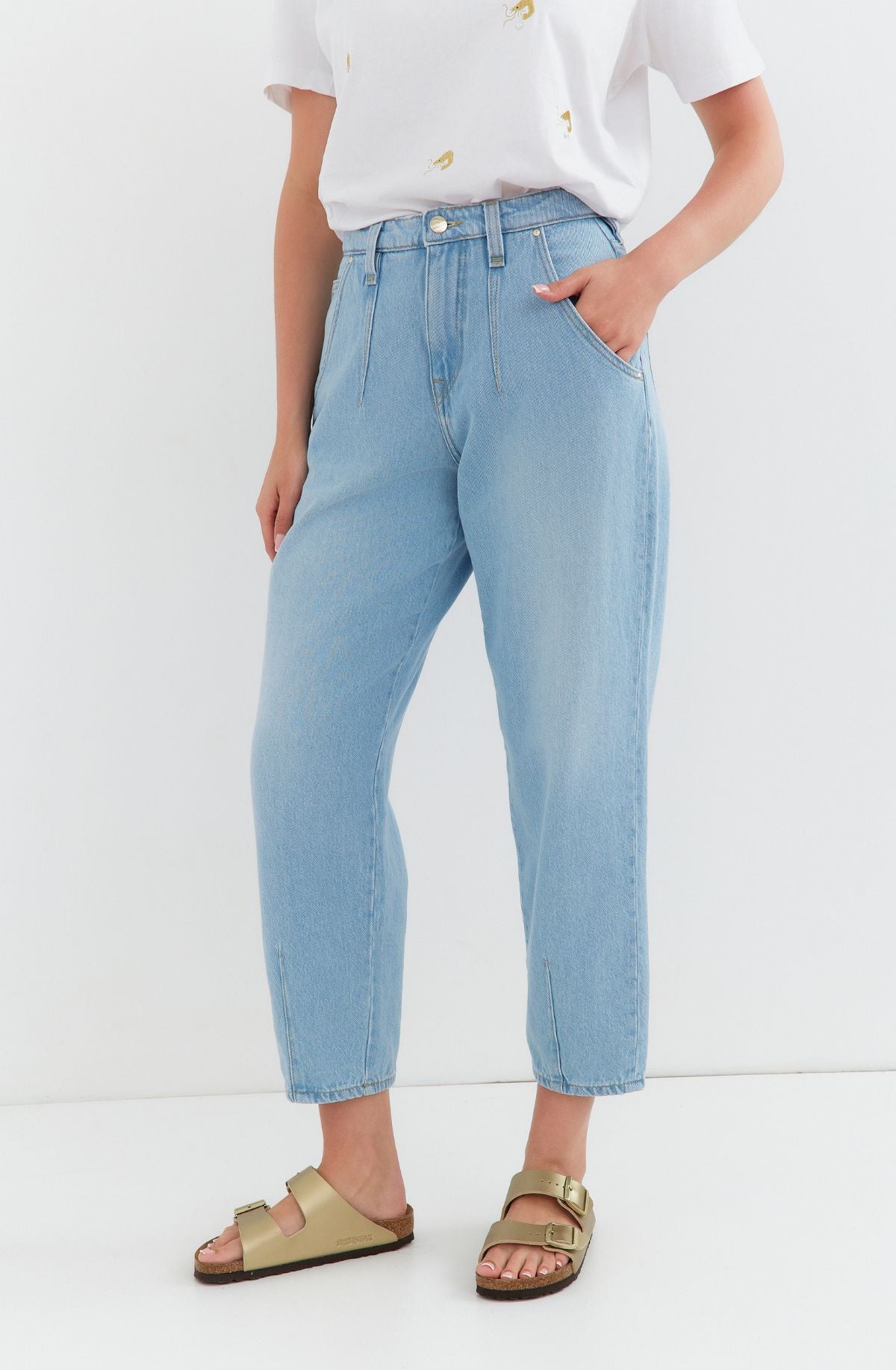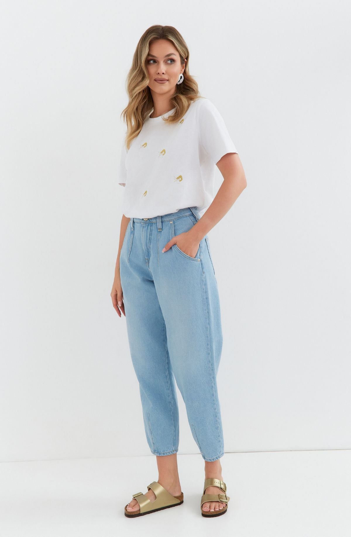 High waist, wide leg jeans made of heavenly soft fabric in light blue colour. High waist. Our Model is 172 cm tall and wears size S.