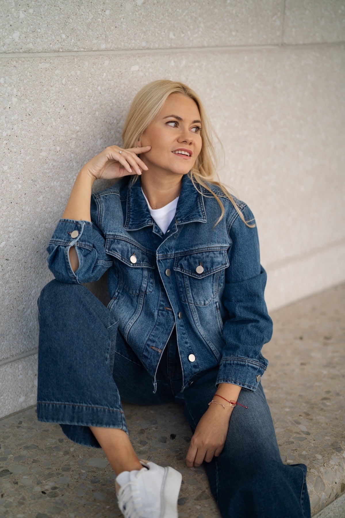 Zupełnie nowy fason w naszej gamie modelowej, który będzie Ci służył przez cały rok. Denimowa kurtka wykonana z wyjątkowo miękkiego materiału, który gwarantuje komfort przez cały dzień. Kurtka o luźniejszym kroju sprawdzi się jako lżejsza kurtka w cieplejsze dni i będzie idealnie łączyć się z naszymi jeansami, bądź z letnimi sukienkami. Ozdobne guziki w złotym kolorze nadają jej charakteru i sprawiają, że kurtka ma w sobie „to coś”. Modelka ma 170 cm wzrostu i ma na sobie rozmiar S. Rozmiar wypada standardowo.