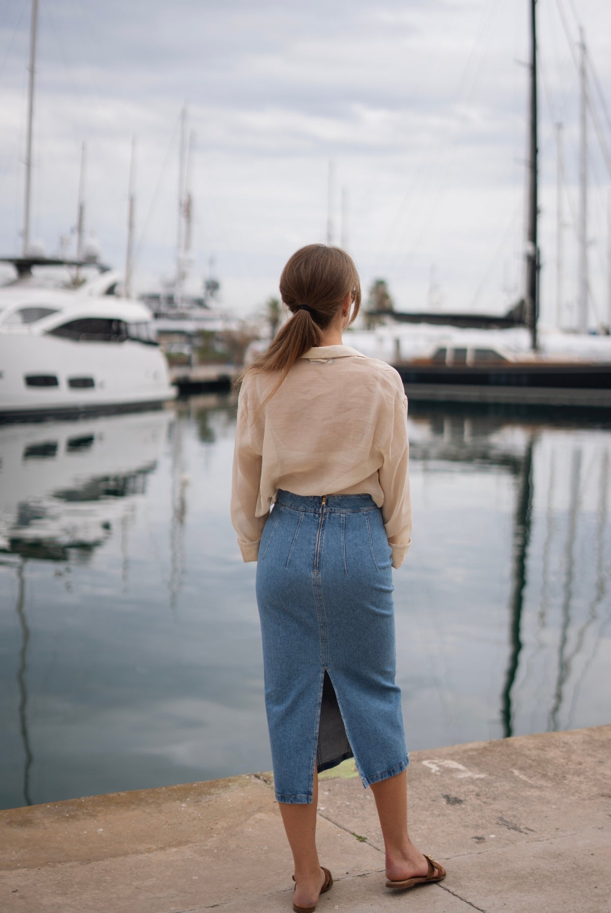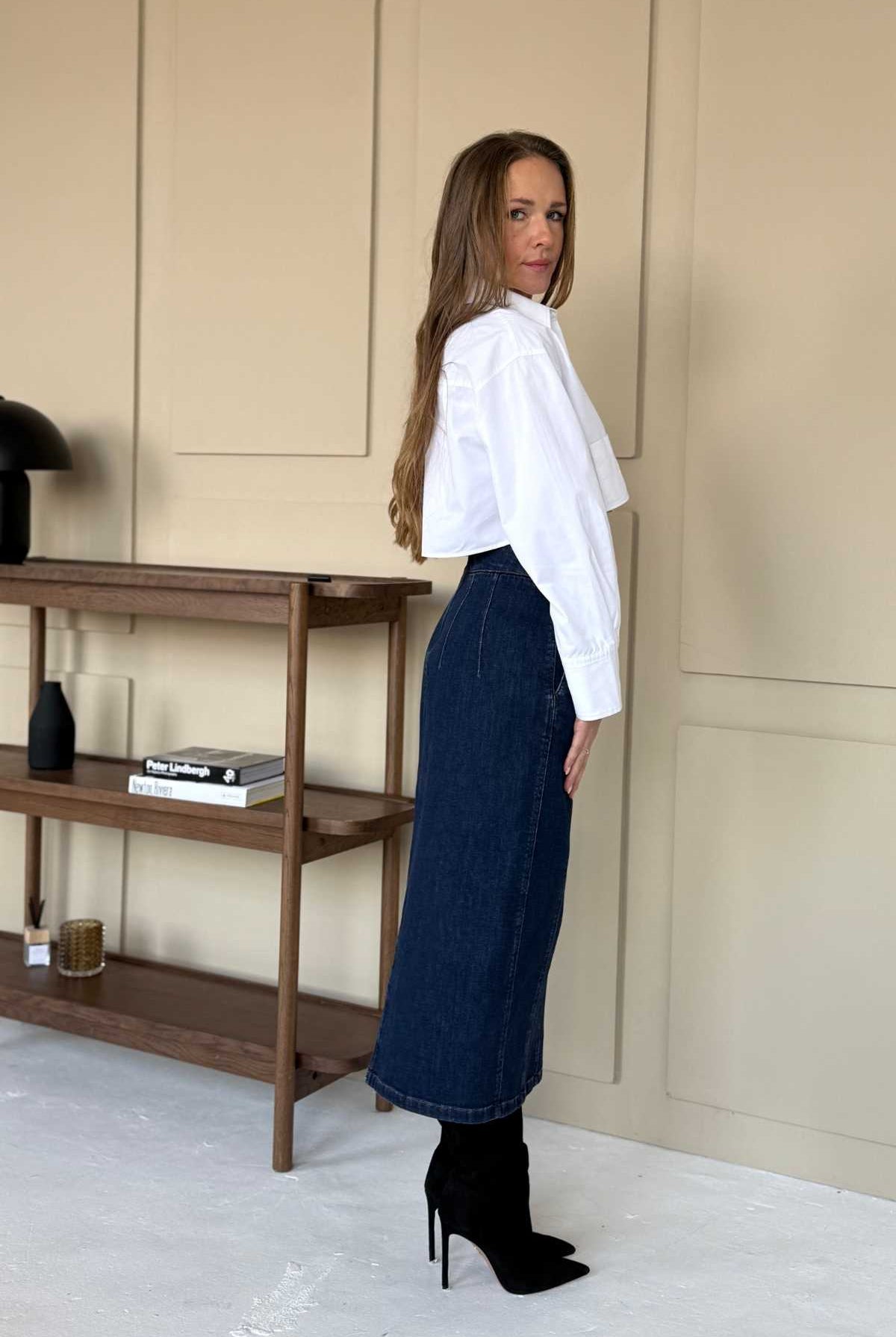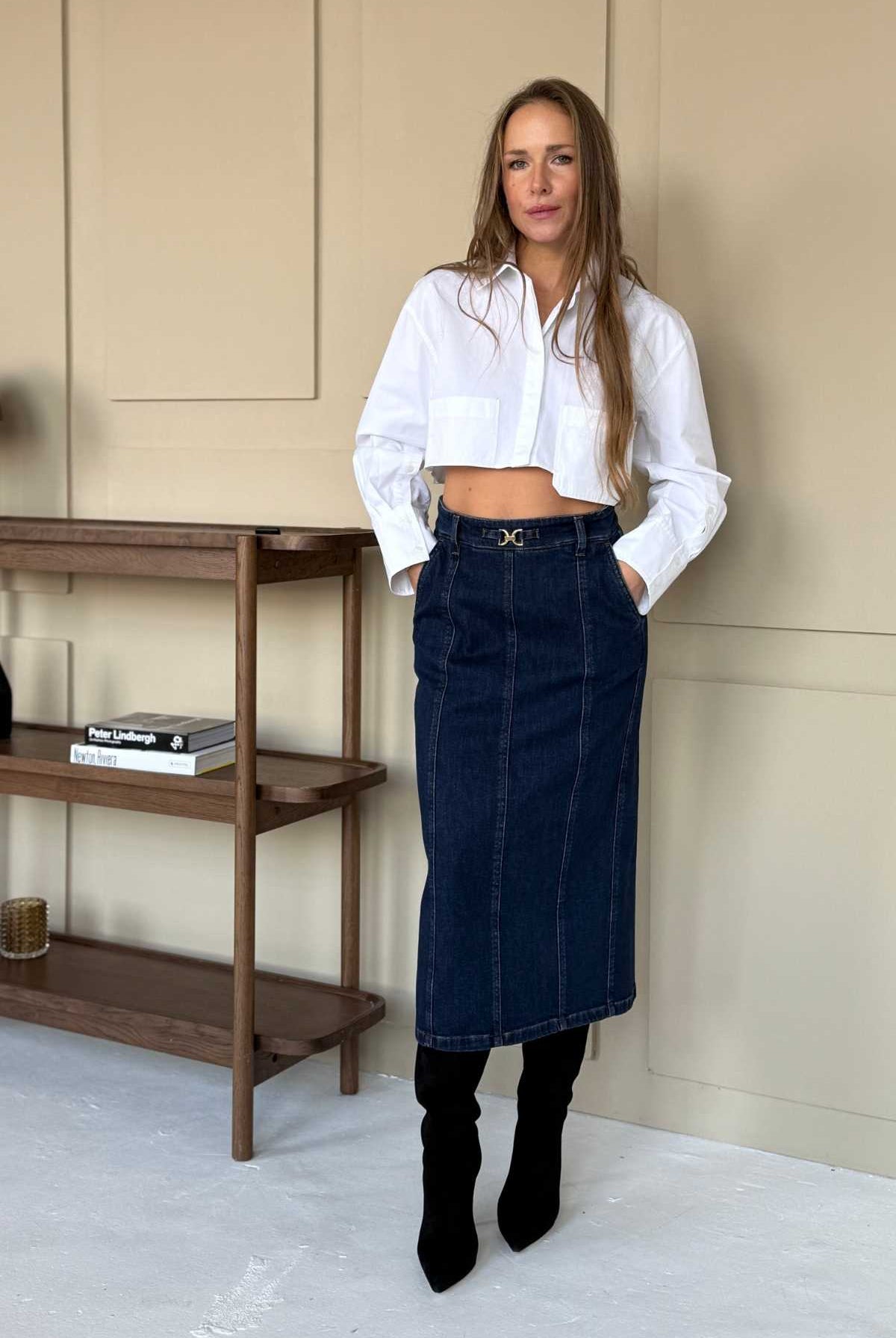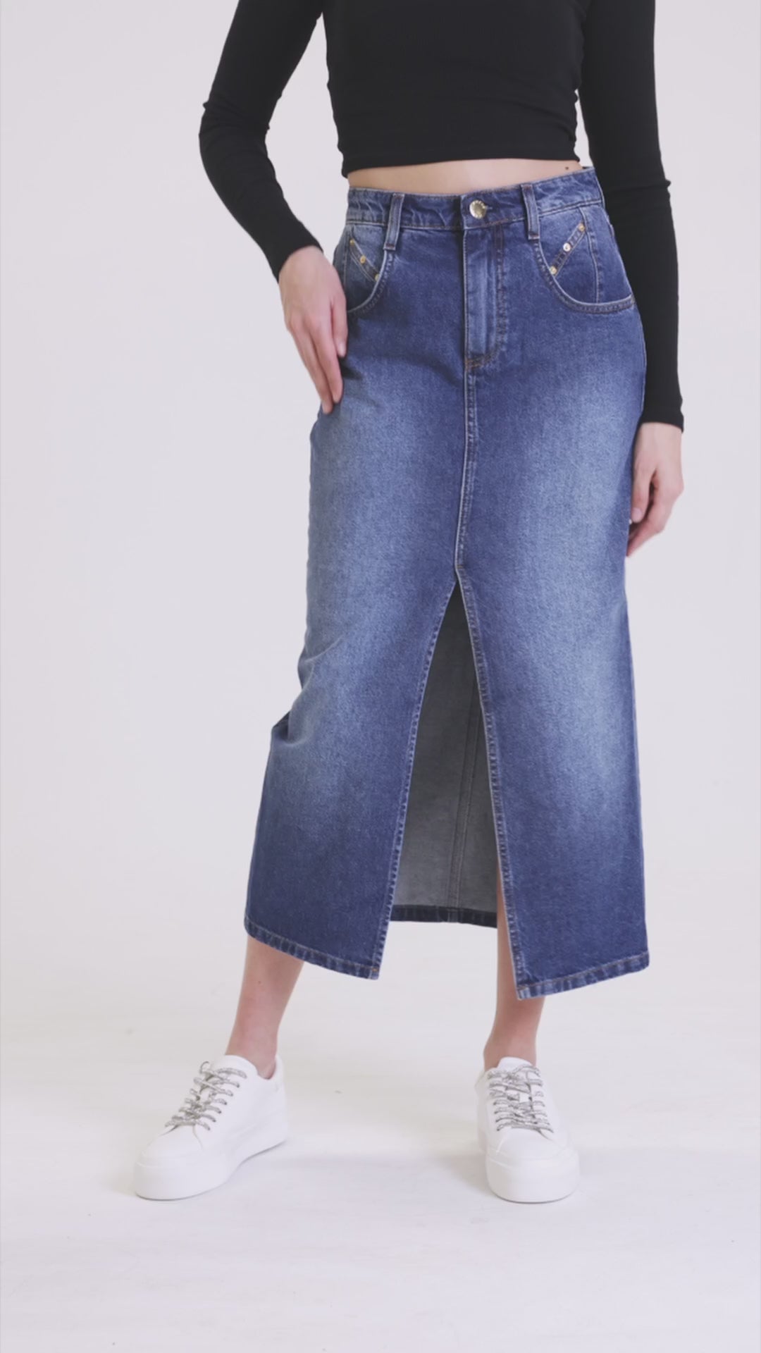 Długa spódnica z przepięknymi cięciami na przednich kieszeniach, ozdobiona pięknymi logowanymi akcesoriami w złotym kolorze, wykonana z cienkiego, bardzo miękkiego w dotyku 100% bawełnianego denimu. Pięknie wygląda na każdej sylwetce, niesamowicie wysmukla. Nasza modelka ma 170 cm wzrostu i ma na sobie rozmiar S.