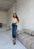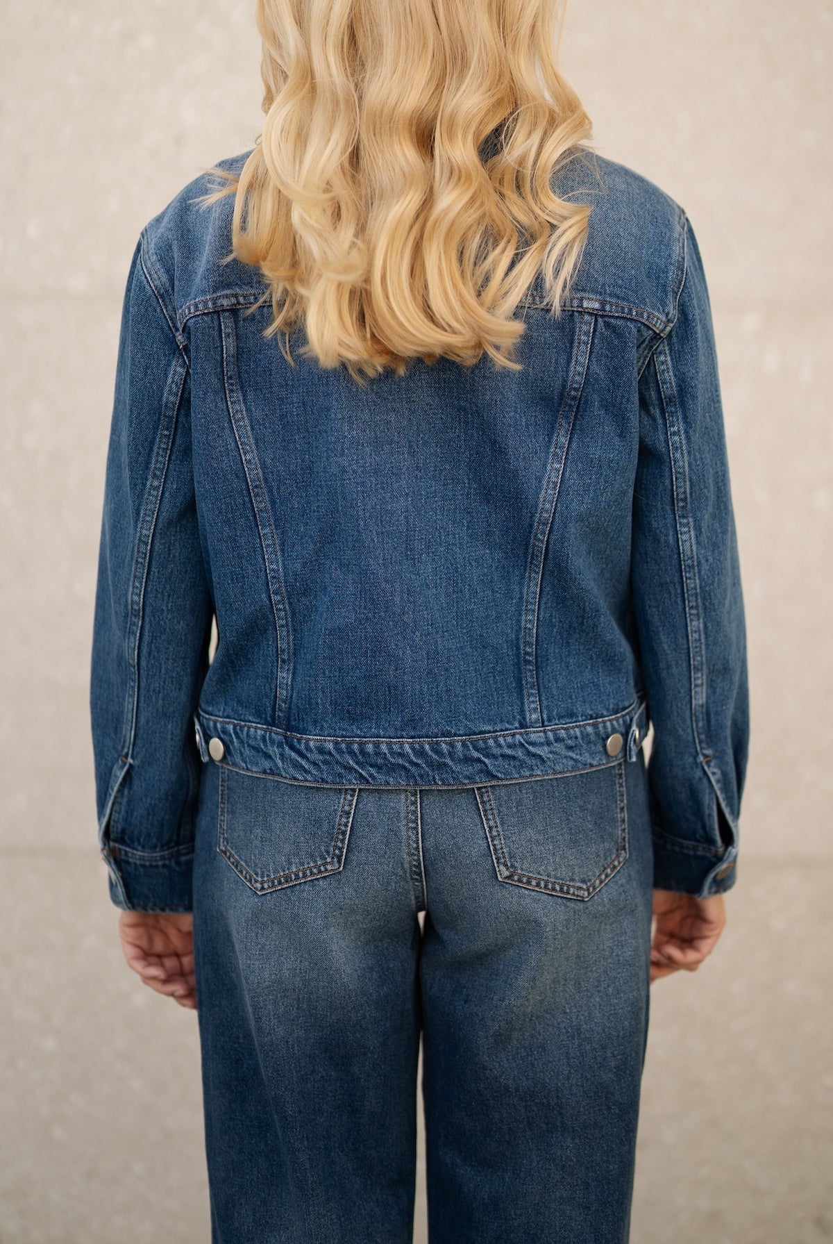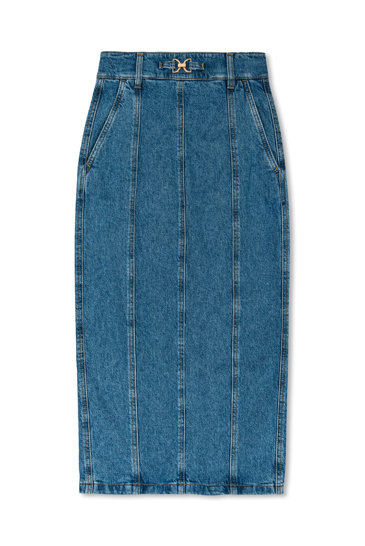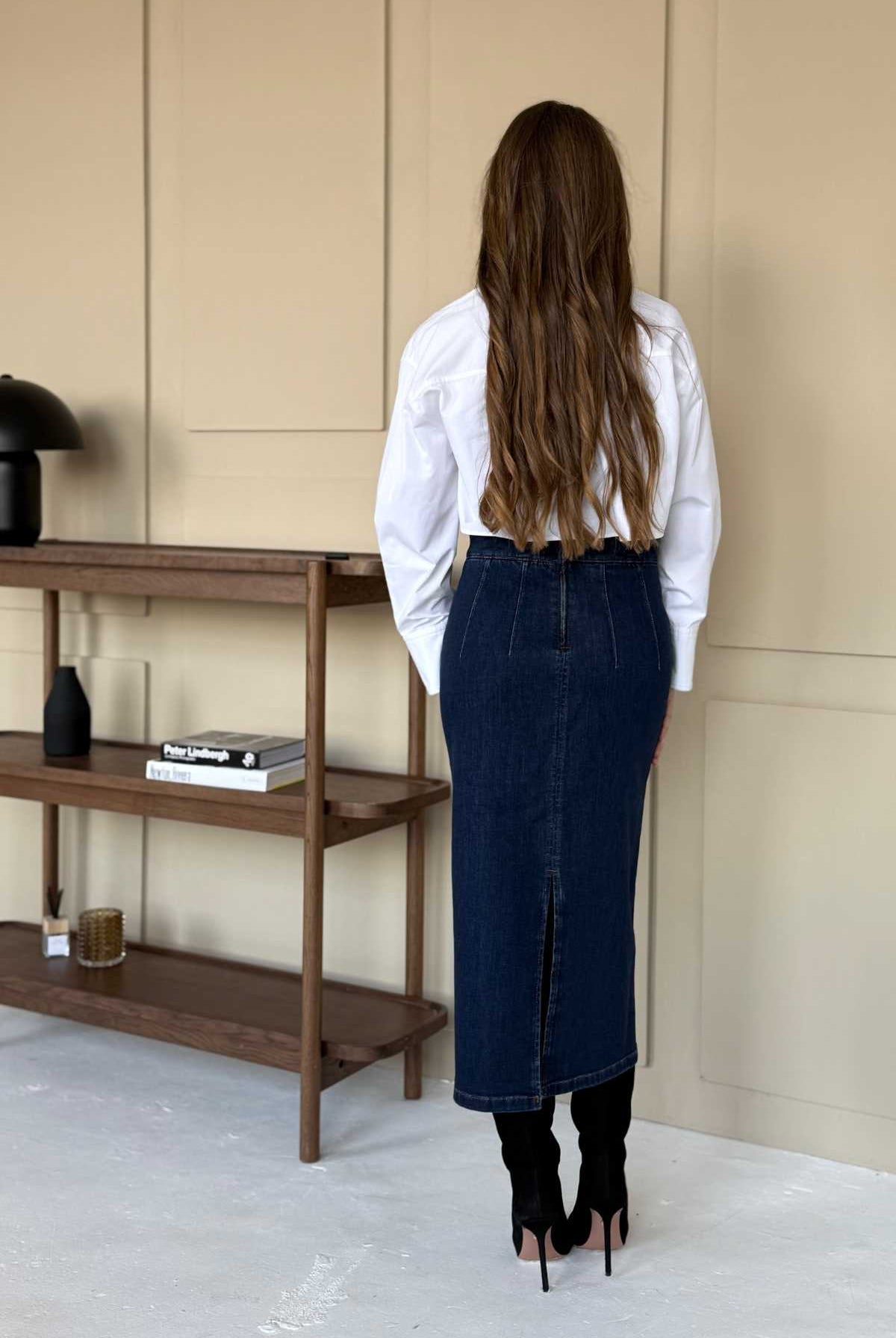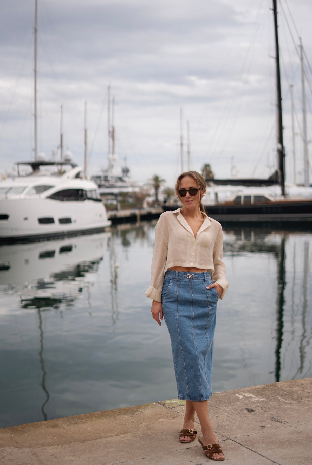 Długa spódnica z przepięknymi cięciami na przednich kieszeniach, ozdobiona pięknymi logowanymi akcesoriami w złotym kolorze, wykonana z cienkiego, bardzo miękkiego w dotyku 100% bawełnianego denimu. Pięknie wygląda na każdej sylwetce, niesamowicie wysmukla. Nasza modelka ma 170 cm wzrostu i ma na sobie rozmiar S.