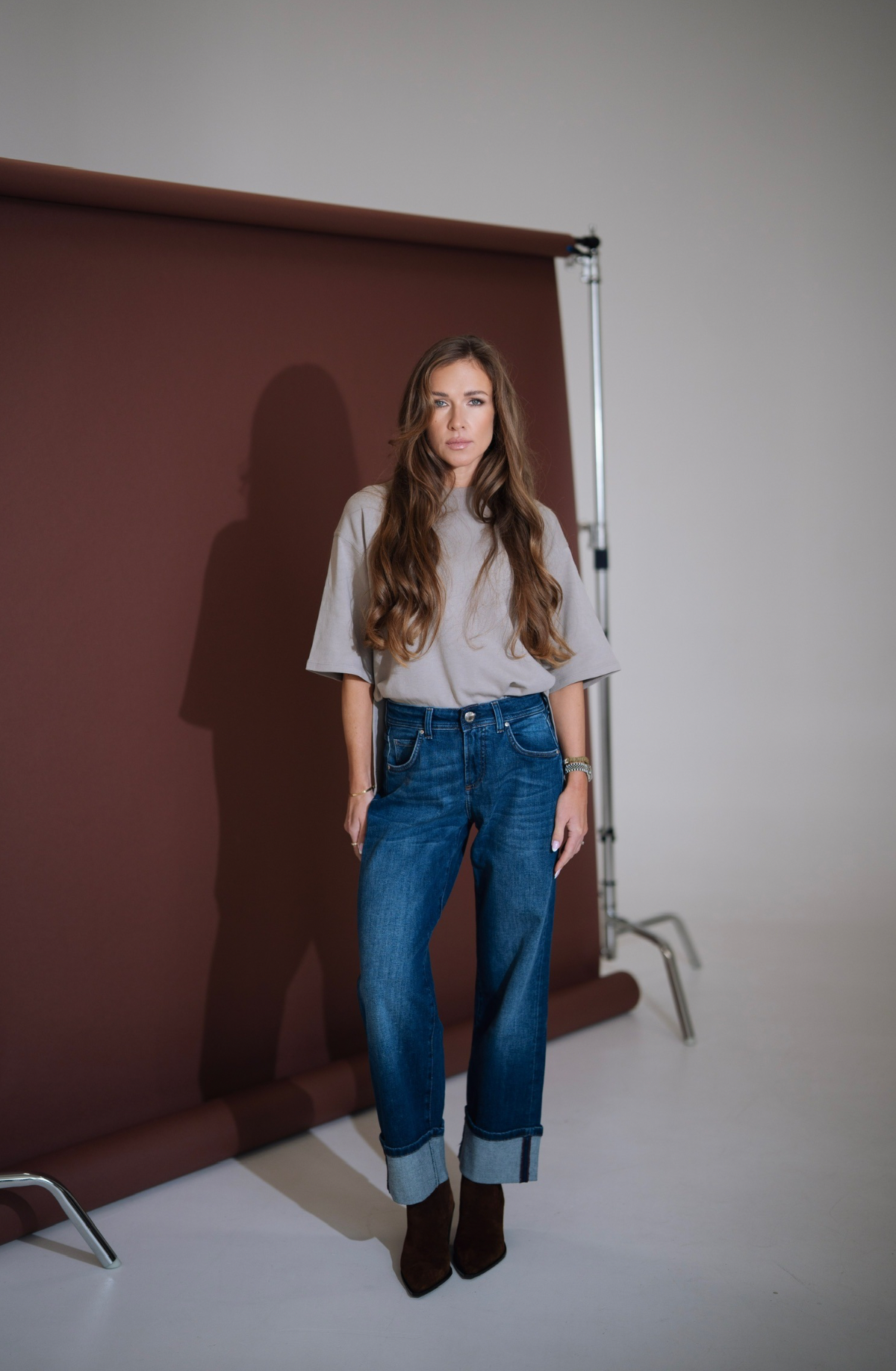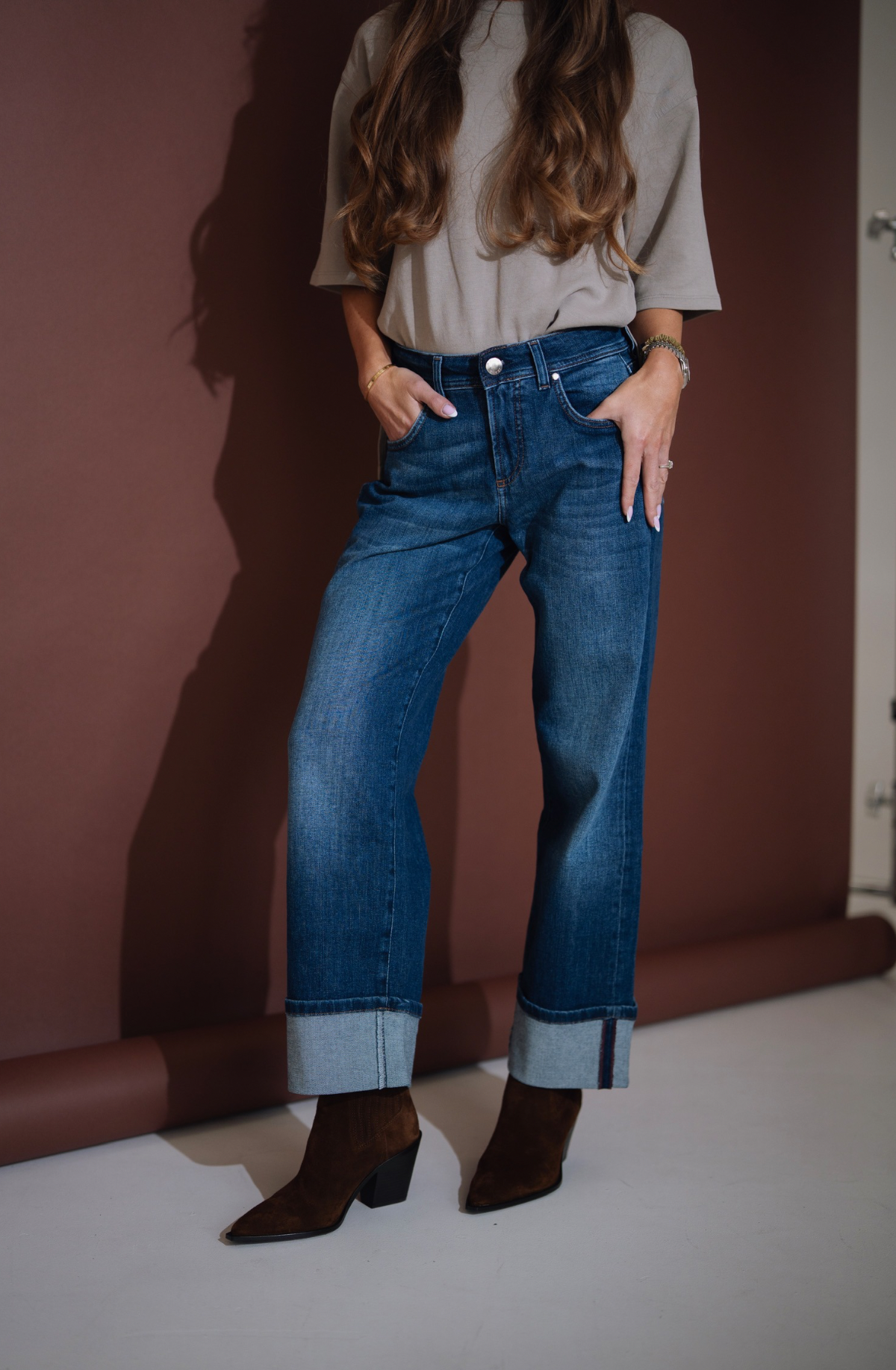 Jeansy idealne, a dlaczego? Jak każde z naszych produktów są niezwykle komfortowe, przepięknie prezentują się na każdym rozmiarze, mają bardzo nowoczesny fason i do tego ponadczasowy klasyczny denimowy kolor. Model AMBER jest zbliżony fasonem do modelu LUCY, ma średni stan, prostą, lekko szerszą nogawkę zakończoną szerokim mankietem, który jest zamocowany bokami. Przepiękny bordowy kolor nitki współgra z wykończeniem środka jeansów i z obecnymi trendami. Materiał jest lekko elastyczny, naddający się. Klasyczny granatowy kolor jeansu idealnie wpasuje się w obecne trendy i będzie stanowić podstawę wielu stylizacji. Ela ma 170cm wzrostu i ma na sobie rozmiar S, a Karolina ma 165cm wzrostu i ma na sobie rozmiar 3XL. Rozmiar wypada standardowo.