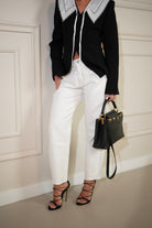 Letnia odsłona naszego bestselleru ANNA w białym kolorze. Spodnie o fasonie w literę „O” ze średnim stanem i cięciem na przodzie, które poza optycznym wyszczupleniem ma funkcję stabilizacji brzuszka. Nogawki są szerokie w udzie oraz lekko zawężone ku dołowi poprzez zastosowanie zaszewek. Są wykonane z miękkiego i „lejącego się” denimu, który w swoim składzie ma Lyocell. Ela ma 170cm wzrostu i ma na sobie rozmiar S.