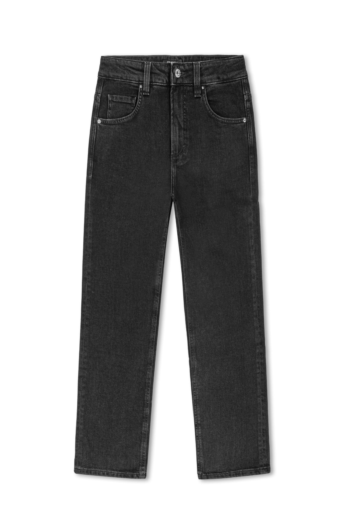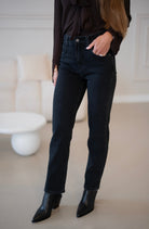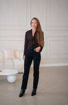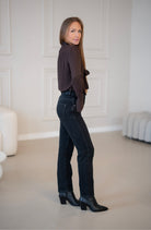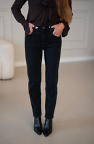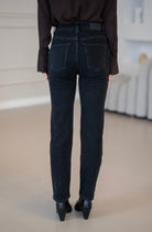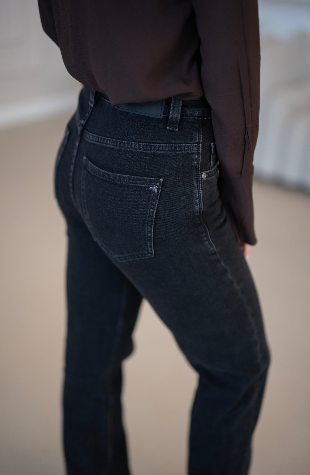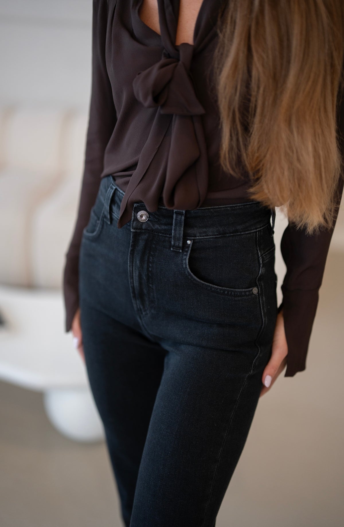 Bestselling LAJA model made of soft denim in beautiful black. The fabric contains "Lycra T400", which not only affects the silkiness, but also makes the pants remain in an unchanged shape during use. The cut of these pants slims the silhouette very much due to the high waist and straight leg. They will perfectly match a white shirt for an elegant styling or when you need pants for a weekend trip with friends. Our model is 170cm tall and is wearing size S/29.