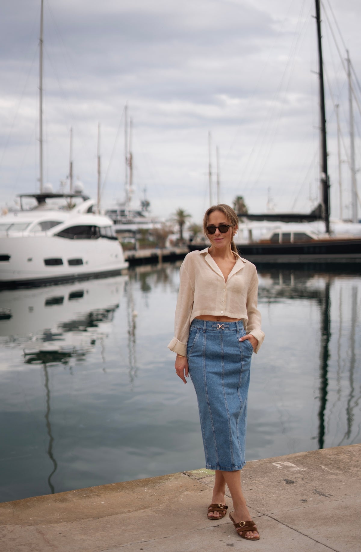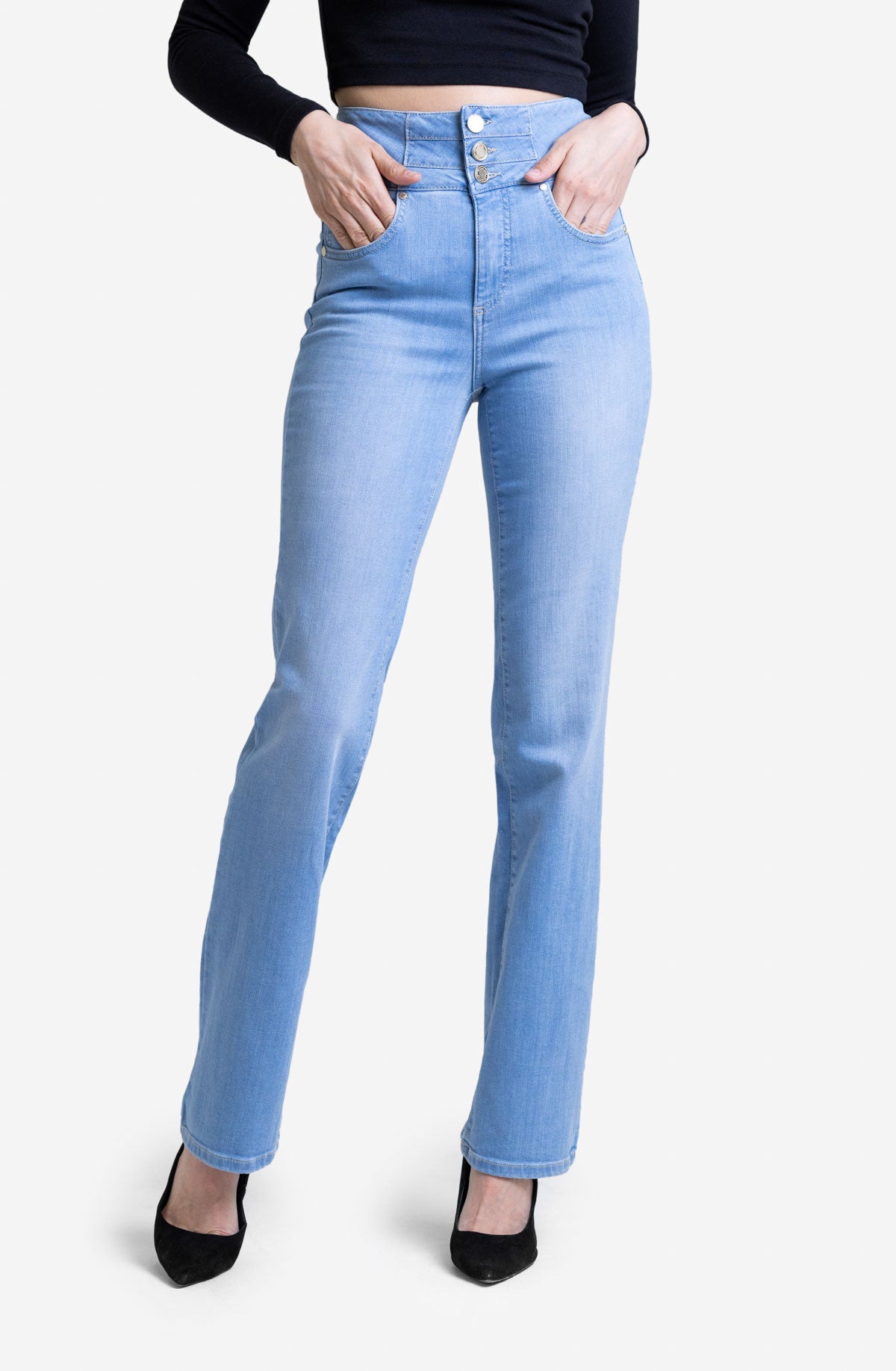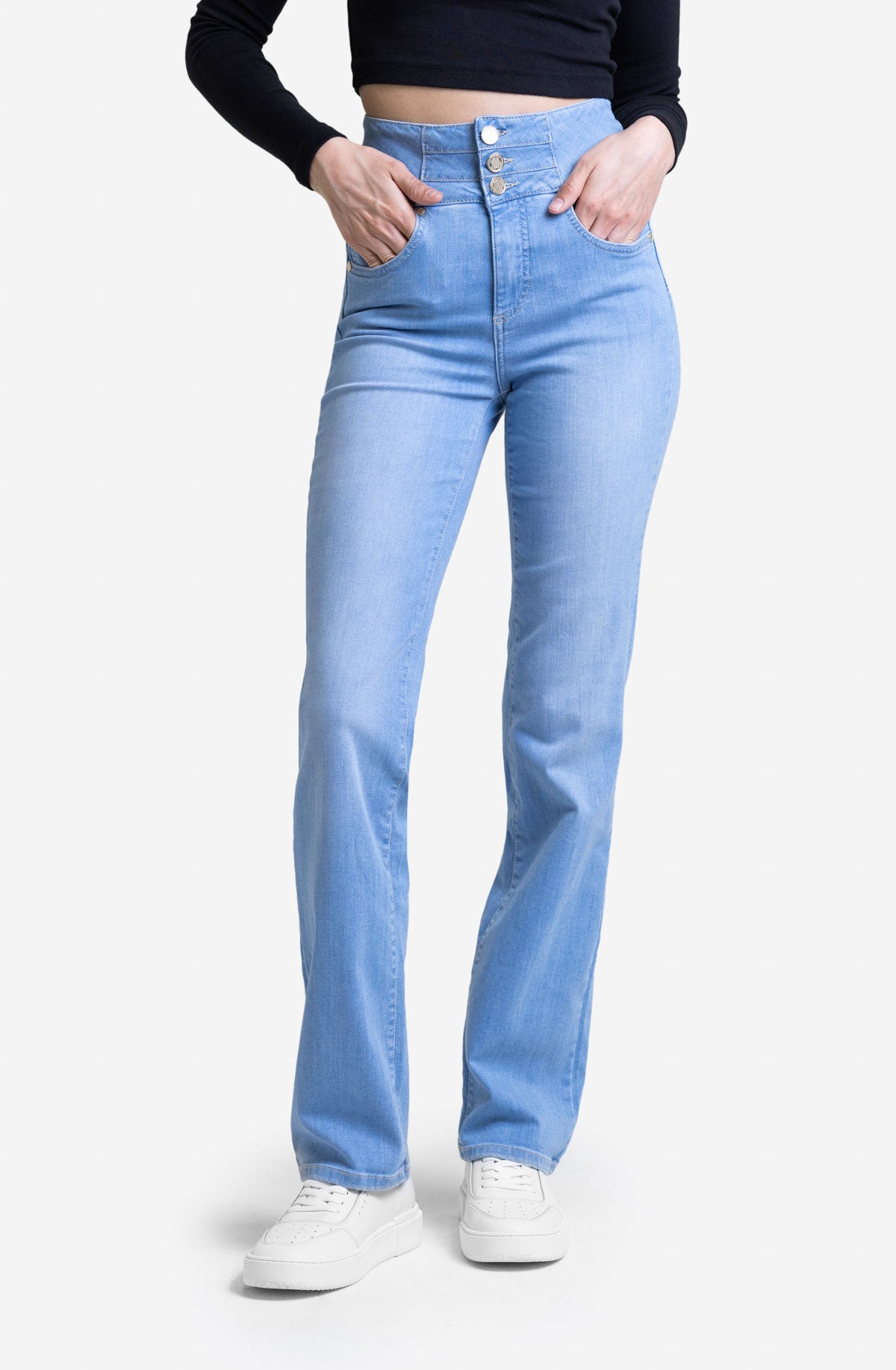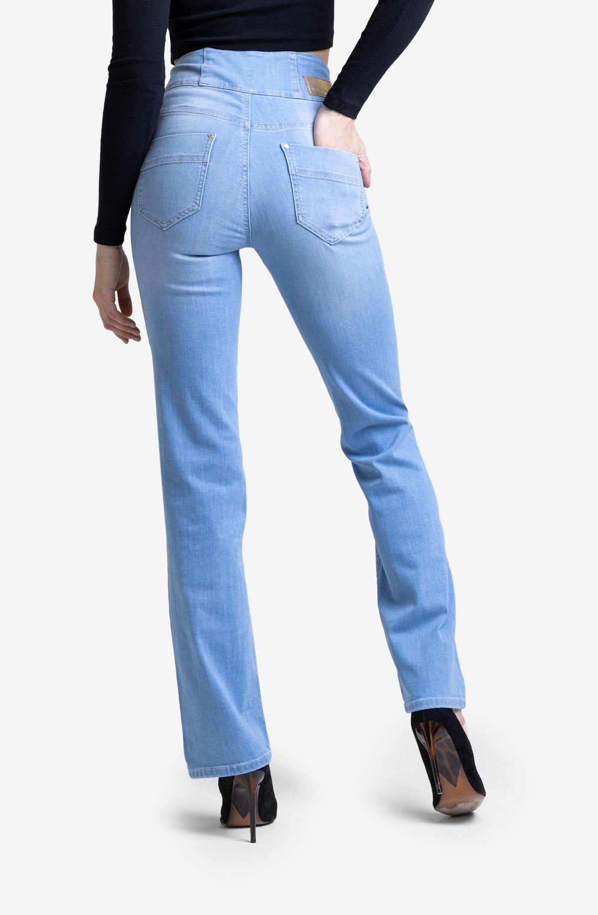 A model of jeans that will wonderfully lengthen the legs and slim the waist. High waist, slightly flared leg look great both with sports shoes and with heels! A beautiful shade of blue is perfect for warmer days. Accessories in the color of cold gold perfectly emphasize the color of the fabric. The model is 172 cm tall and wears size S/32.