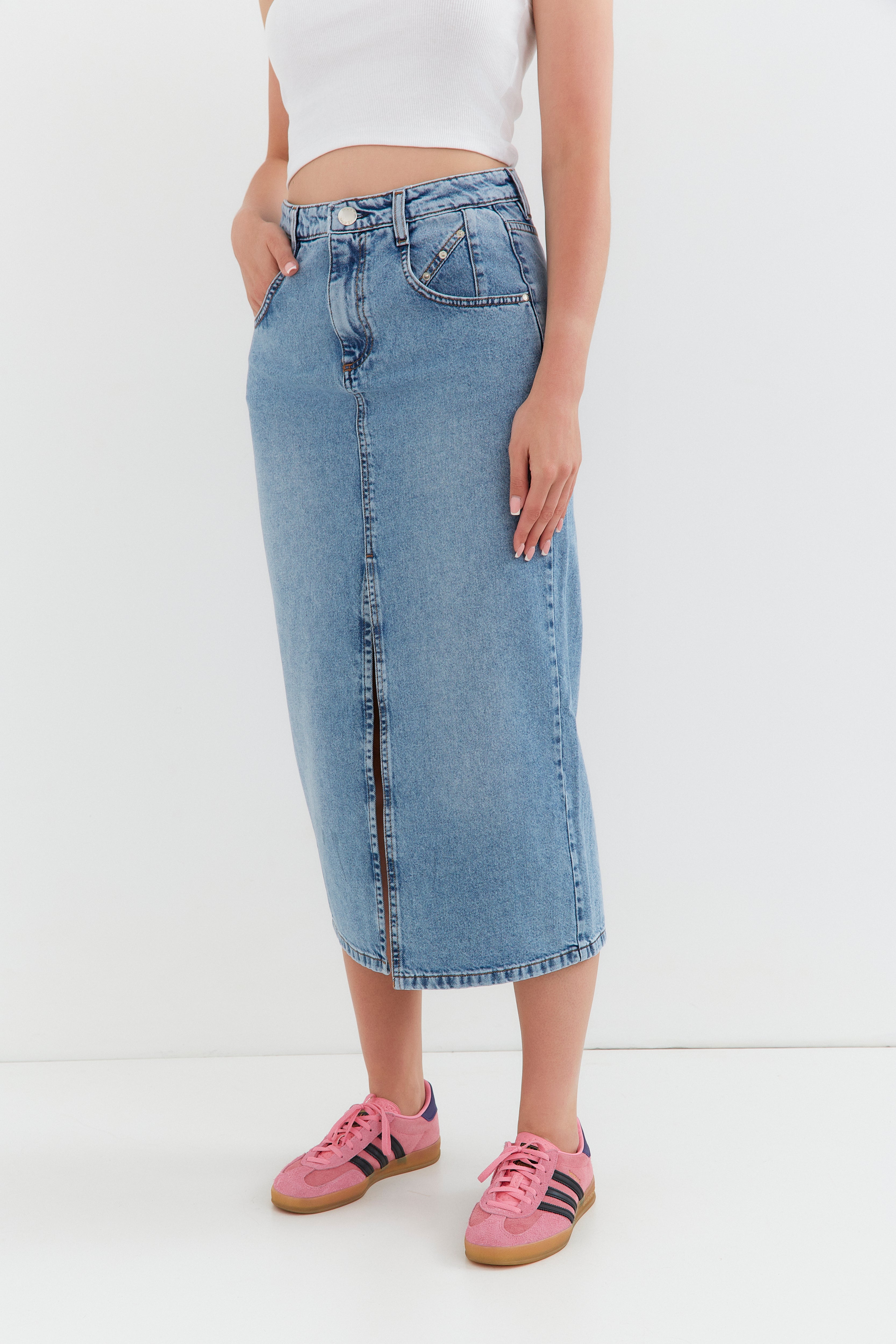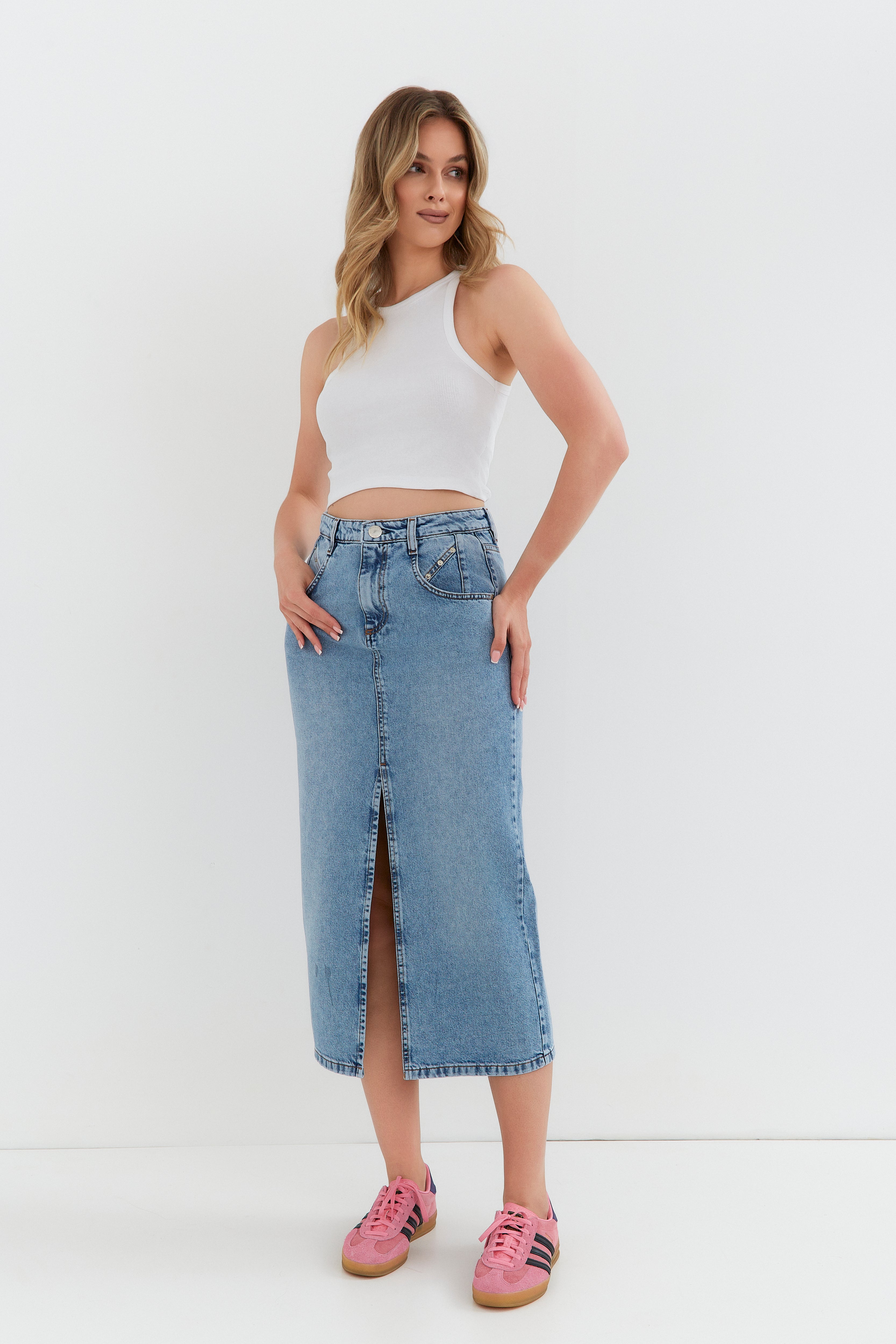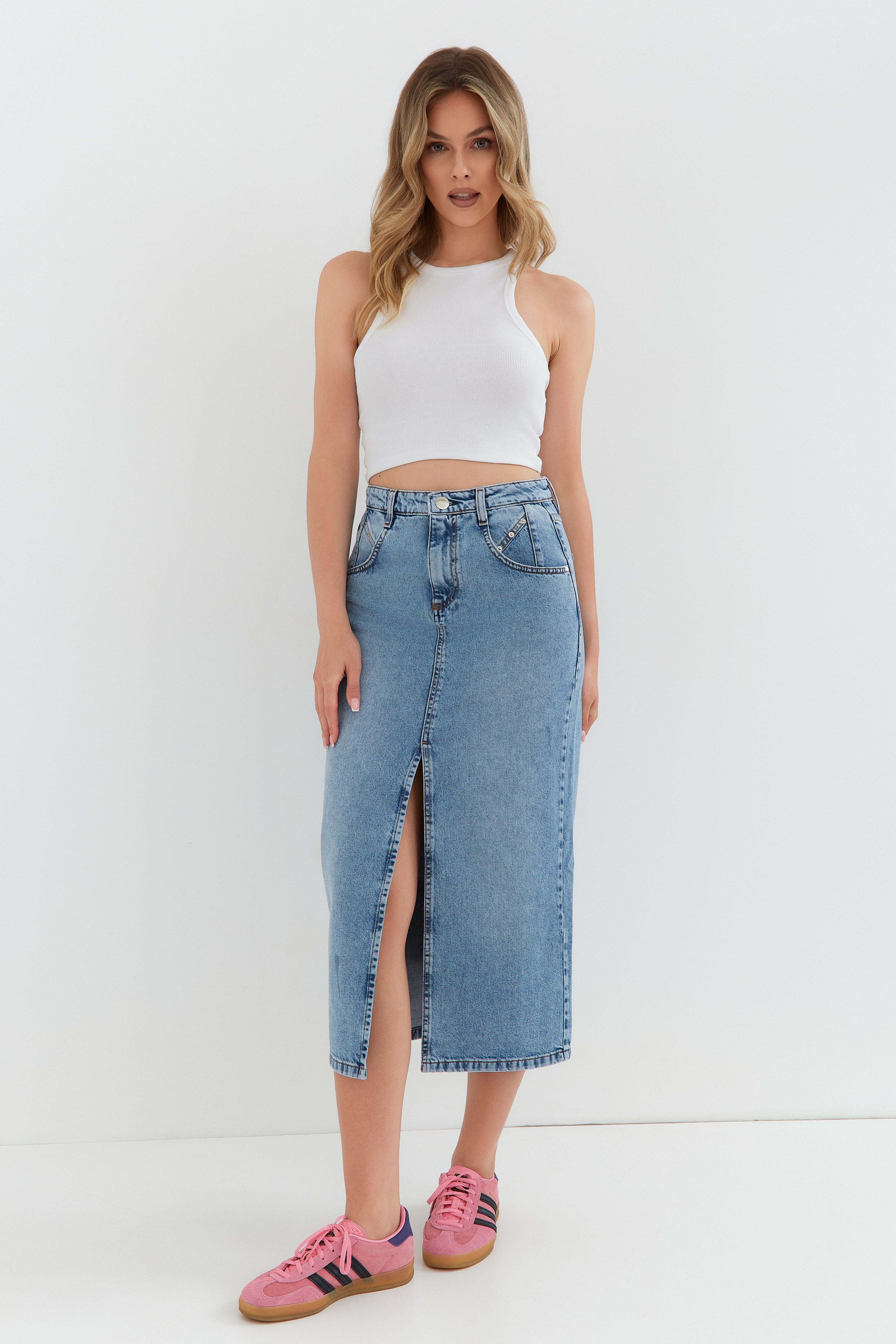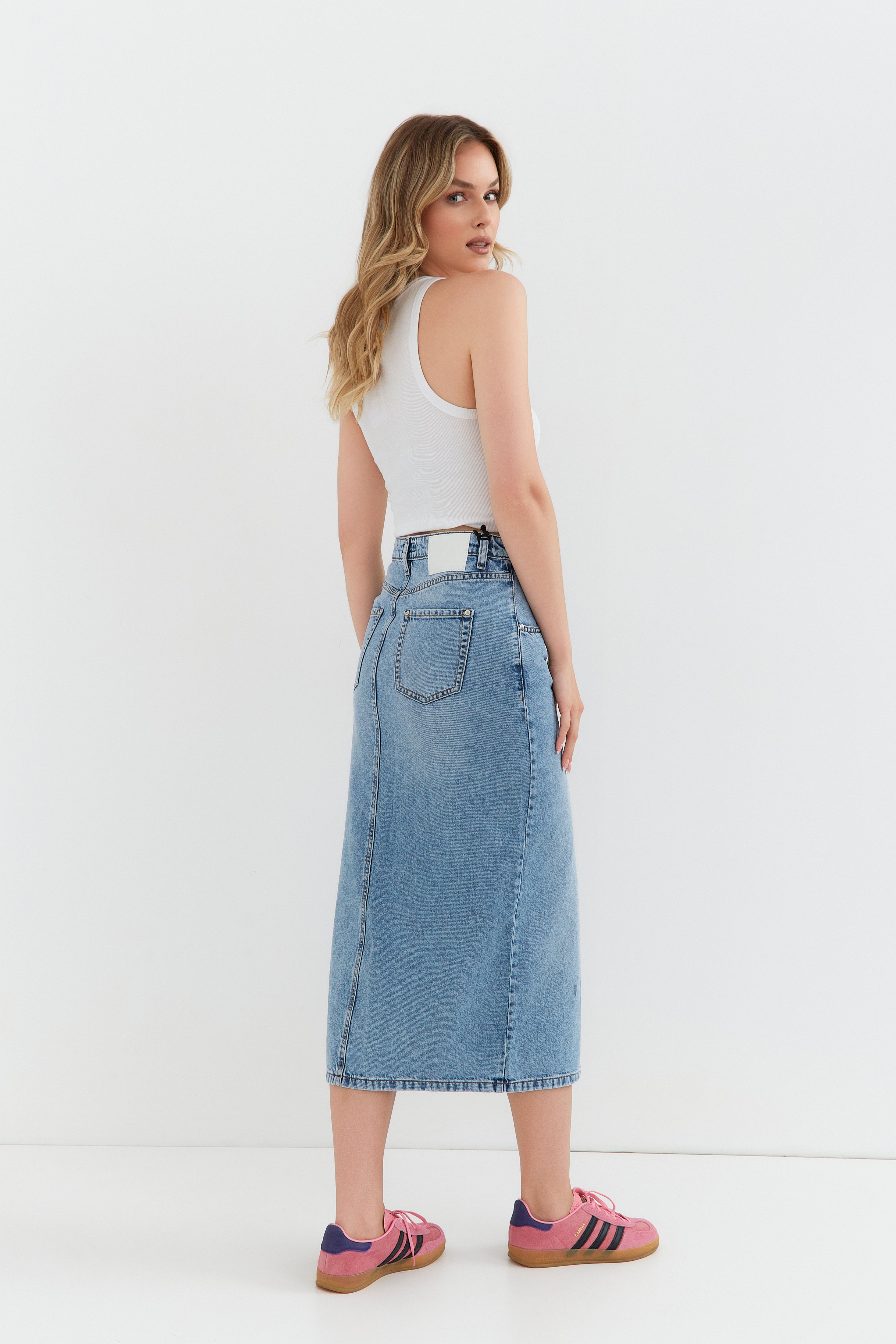 A model of jeans that will wonderfully lengthen the legs and slim the waist. High waist, slightly flared leg look great both with sports shoes and with heels! A beautiful shade of blue is perfect for warmer days. Accessories in the color of cold gold perfectly emphasize the color of the fabric. The model is 172 cm tall and wears size S/32.