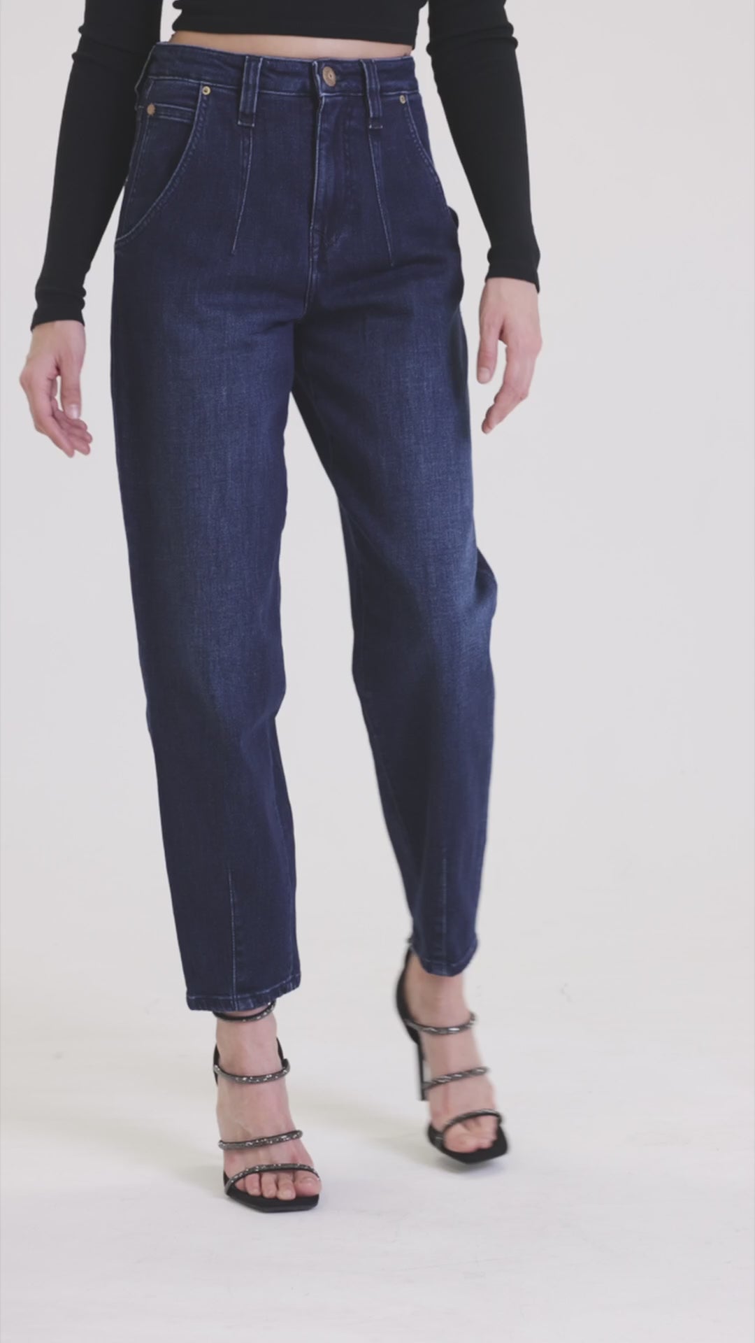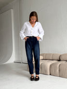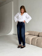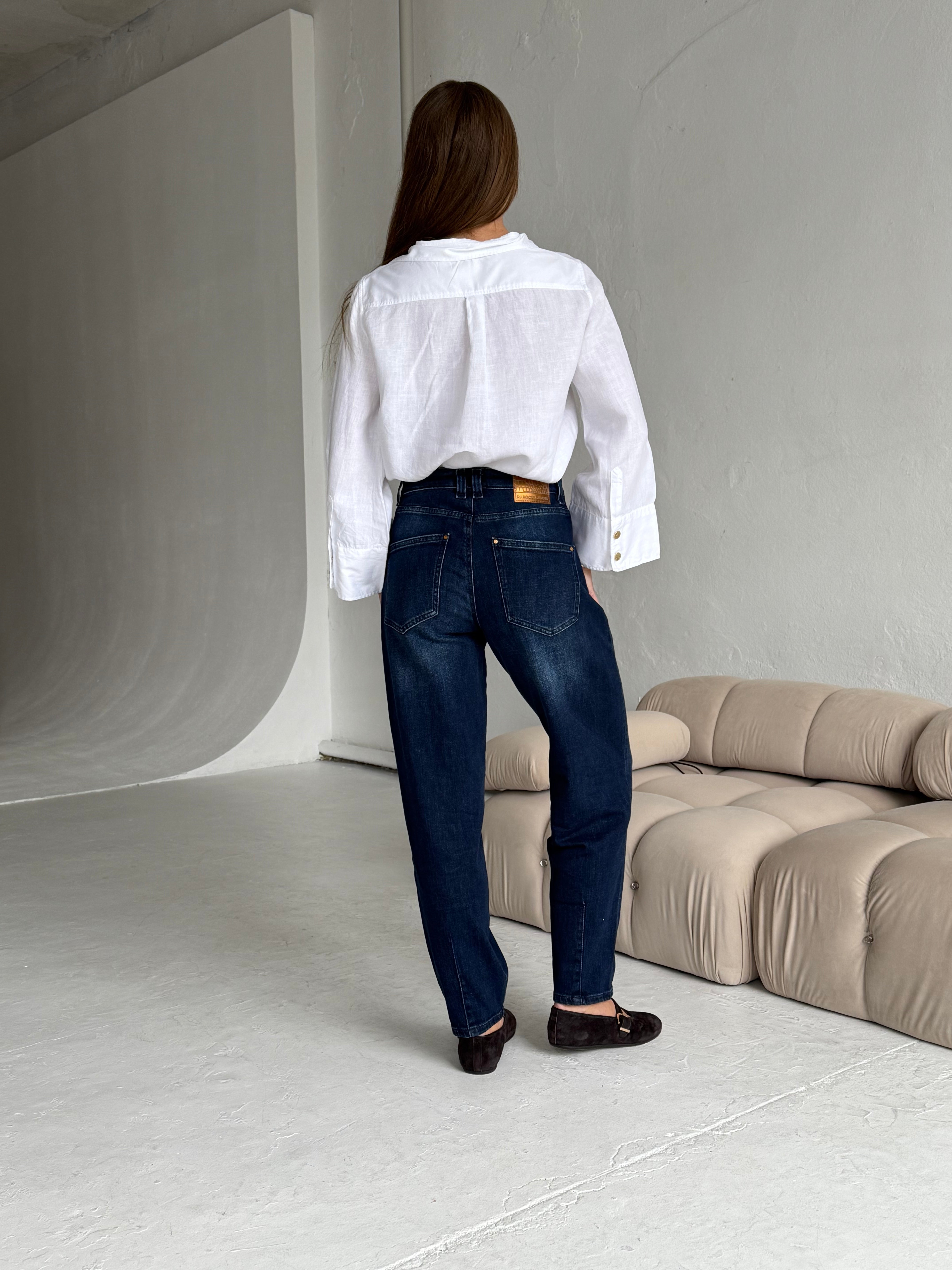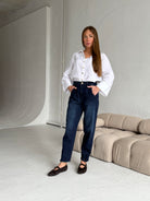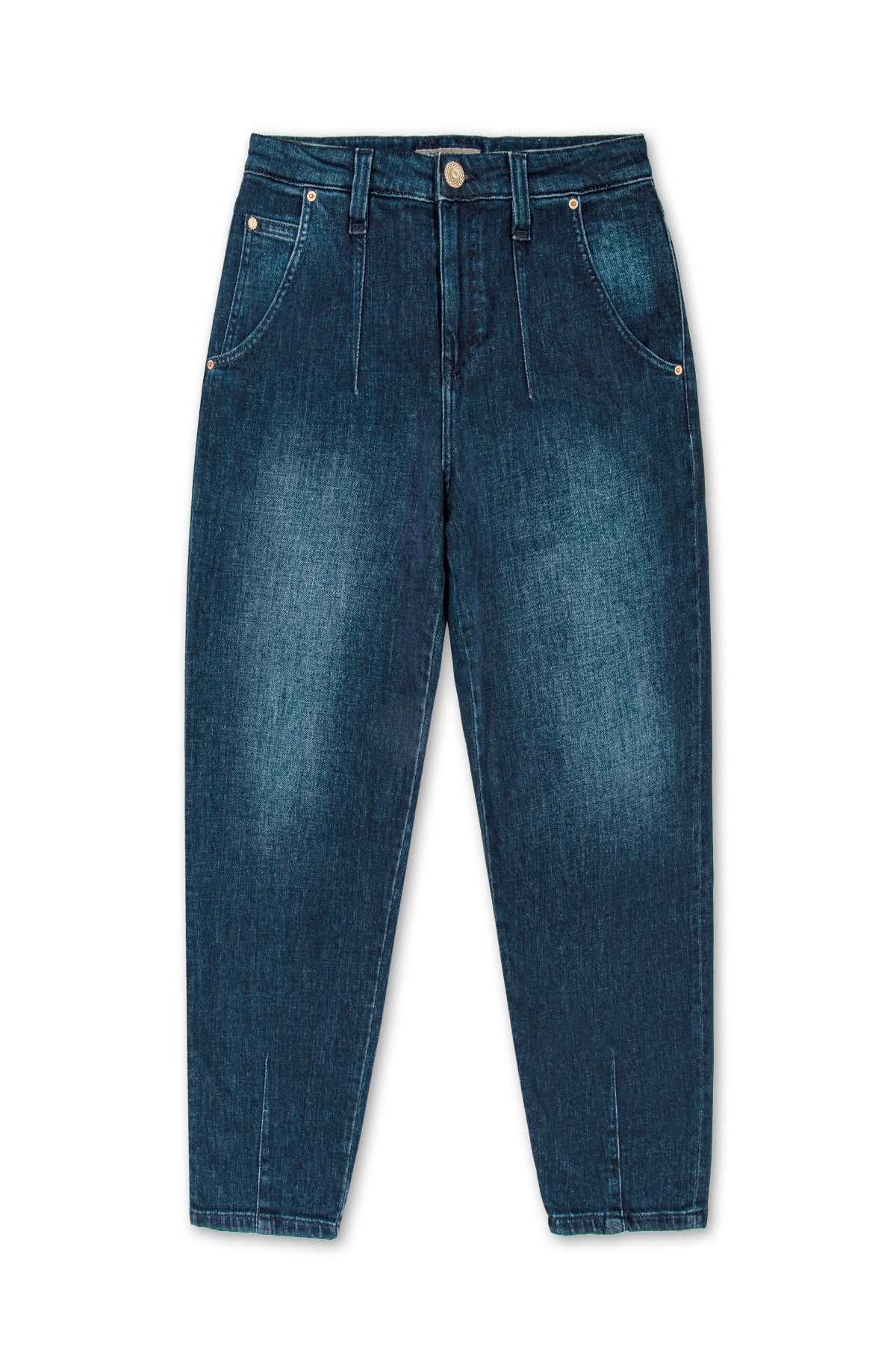 High waist, wide leg jeans made of heavenly soft fabric in blue colour. Medium waist. Our Model is 172 cm tall and wears size S/28.