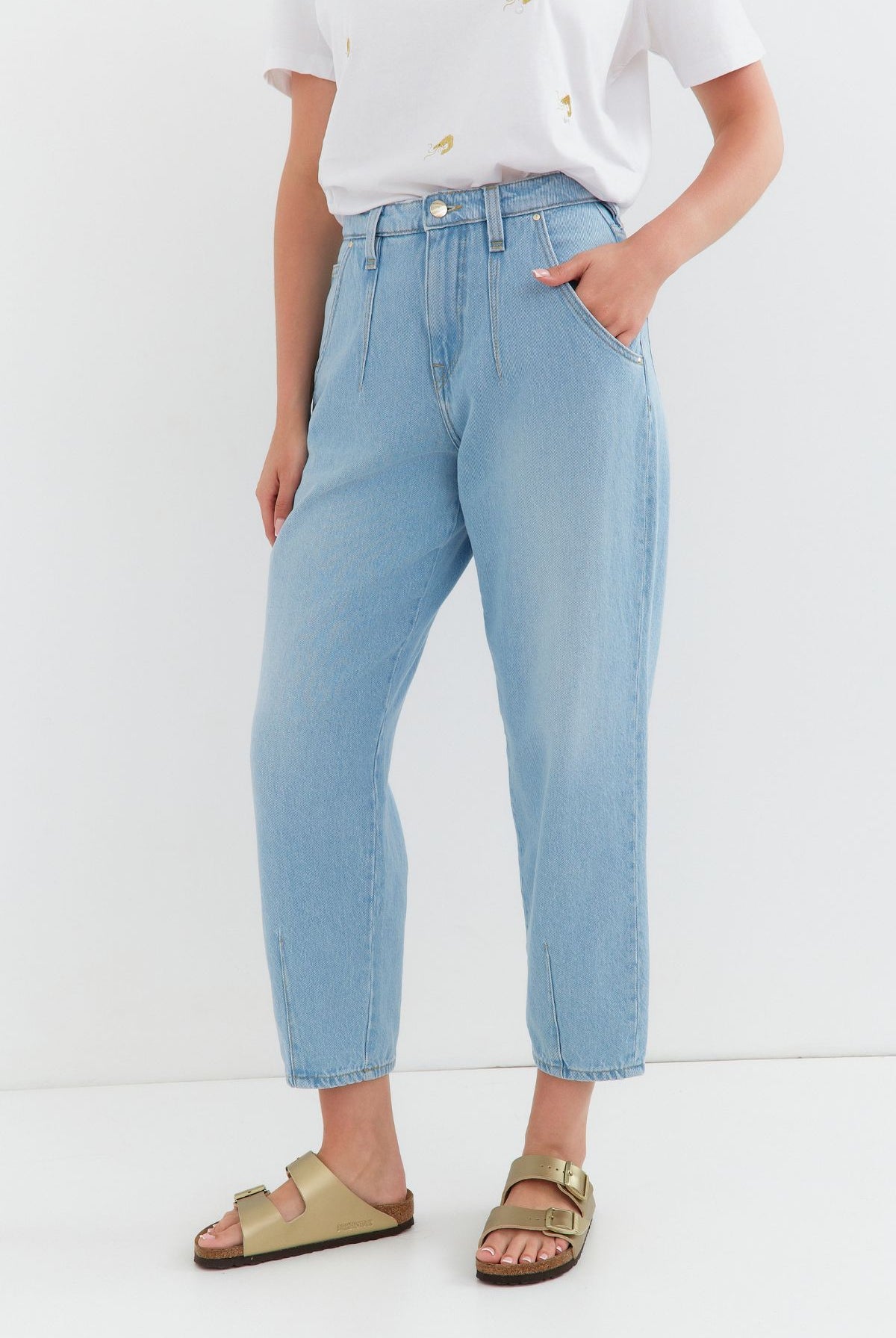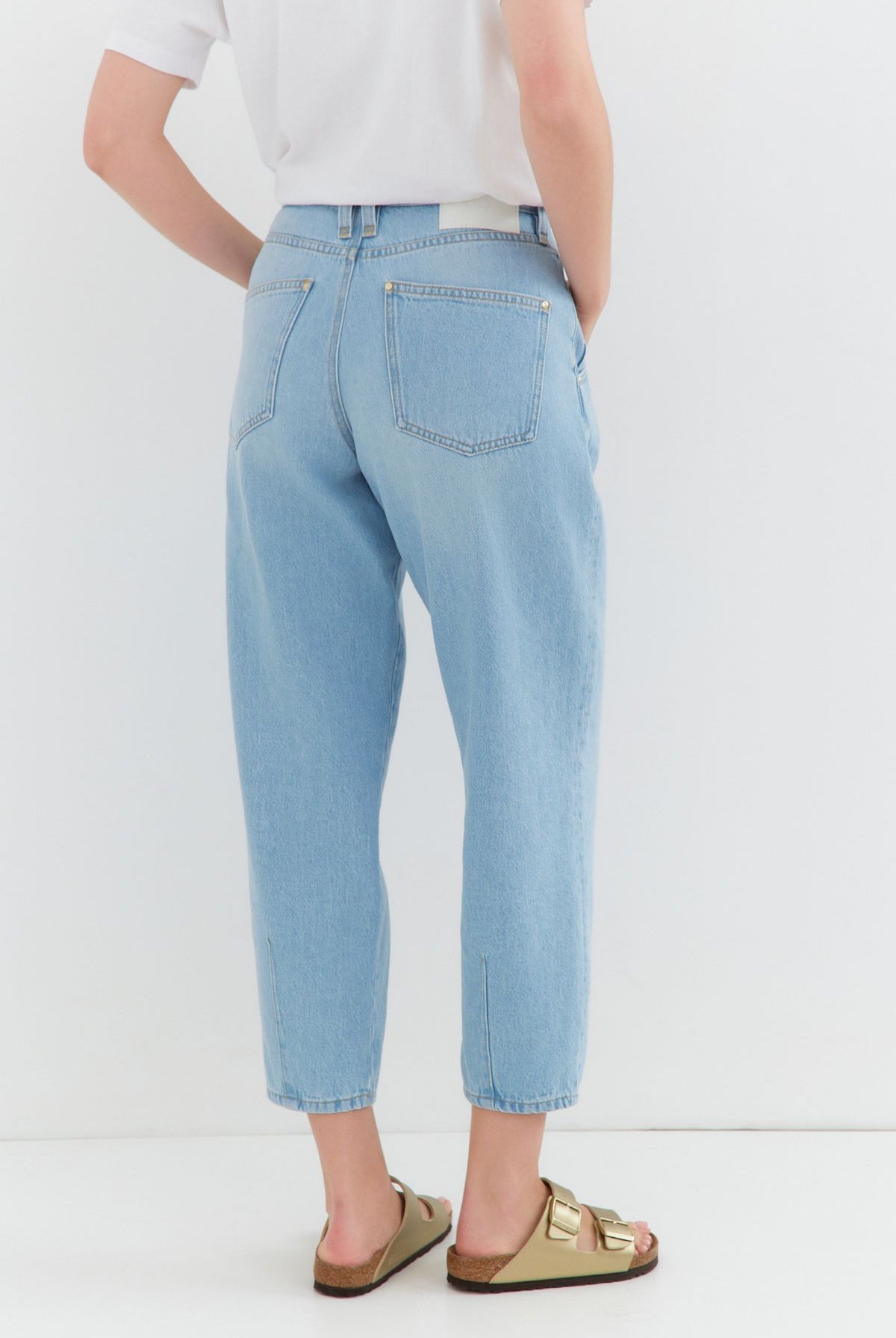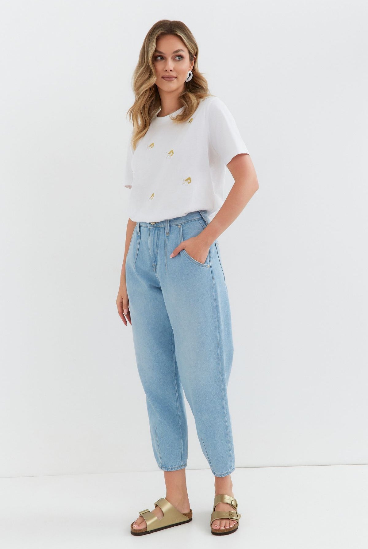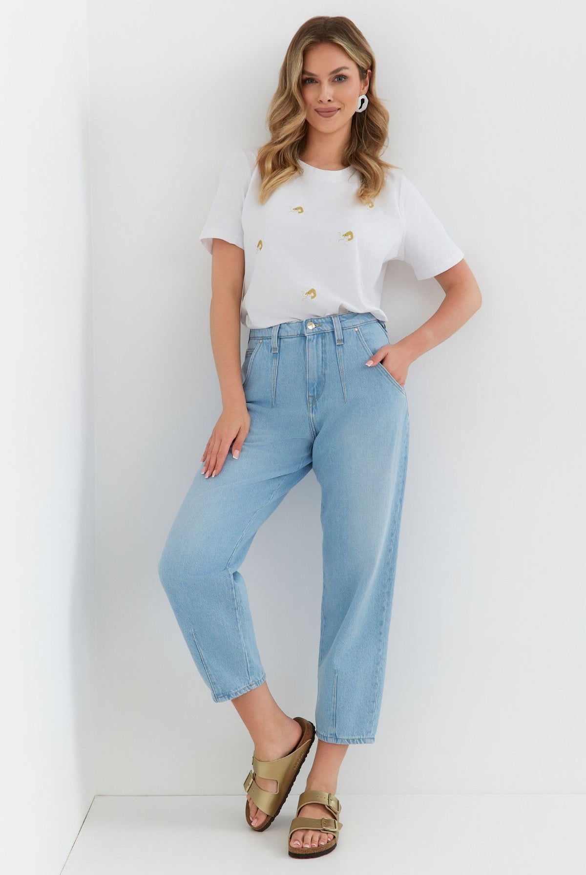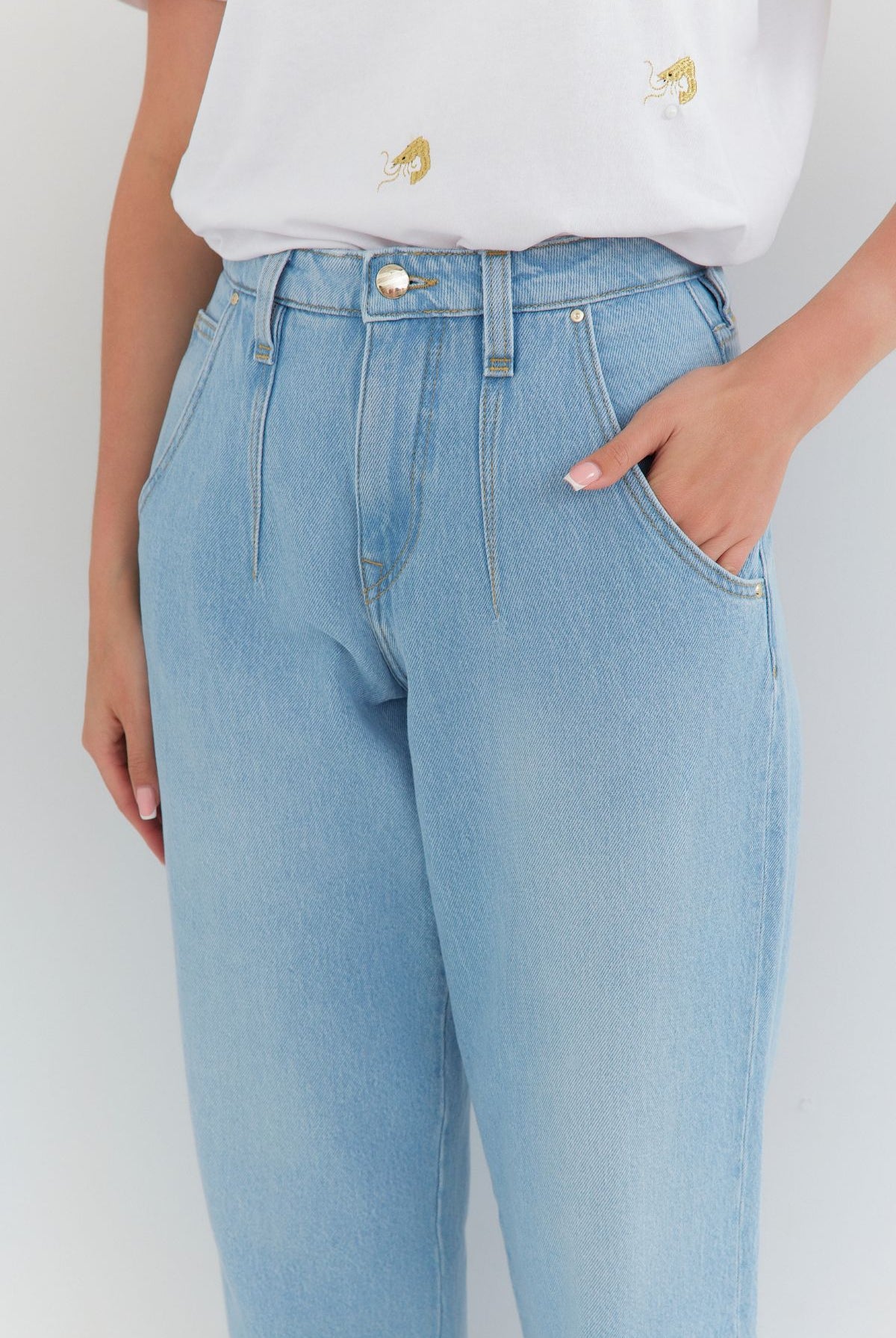 High waist, wide leg jeans made of heavenly soft fabric in blue colour. High waist. Our Model is 172 cm tall and wears size M/30.