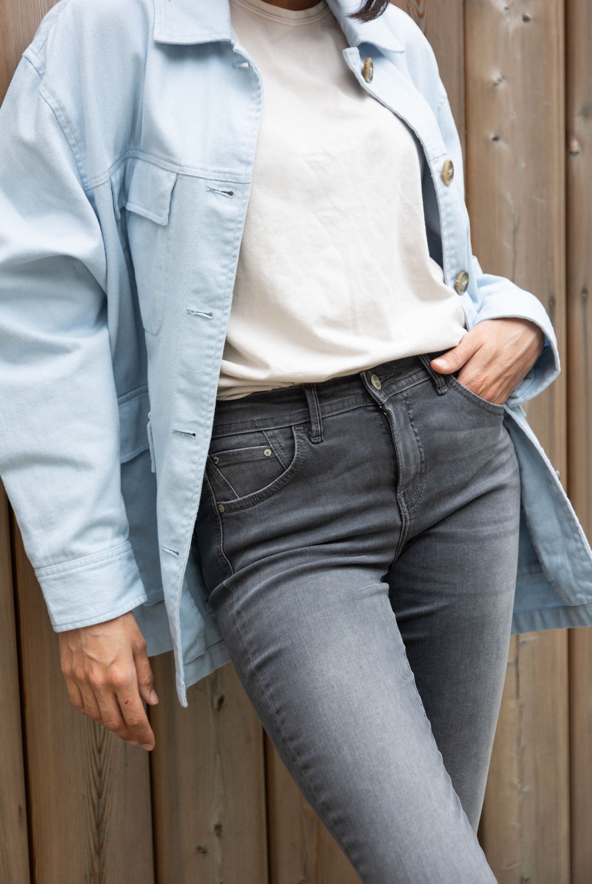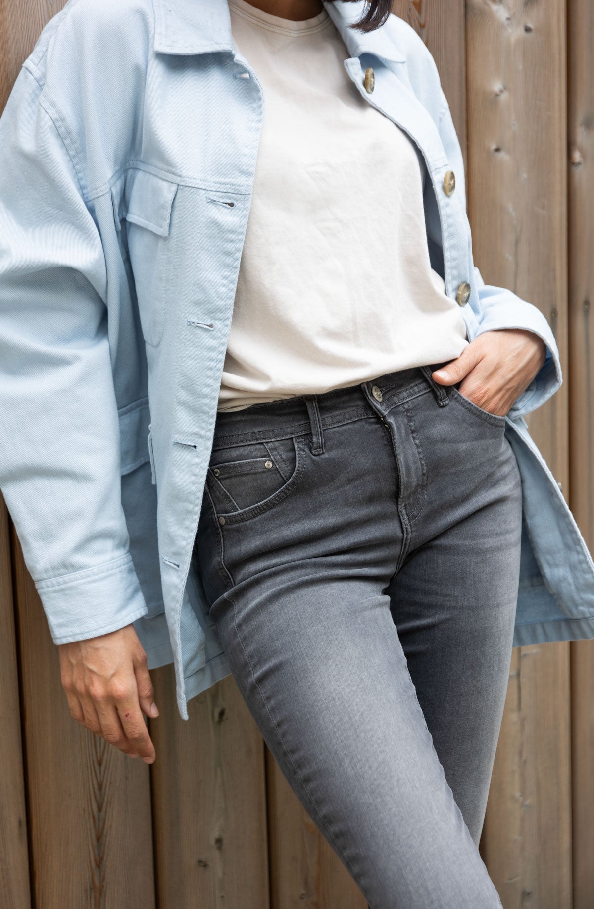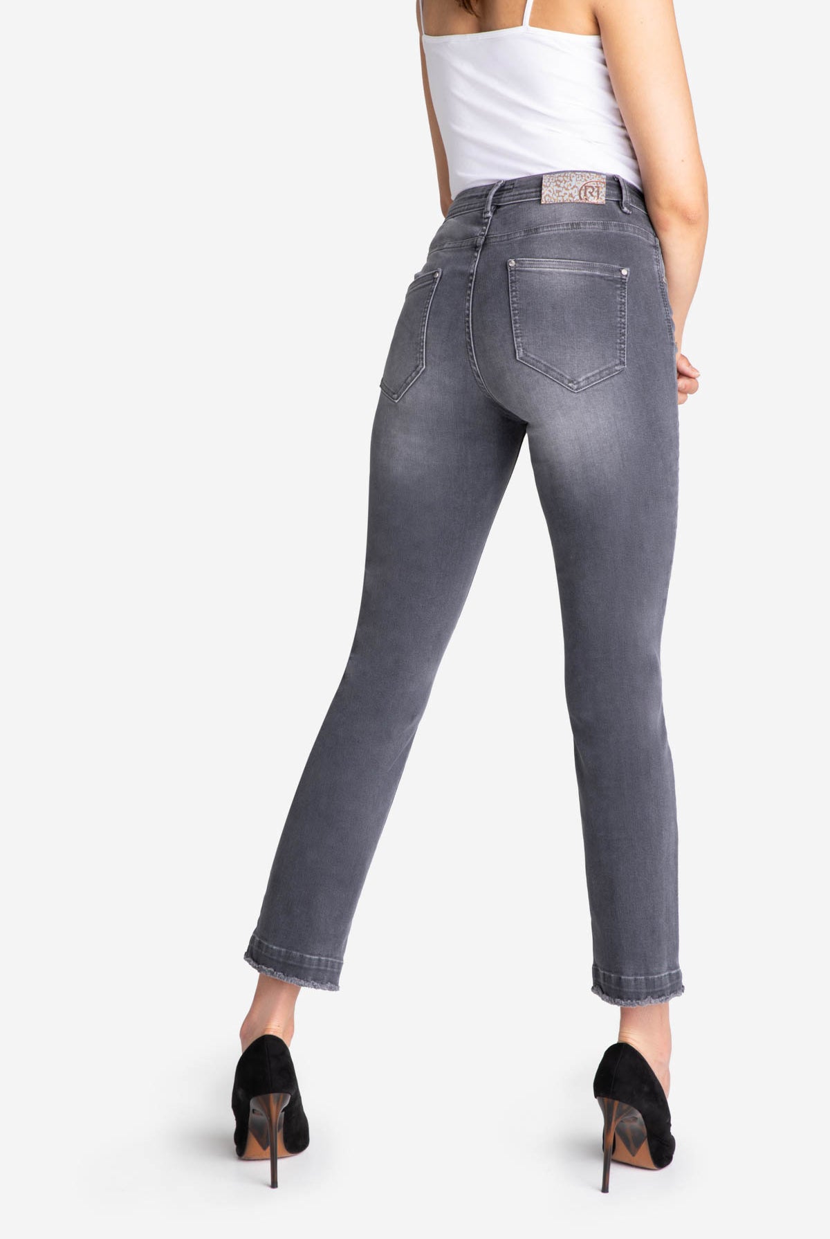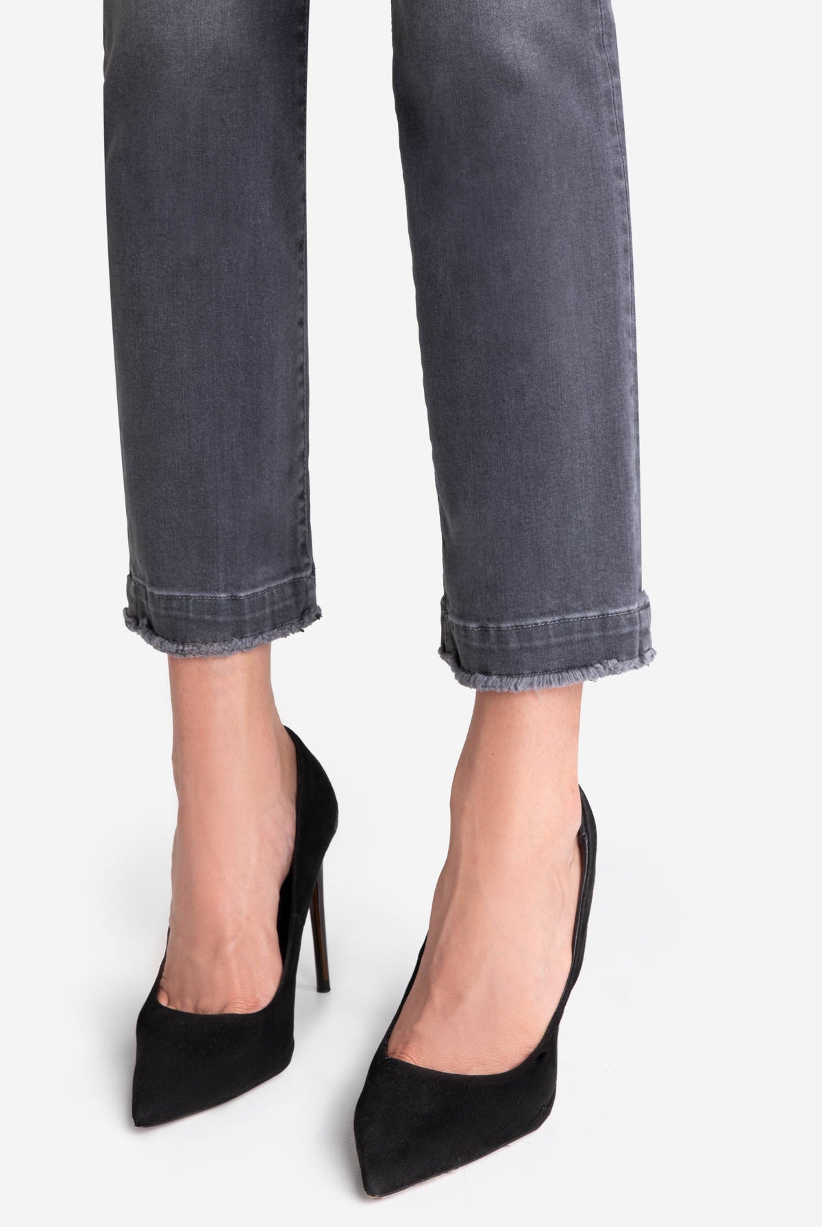 Straight Fit jeans. Medium waist. Straight leg. Very soft and delicate fabric in grey colour with fringed. Our Model is 170cm tall and wears size S/28.