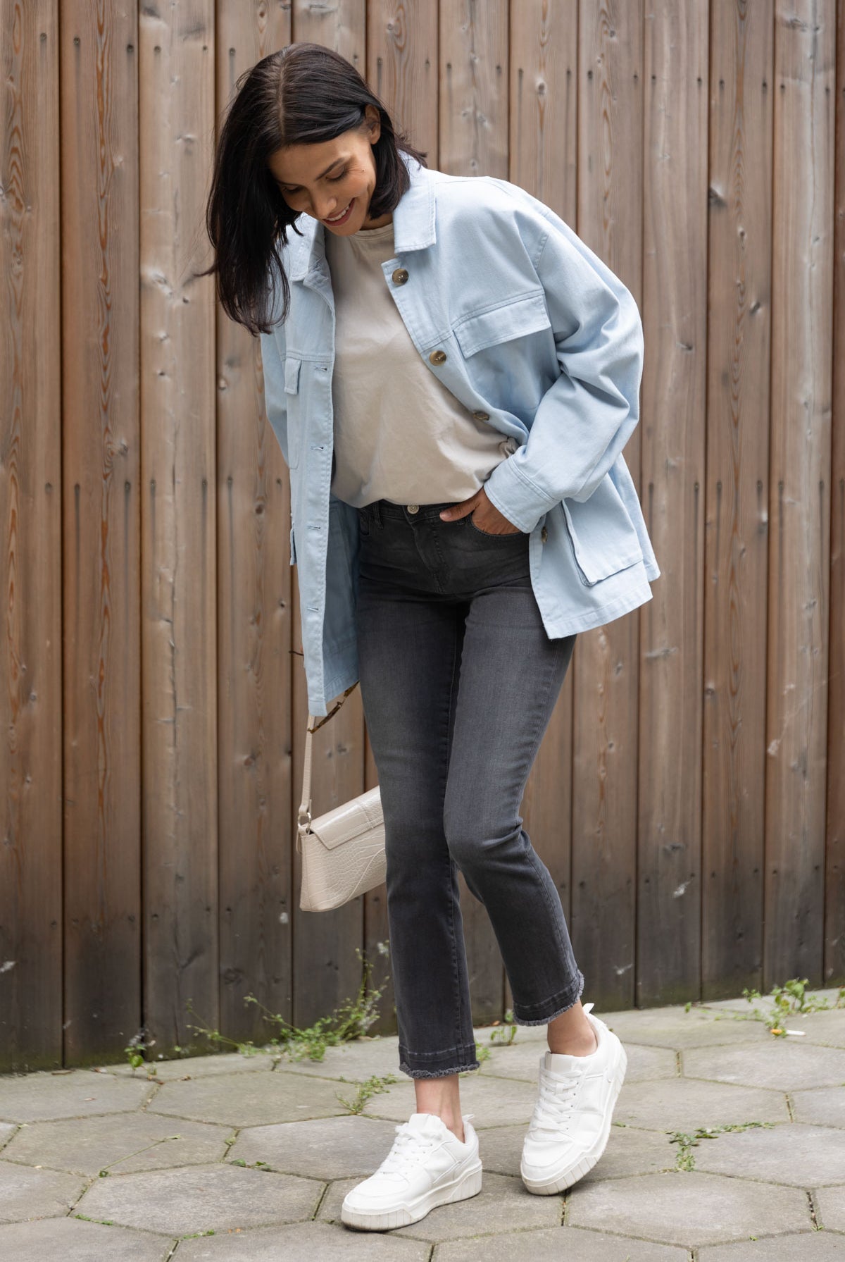 Medium waist, straight leg jeans in black coated fabric. Our Model is 170 cm tall and wears size S/28.