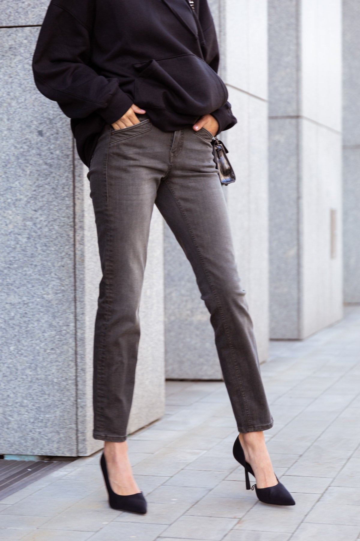 Relaxed Fit jeans in a greenish brown colour with brown accessories. Medium waist, relaxed leg. Our Model is 172 cm tall and wears size S/30.