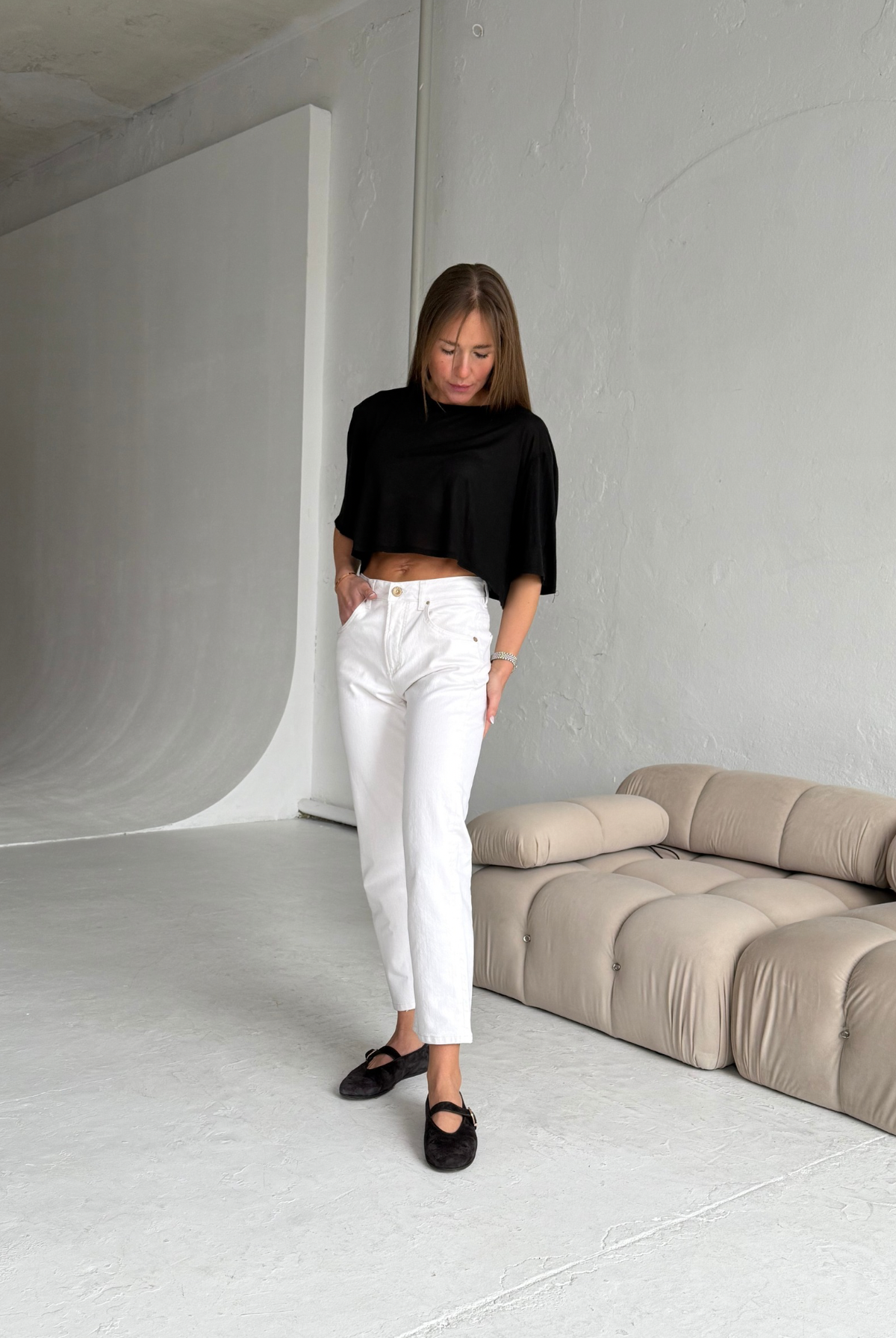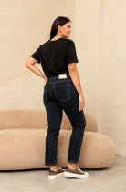 High waist, straight leg jeans made of heavenly soft fabric in dark blue colour. High waist. Our Model is 172 cm tall and wears size S/30.