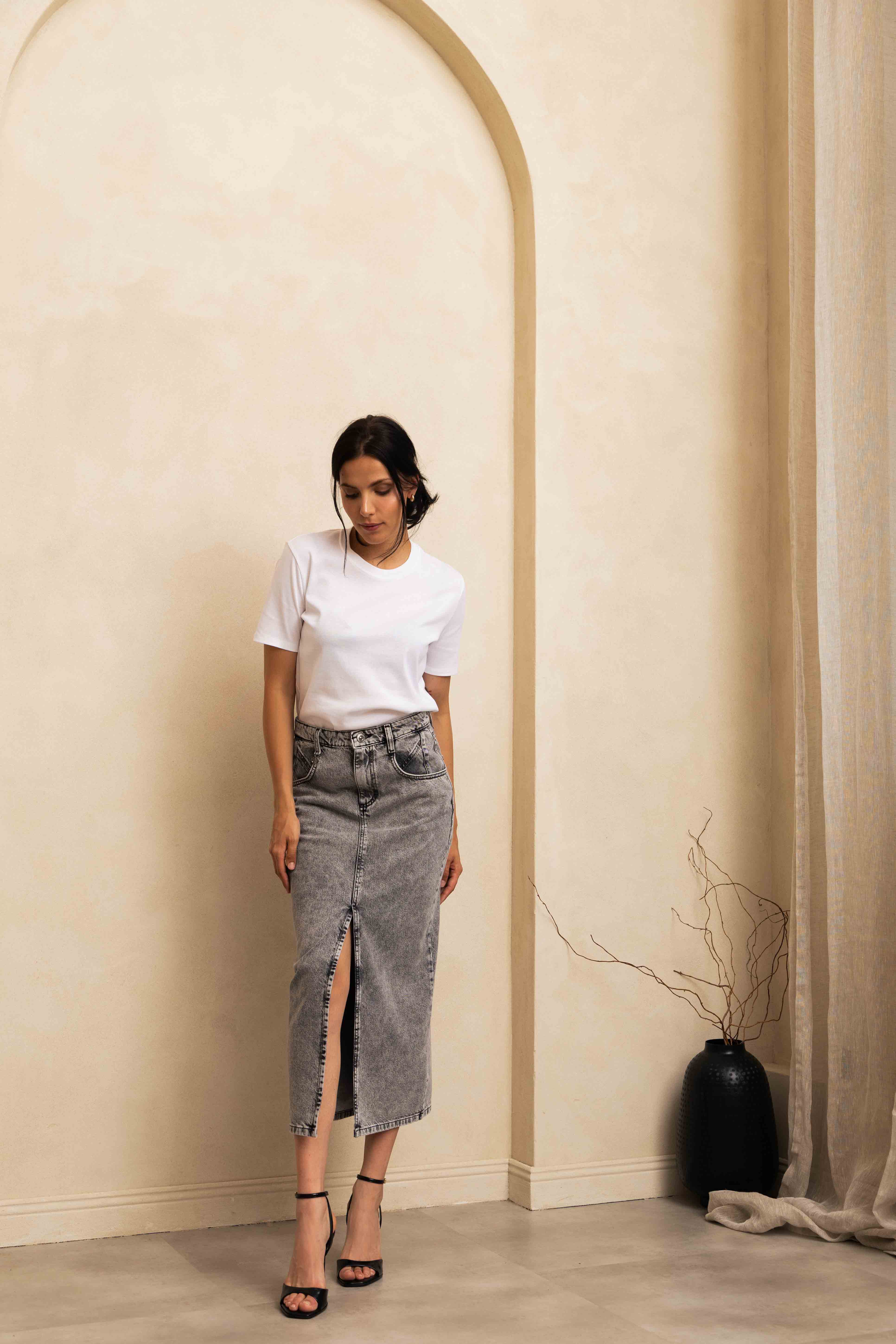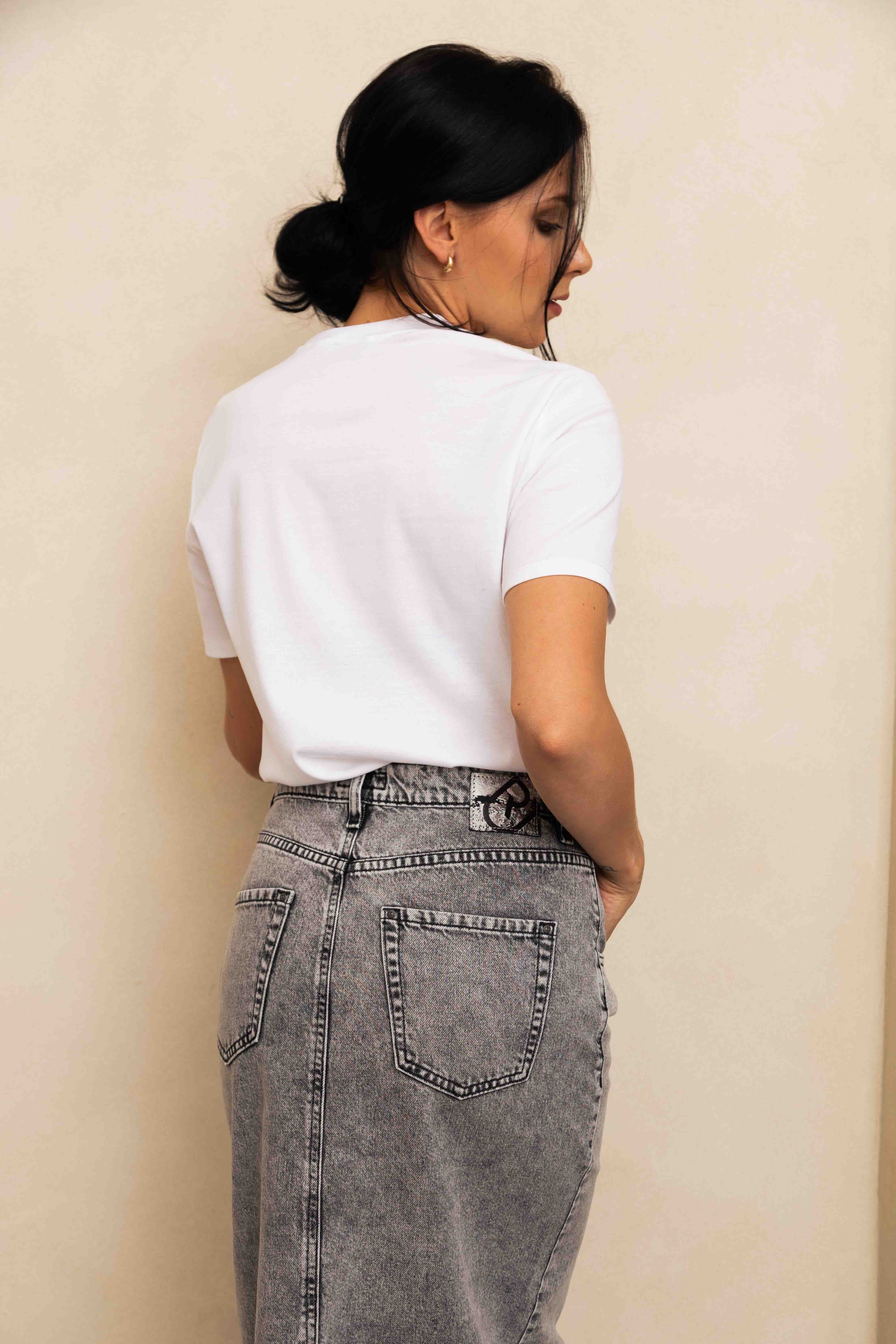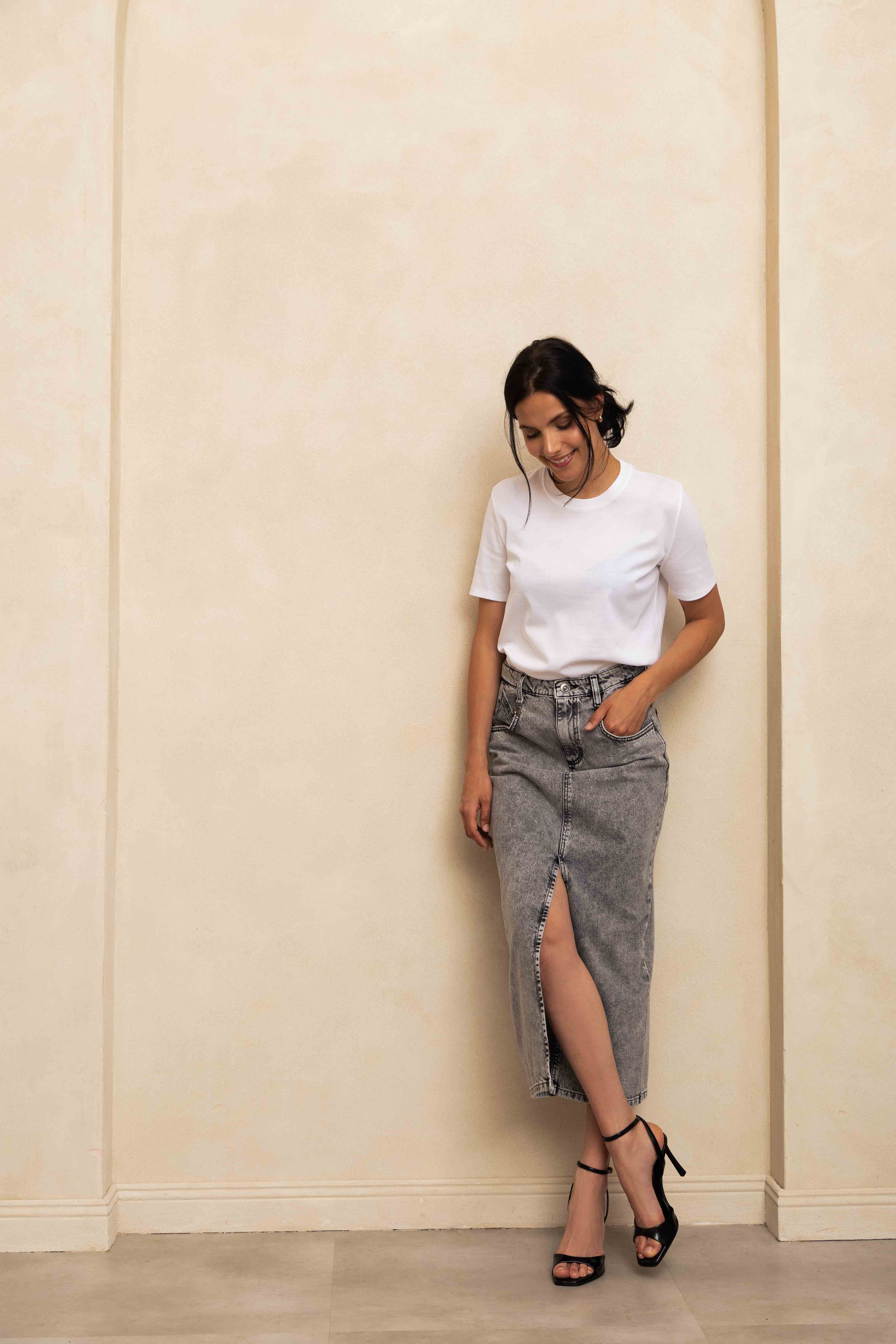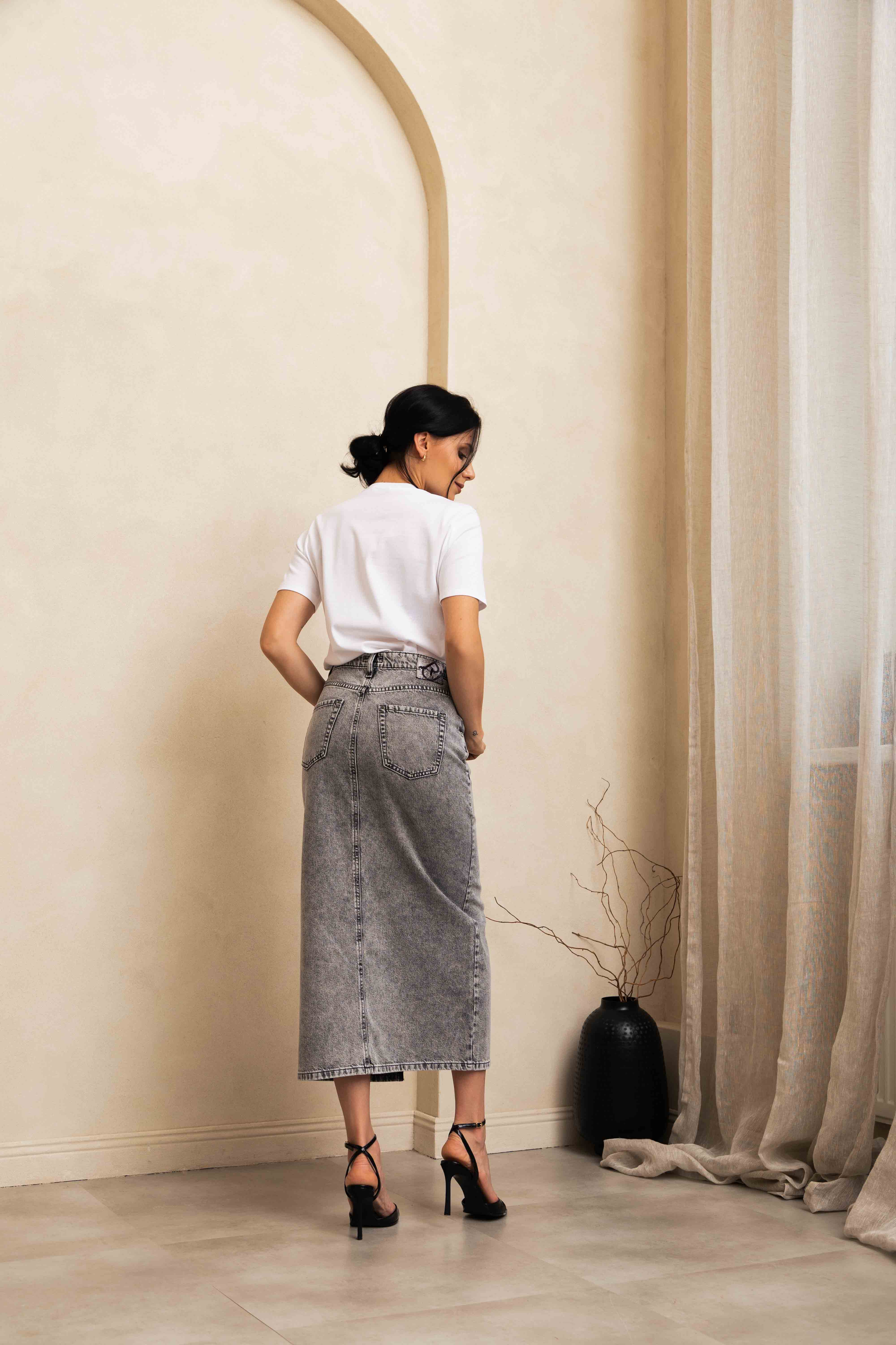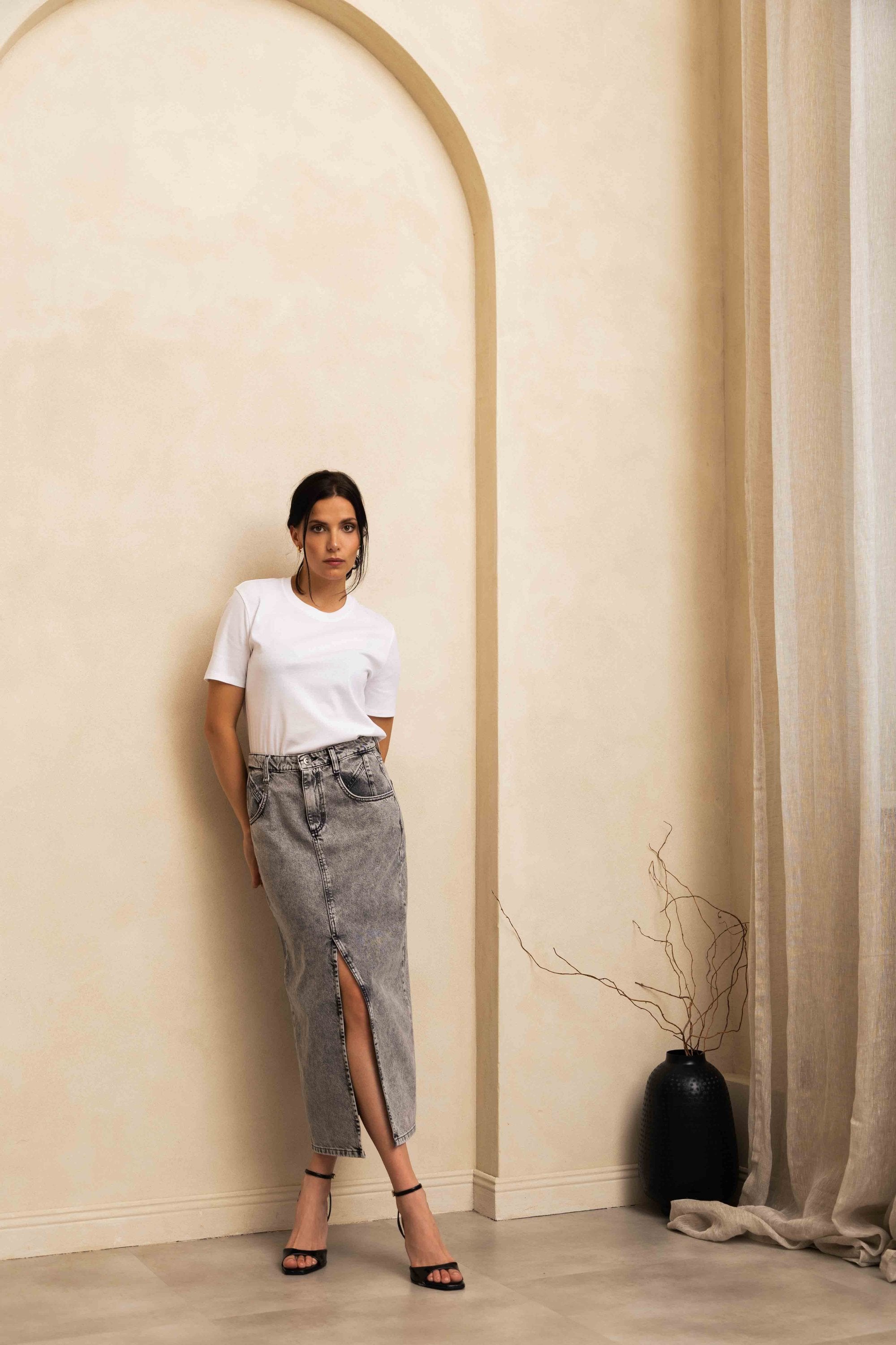 Kolejna odsłona kolorystyczna naszej bestsellerowej długiej spódnicy z przepięknymi cięciami na przednich kieszeniach. Wersja czarna została dodatkowo ozdobiona logowaną zawieszką z ozdobną cyrkonią. Wykonana z cienkiego, bardzo miękkiego w dotyku 100% bawełnianego denimu. Pięknie wygląda na każdej sylwetce, niesamowicie wysmukla. Nasza modelka ma 172 cm wzrostu i ma na sobie rozmiar S.