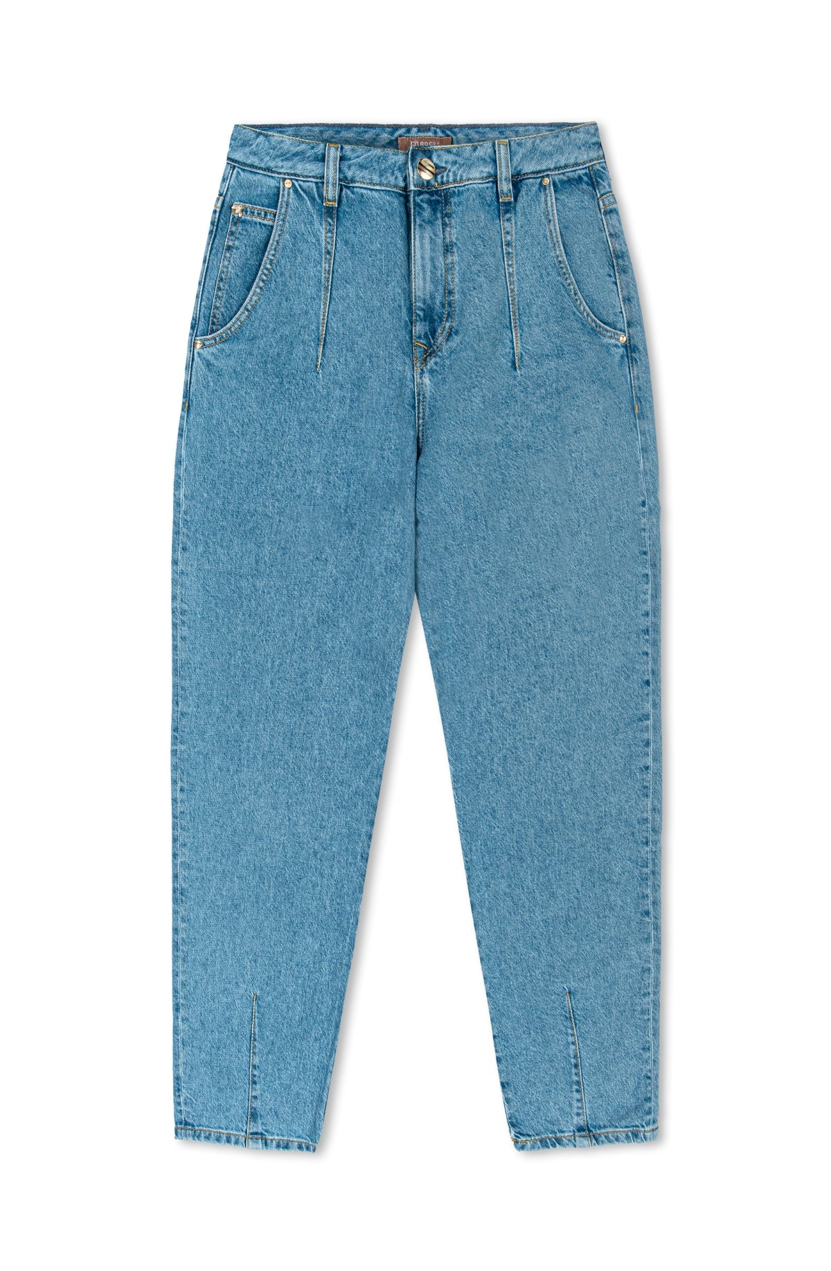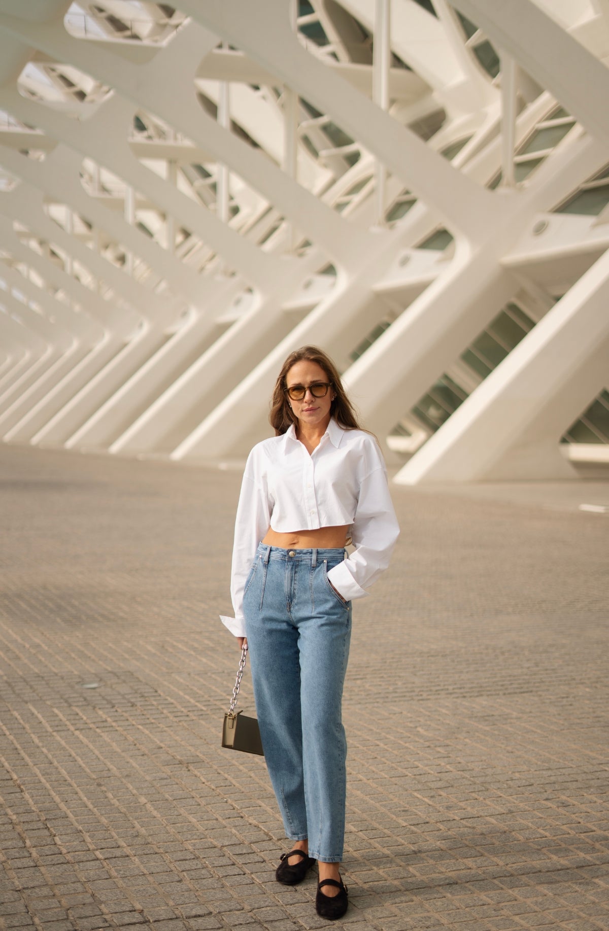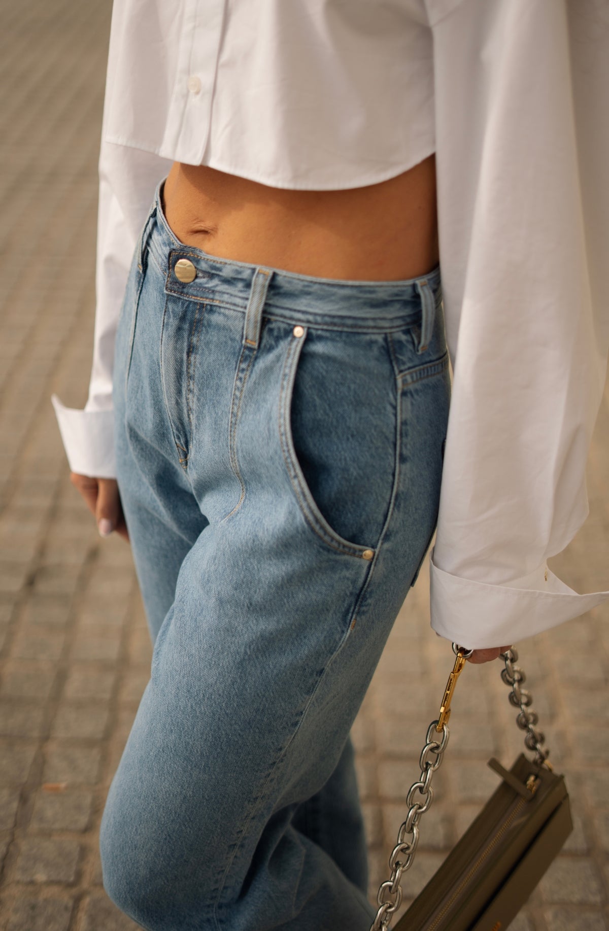 Idealne jeansy na lato. Spodnie o bardzo modnym fasonie z wysokim stanem i szeroką nogawką, która jest zawężona dołem poprzez zastosowanie zaszewek, co pozwala na wyeksponowanie szczupłej części kostki. Są wykonane z cieniutkiego, miękkiego i „lejącego się” denimu, który w swoim składzie ma LYOCELL. Modelka ma 170cm wzrostu i nosi rozmiar S.