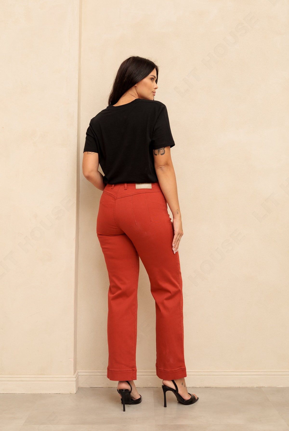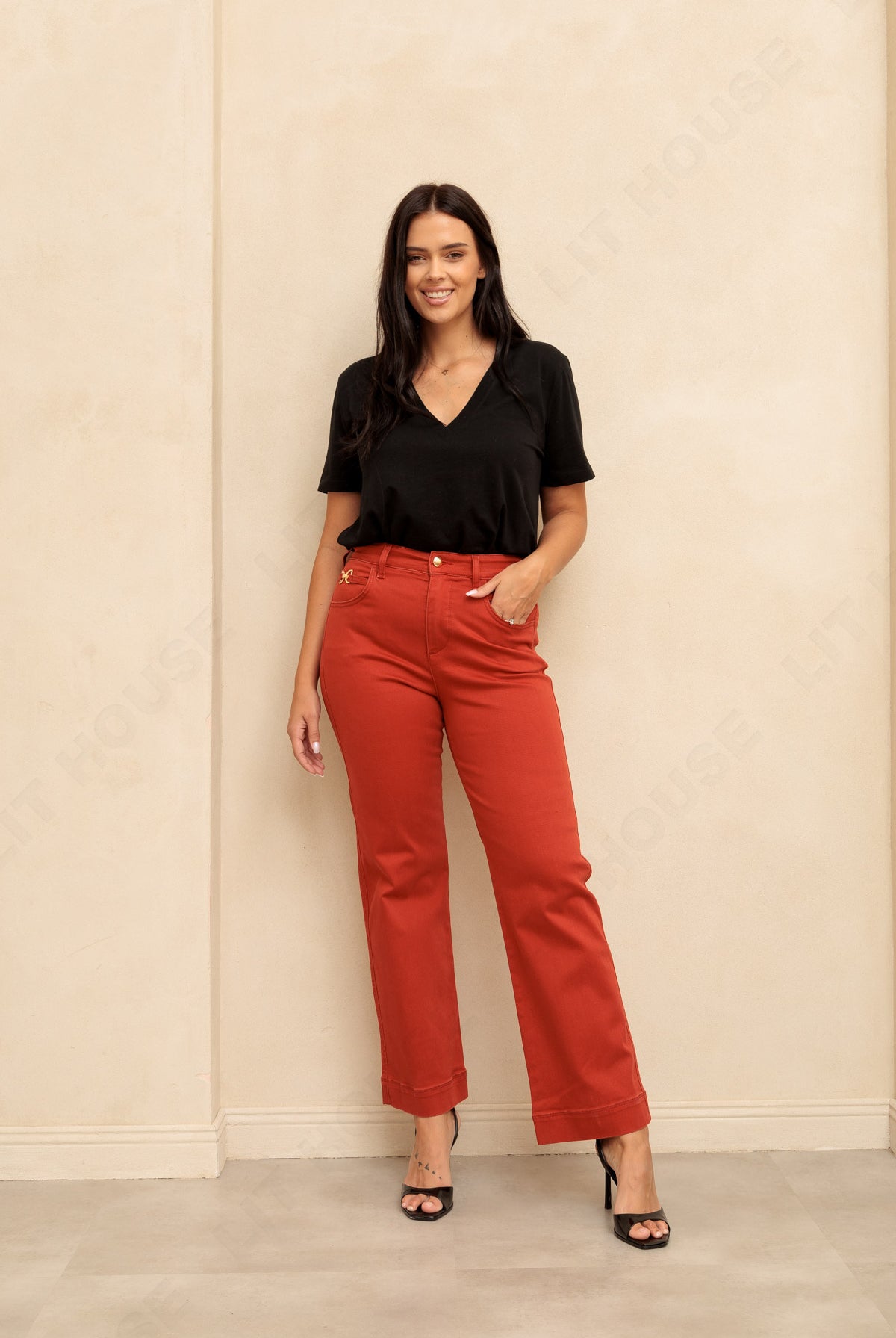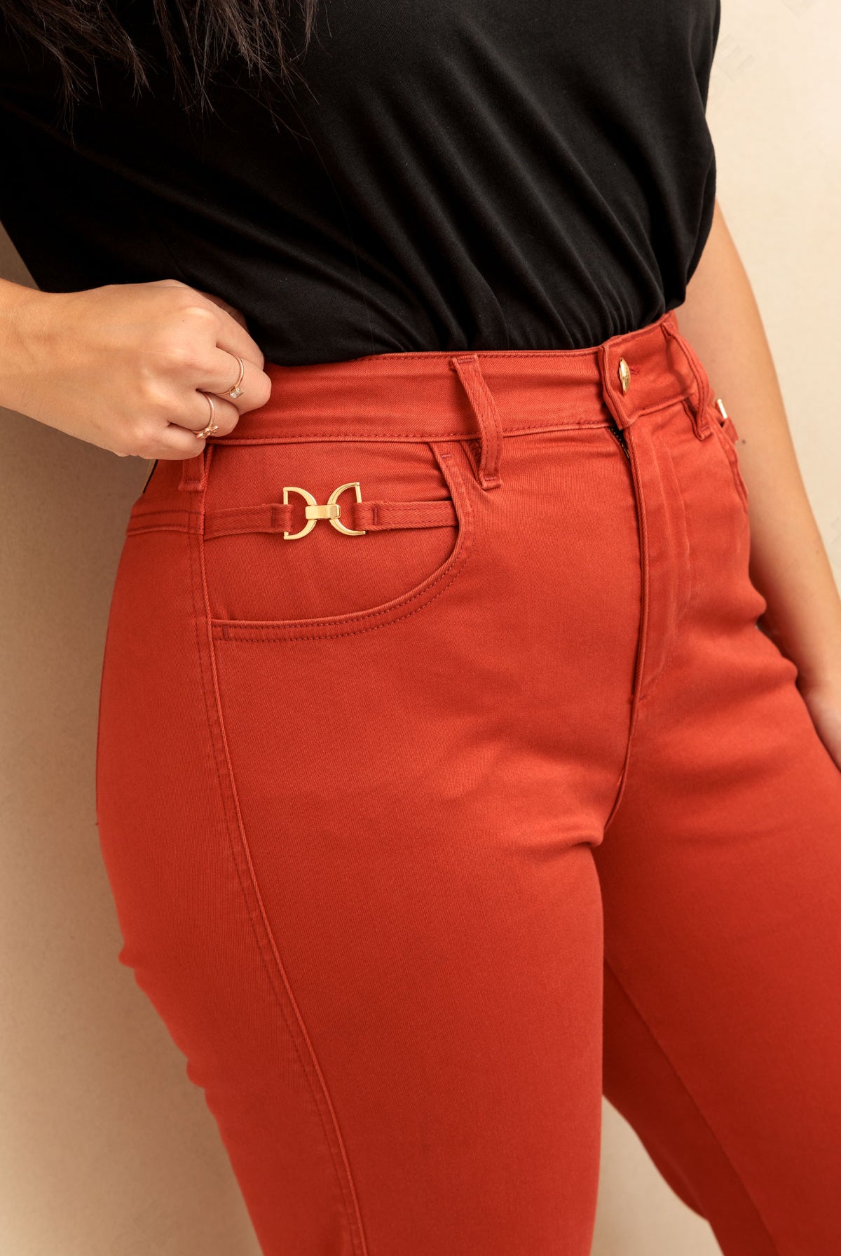 Niezwykłe spodnie z prostą nogawką o długości 7/8. Wykonane z bardzo elastycznego jeansu w niecodziennym ceglanym odcieniu czerwieni. Jasnozłote dodatki podkreślają wyjątkowy kolor i dodają elegancji. Modelka ma 172 cm wzrostu i nosi rozmiar S.