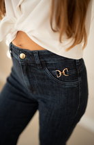 Jeansy, które w spektakularny sposób kształtują sylwetkę. Wykonane z bardzo elastycznego materiału w przepięknym ciemnogranatowym kolorze. Na tyle spodni zamiast kieszeni są zaszewki, które pięknie podkreślają figurę. Na przednich kieszeniach ozdobne klamerki w jasnozłotym kolorze. Nasza modelka ma 170 cm wzrostu i ma na sobie rozmiar S/30.