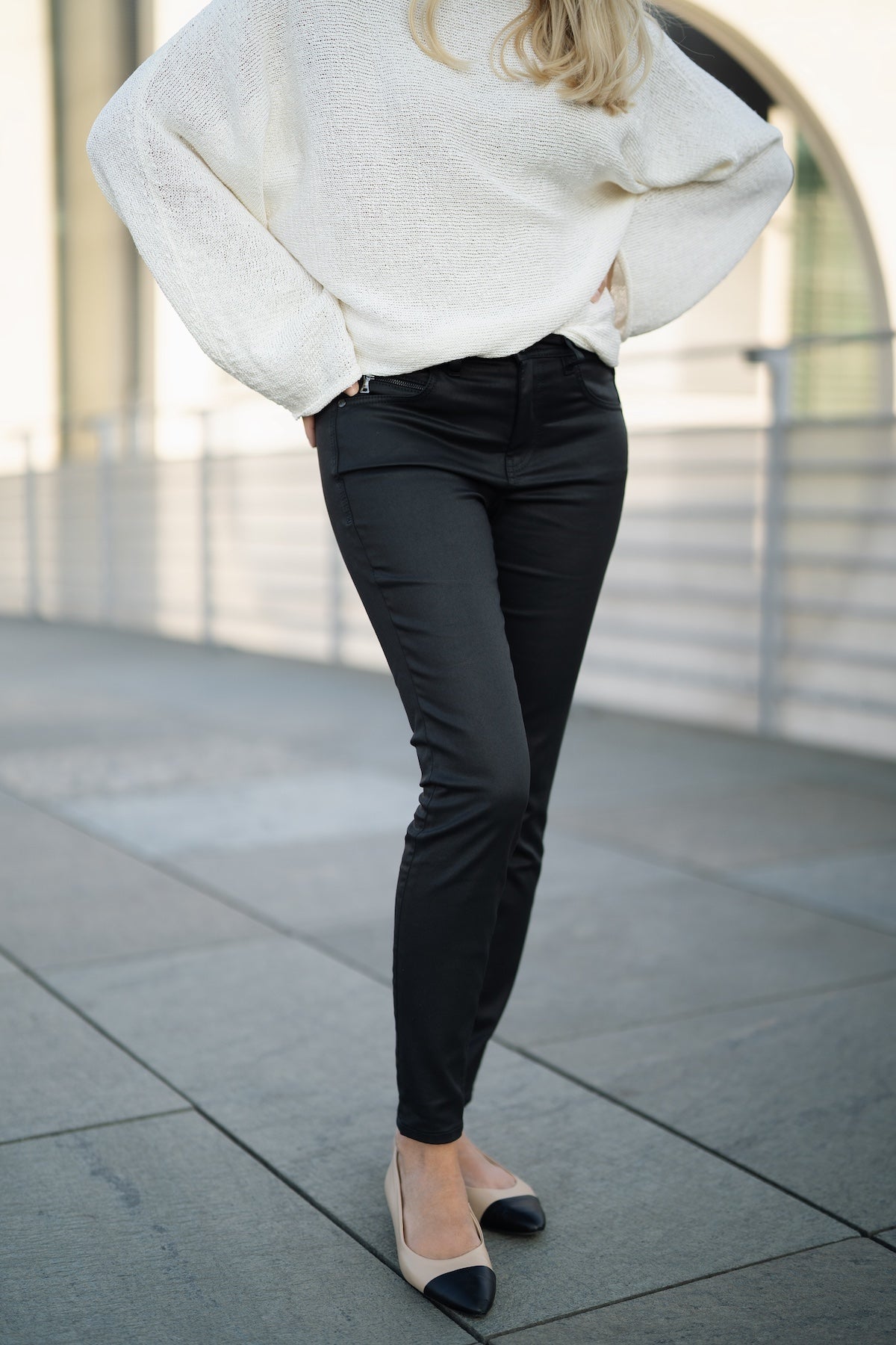 Dopasowane dżinsy ze średnim stanem i wąską nogawką, zapinane na zamek. Wykonane z materiału imitującego skórę, ozdobione delikatnym zameczkiem nad prawą kieszenią. Modelka ma 170 cm wzrostu i nosi rozmiar S/30.