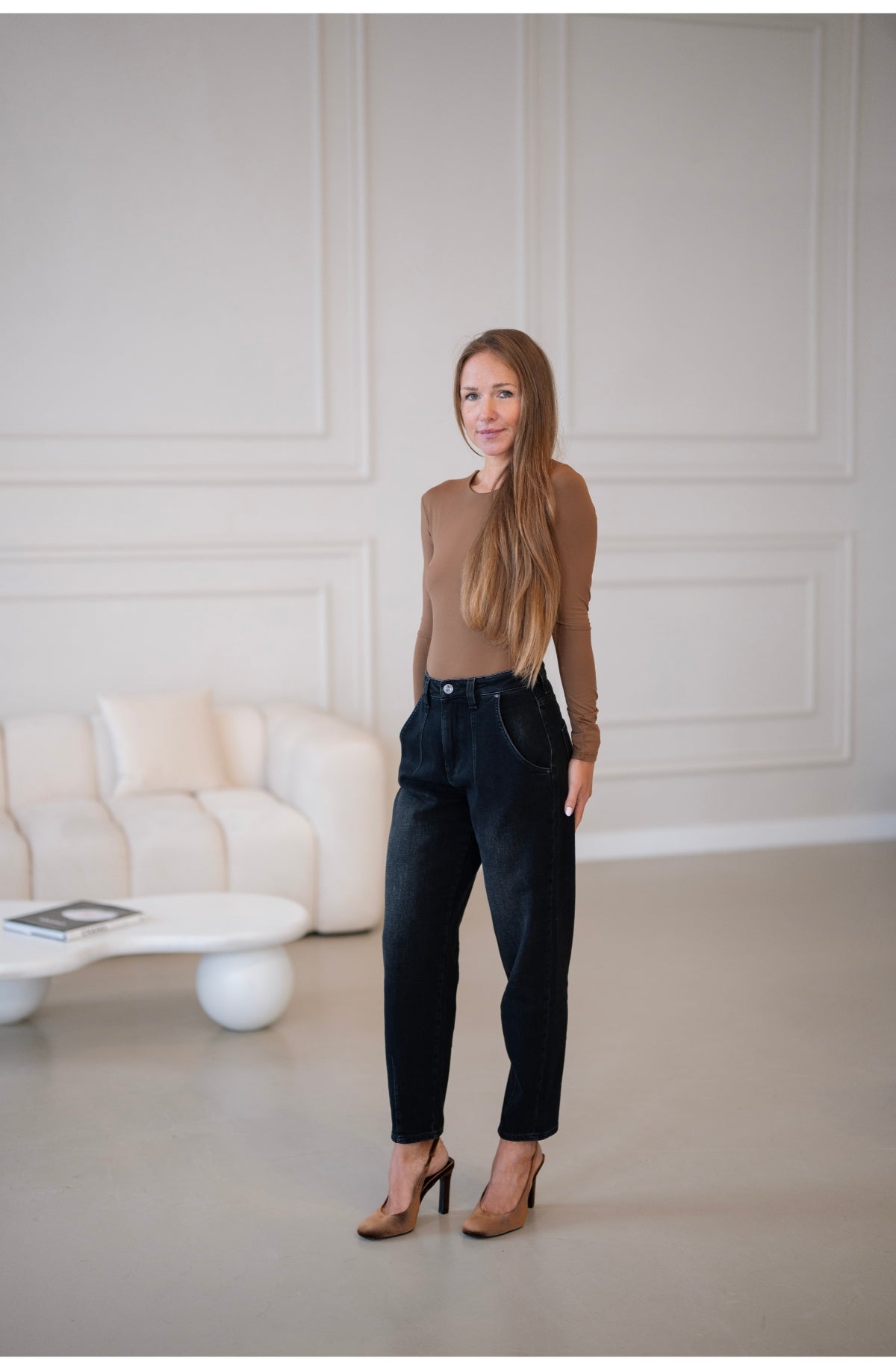 Spodnie Alice w intensywnie czarnym kolorze to nasza elegancka interpretacja jeansowych chinosów. Modny krój z wysokim stanem, zaszewkami na przodzie oraz dołach nogawek sprawia, że będą pasować do wielu stylizacji- codziennych, biurowych oraz wieczorowych. Wykonane z wyjątkowo miękkiego materiału o kaszmirowym chwycie, który gwarantuje komfort przez cały dzień. Tkanina zawiera „Lycrę T400”, dzięki czemu spodnie zachowują swój kształt i nie tracą formy. Modelka ma 170 cm wzrostu i nosi rozmiar S/28.