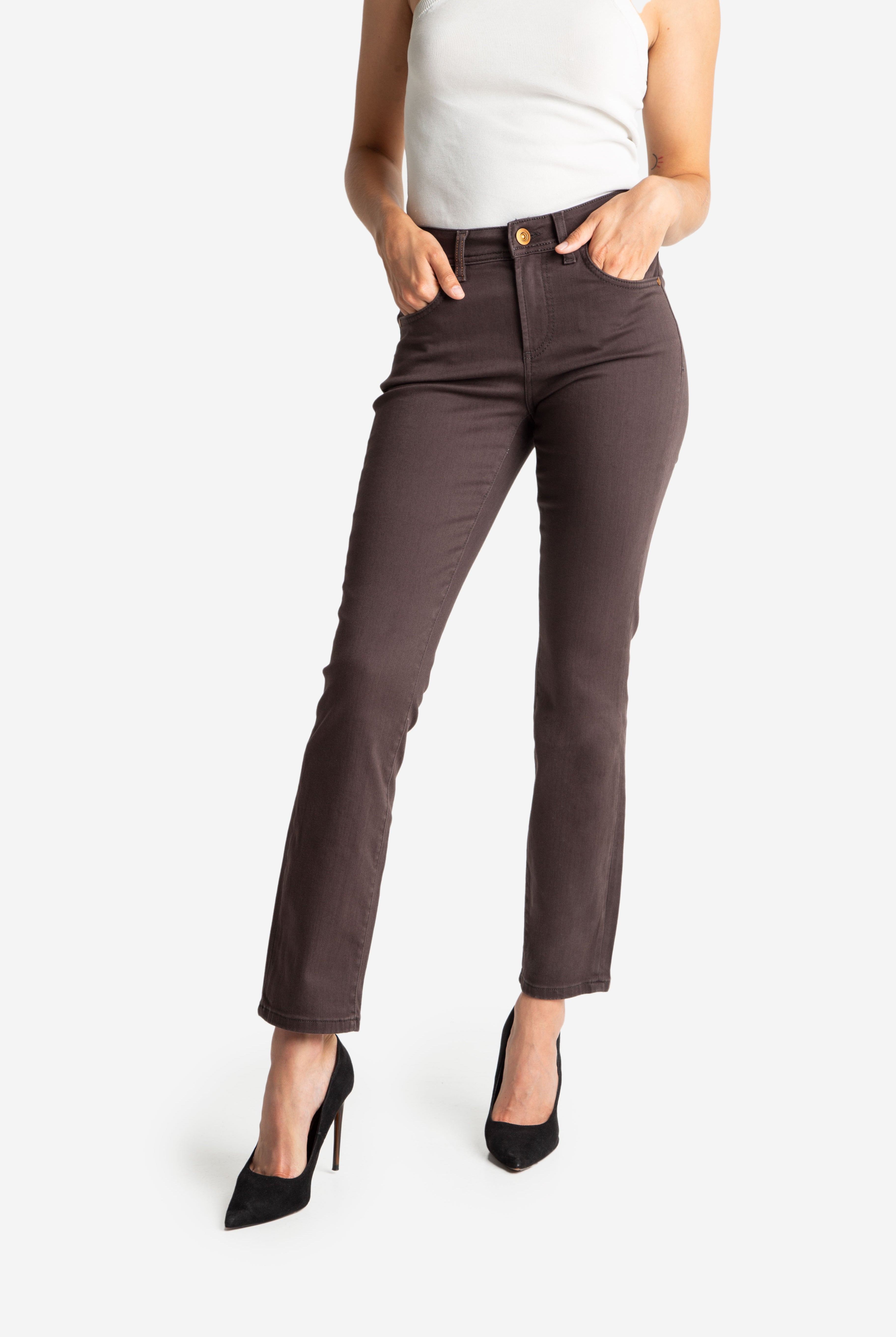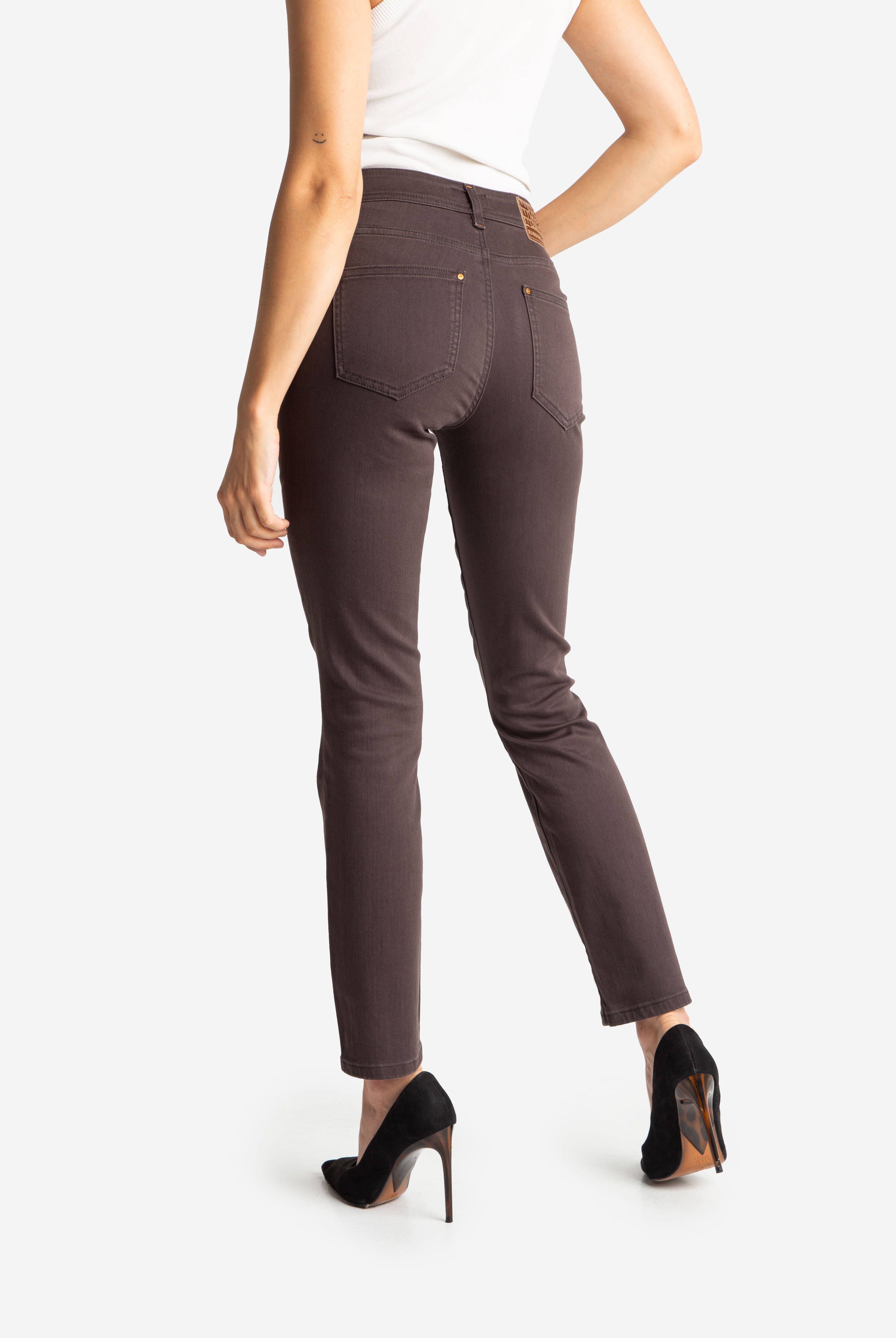 Bestsellerowy model LAJA wykonany z miękkiego i naddającego się jeansu w kolorze ciemnego czekoladowego brązu. Krój tych spodni bardzo wysmukla sylwetkę poprzez wysoki stan oraz prostą nogawkę, która może być noszona także w wersji podwiniętej pokazując bardzo ciekawy odcień spodniej warstwy tkaniny. Nasza modelka ma 175 cm wzrostu i ma na sobie rozmiar XL/30.