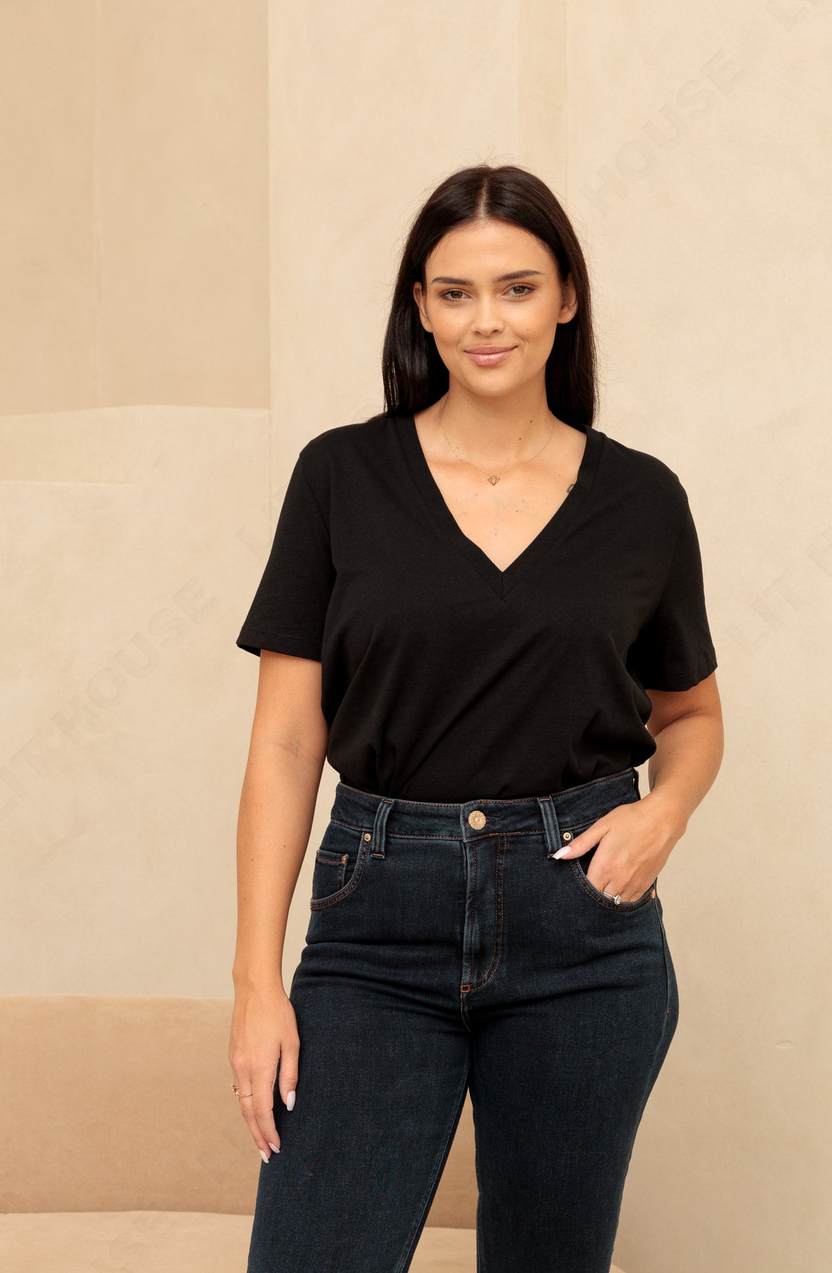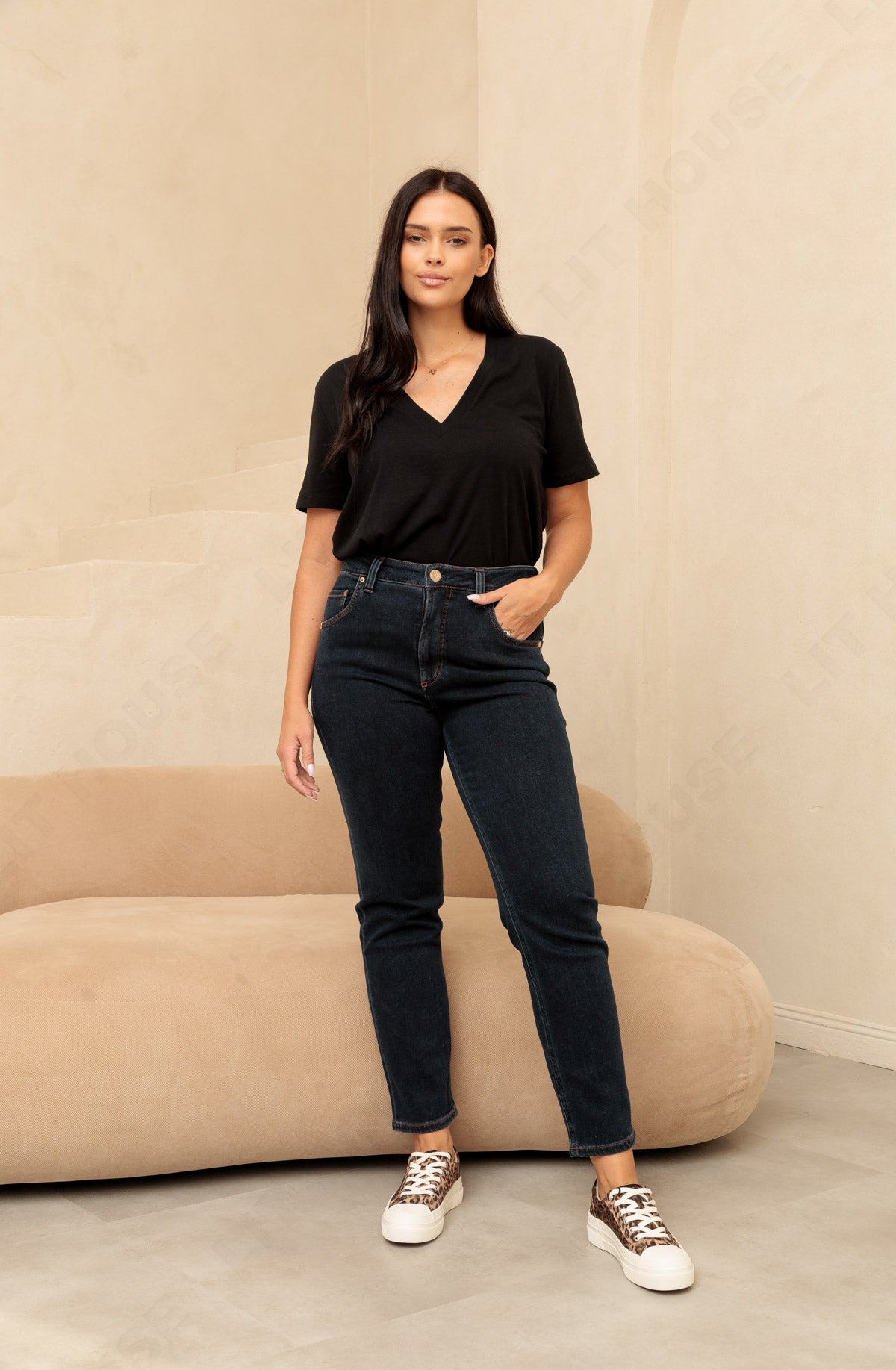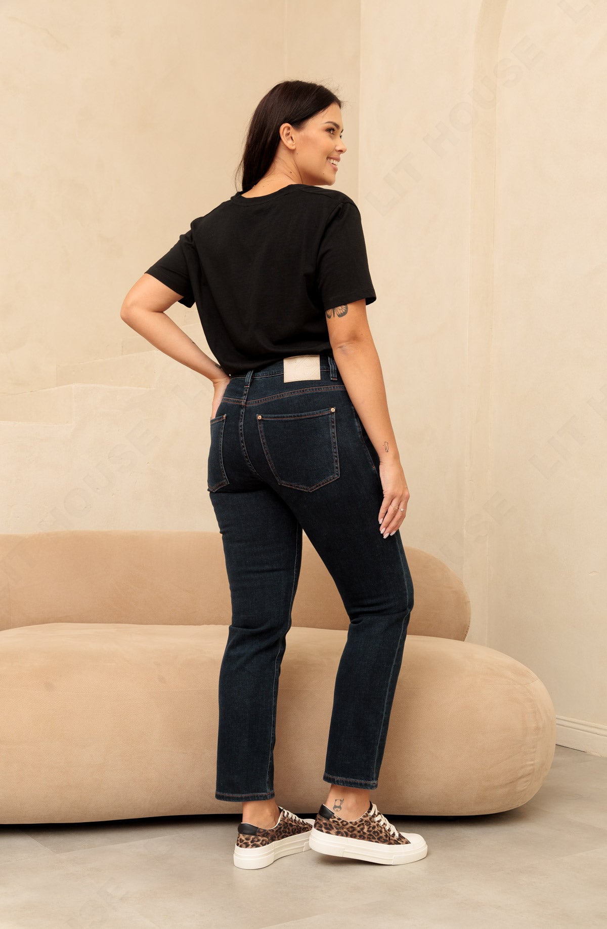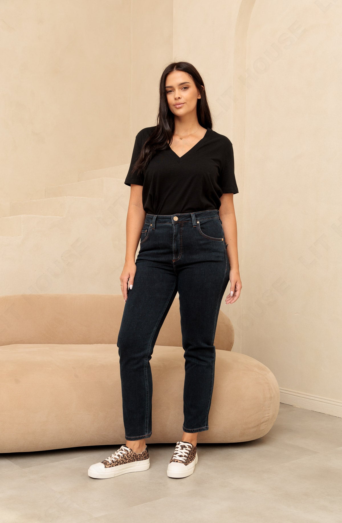 Spodnie o bardzo modnym kroju, z wysokim stanem i prostą nogawką, wykonane z bardzo miękkiego materiału o KASZMIROWYM chwycie w pięknym ciemnogranatowym kolorze. Modelka ma 172 cm wzrostu i nosi rozmiar S/30.