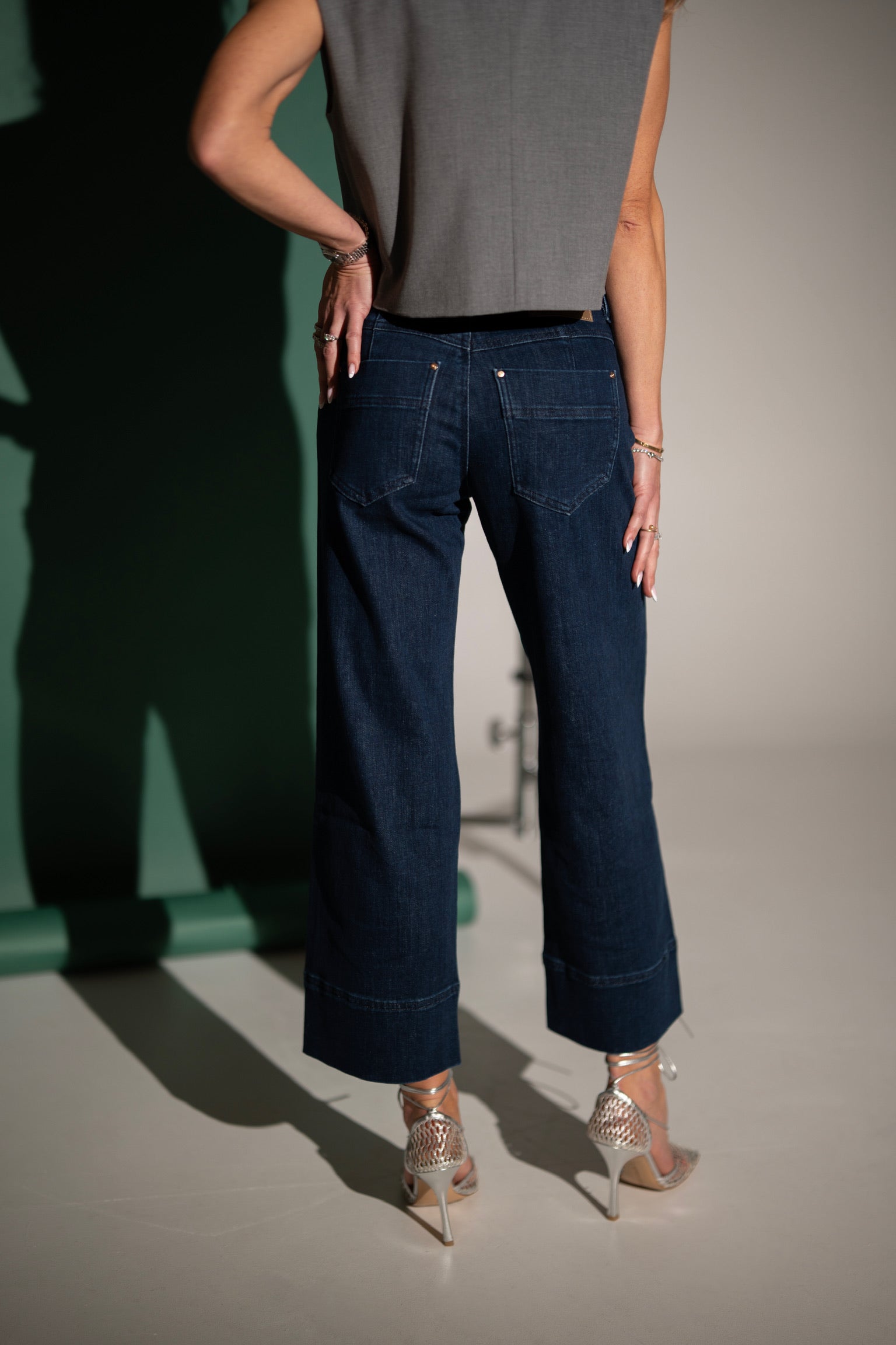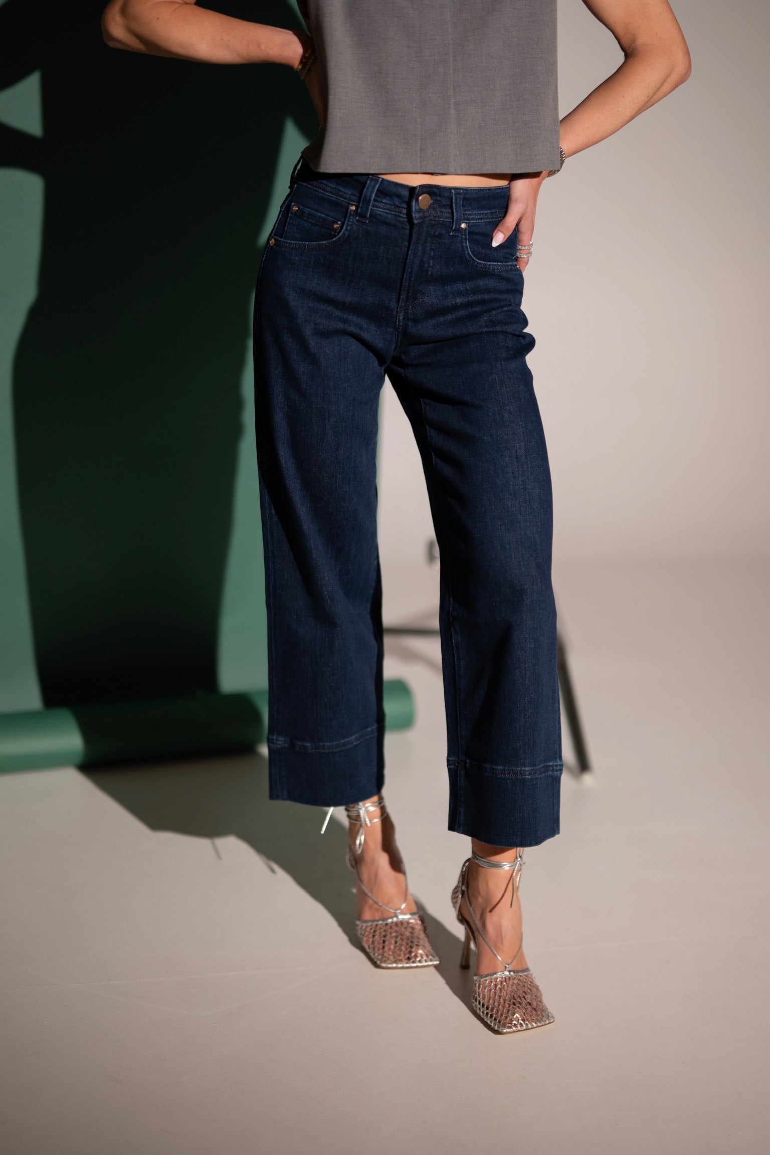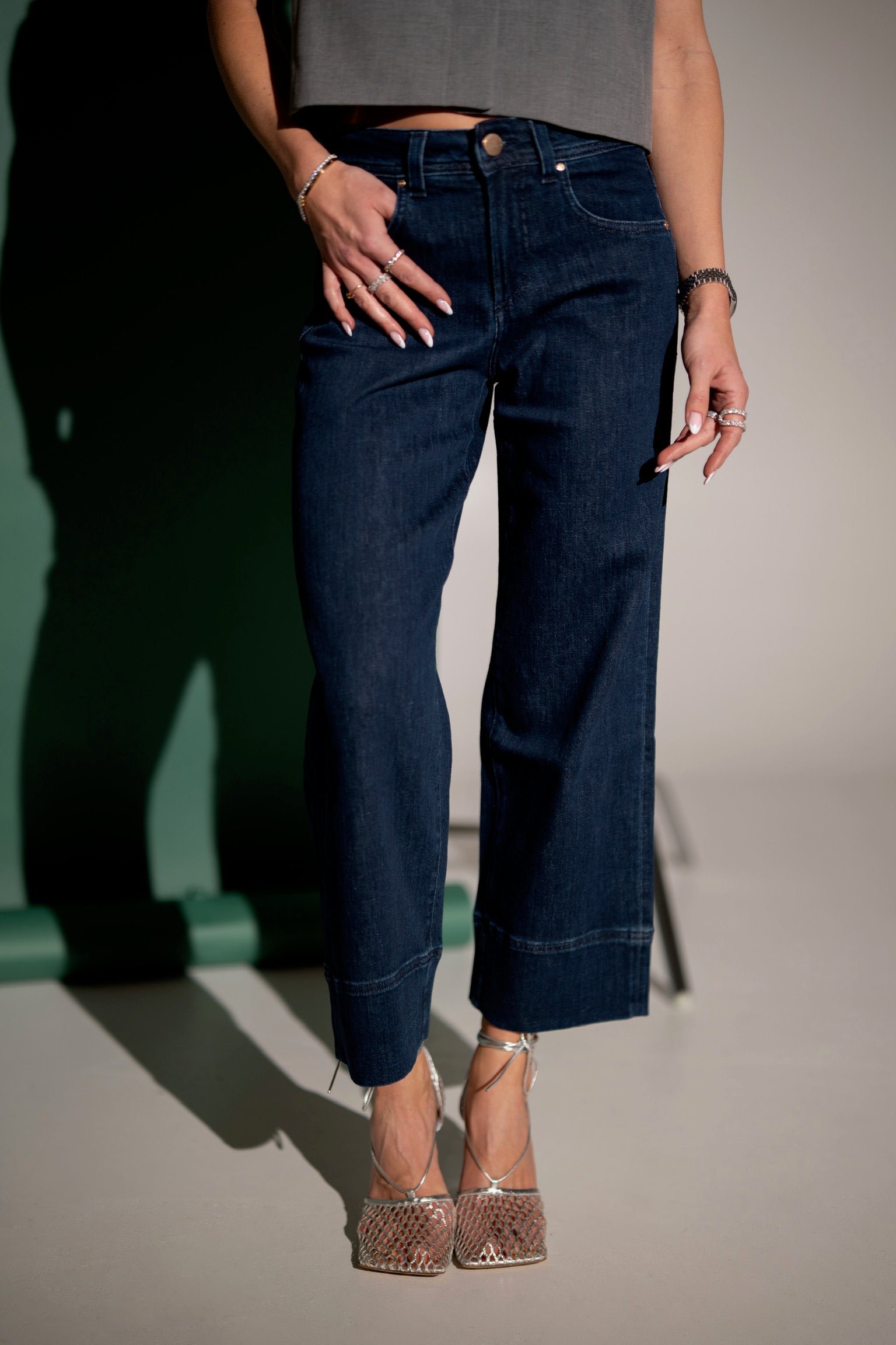 Spodnie, które pokochasz od pierwszego założenia. Najmodniejszy fason- szeroka nogawka zakończona szerokim mankietem o długości 7/8. Fantastycznie uzupełniają jesienne stylizacje z botkami, kowbojkami lub kozakami. Piękny, głęboki odcień granatu nie tylko optycznie wyszczupli Twoją sylwetkę, ale do tego jest tak uniwersalny, że możesz połączyć te jeansy zarówno z miękkim, ciepłym swetrem, jak i z elegancką jedwabną koszulą. Modelka ma 170 cm wzrostu i ma na sobie rozmiar S.