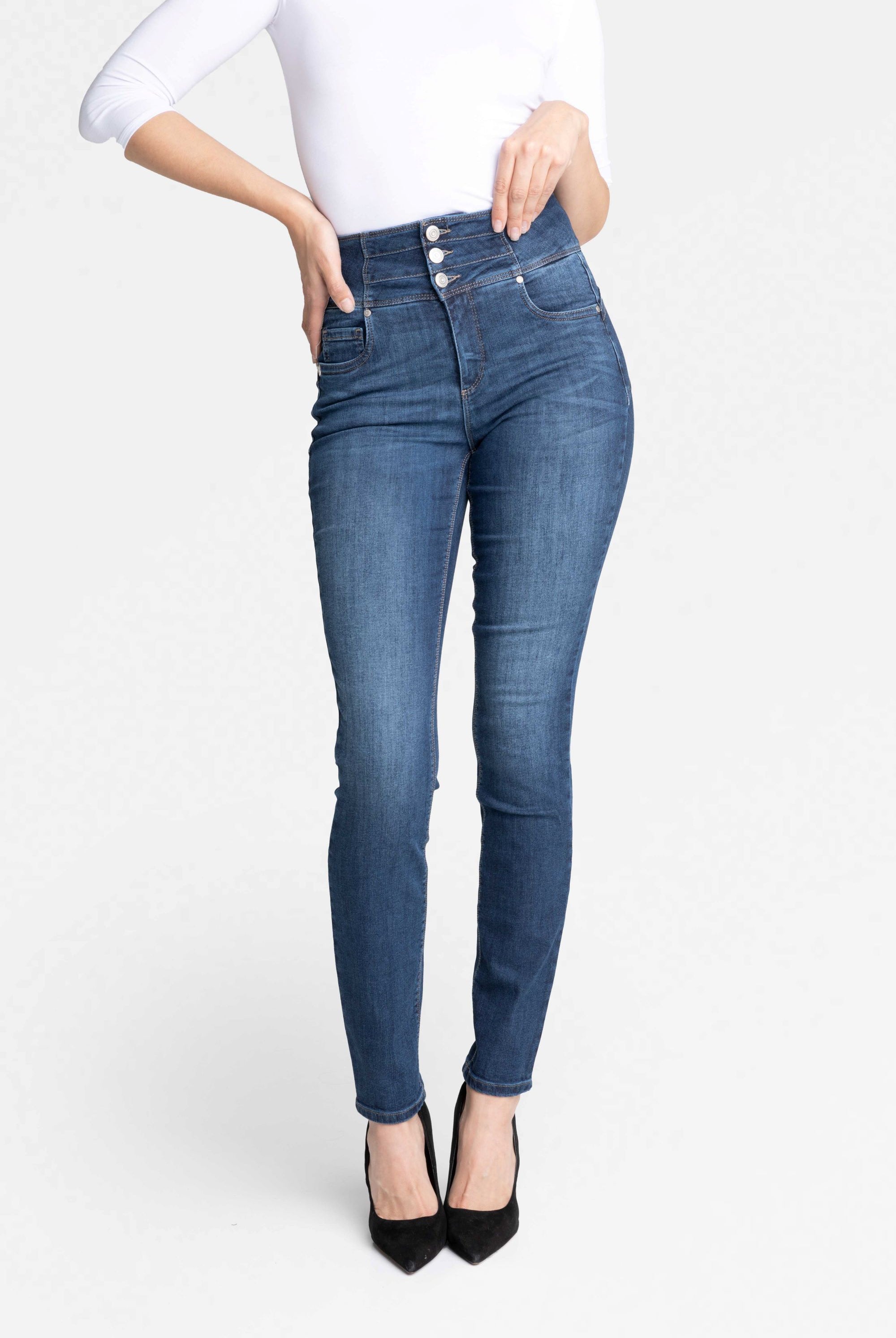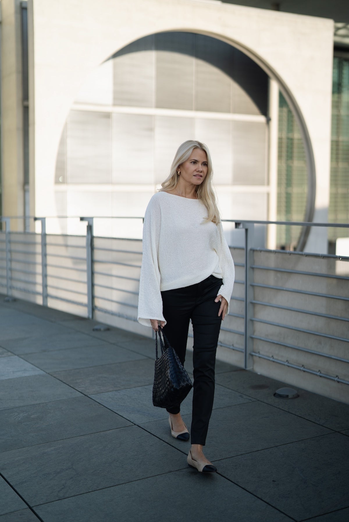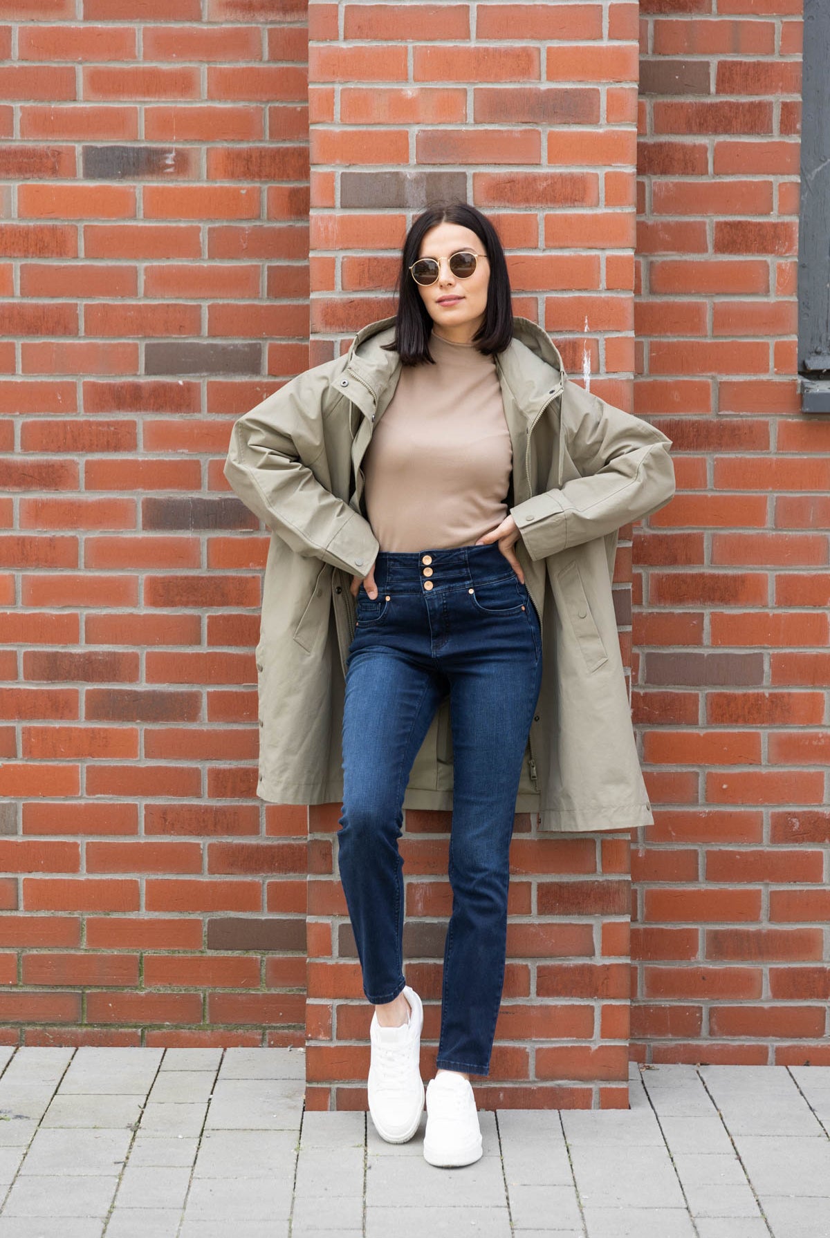 Klasyczne spodnie z wysokim stanem i prostą nogawką, zapinane na zamek. Ozdobione błyszczącym czarnym zamkiem nad przednią kieszonką. Modelka ma 170 cm wzrostu i nosi rozmiar S/31.