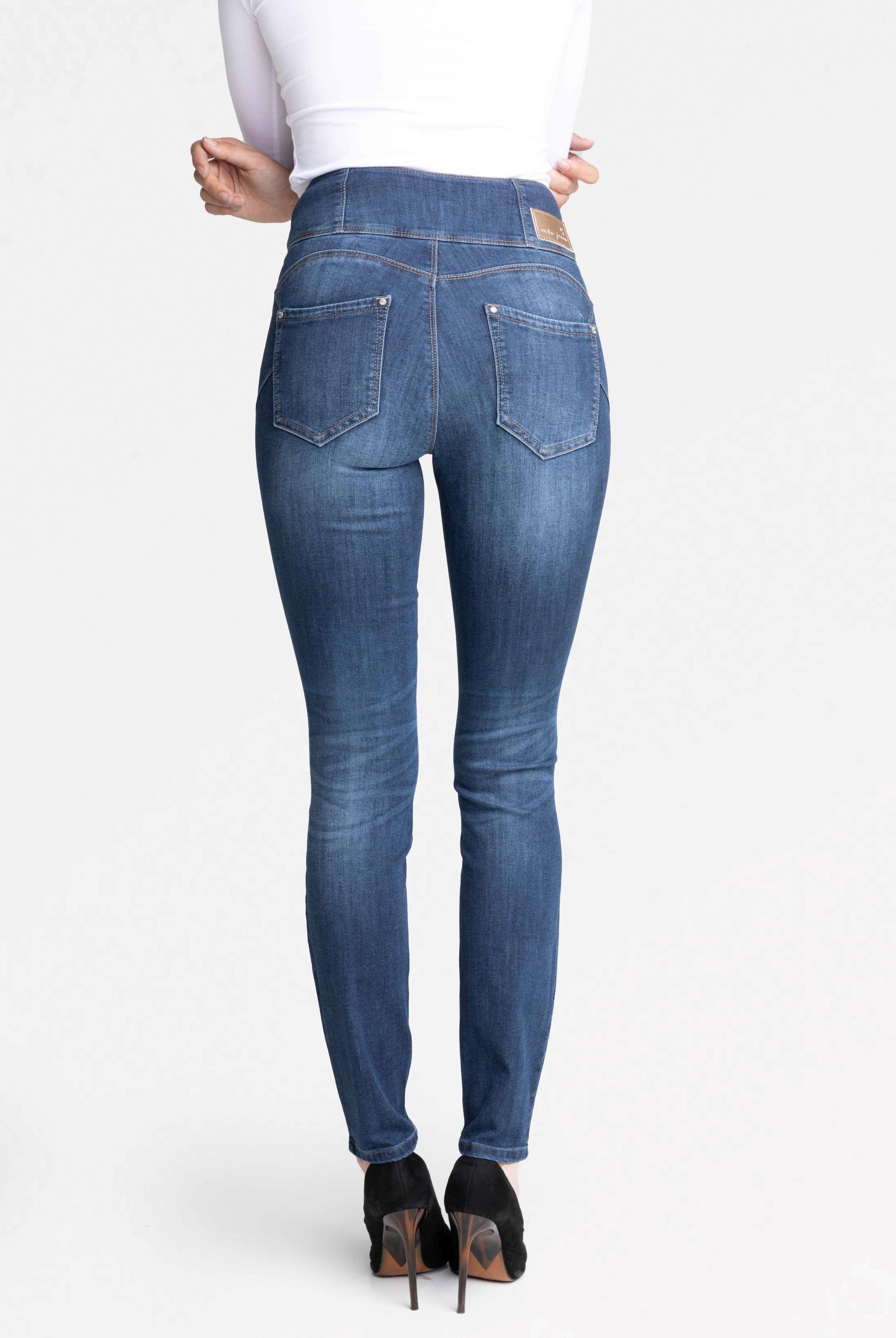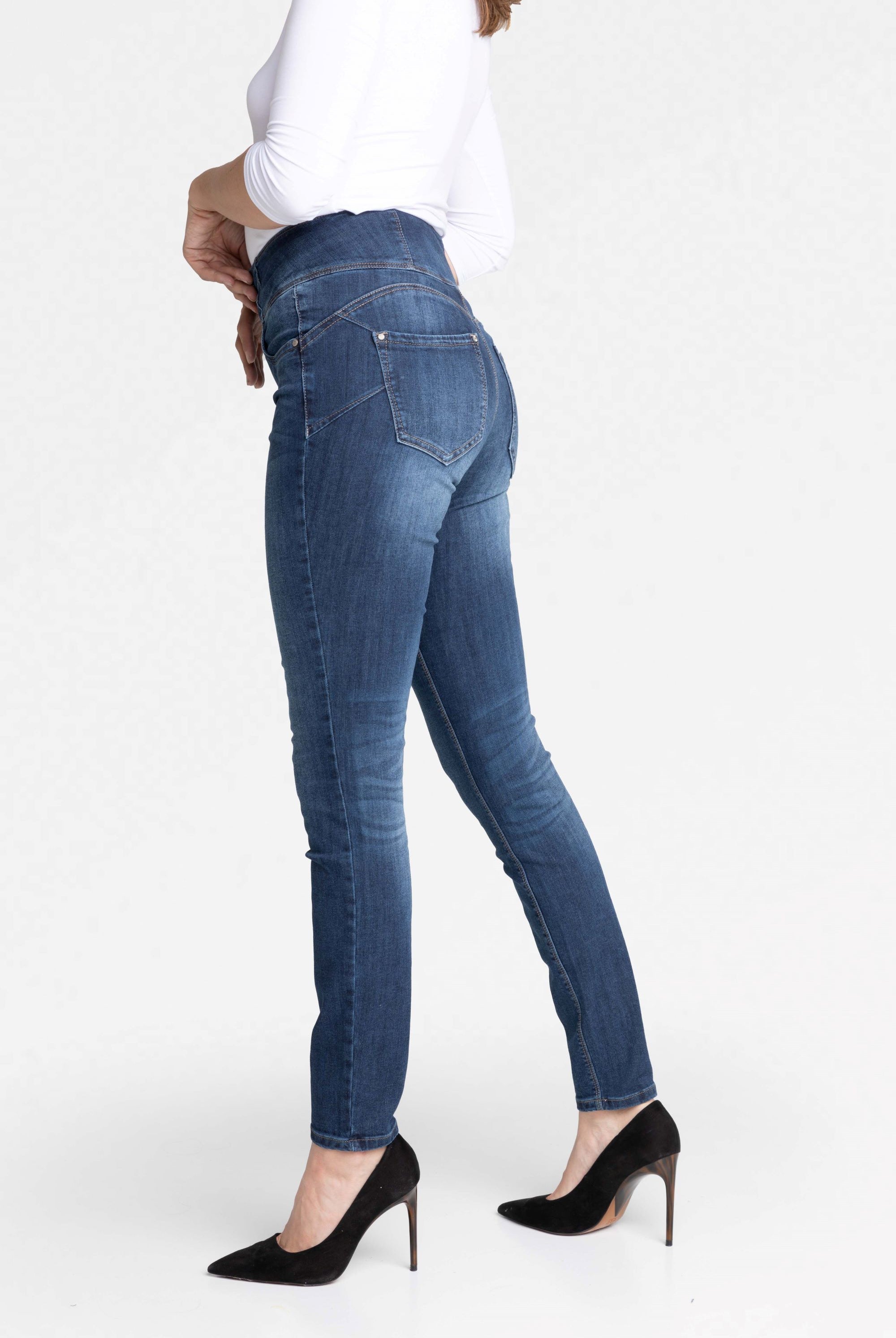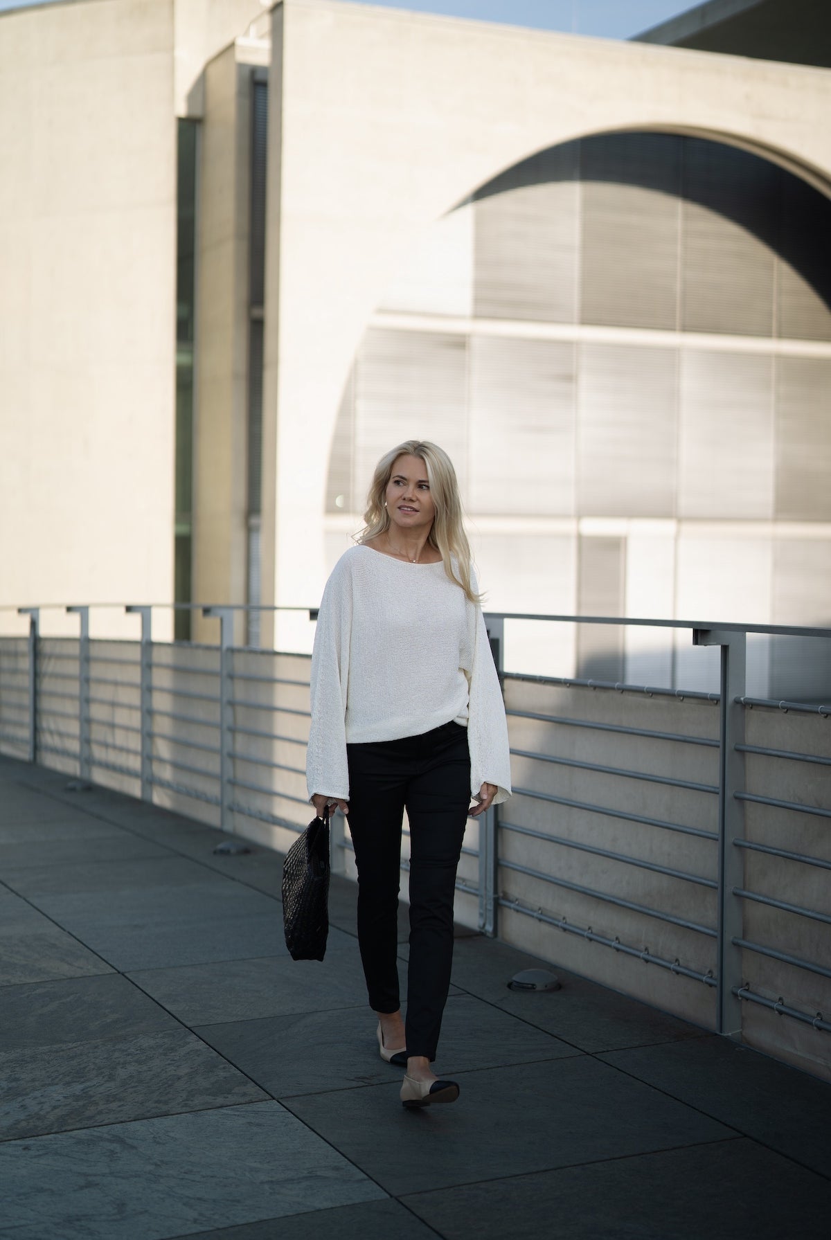 Klasyczne spodnie z wysokim stanem i prostą nogawką, zapinane na zamek. Ozdobione błyszczącym czarnym zamkiem nad przednią kieszonką. Modelka ma 170 cm wzrostu i nosi rozmiar S/31.