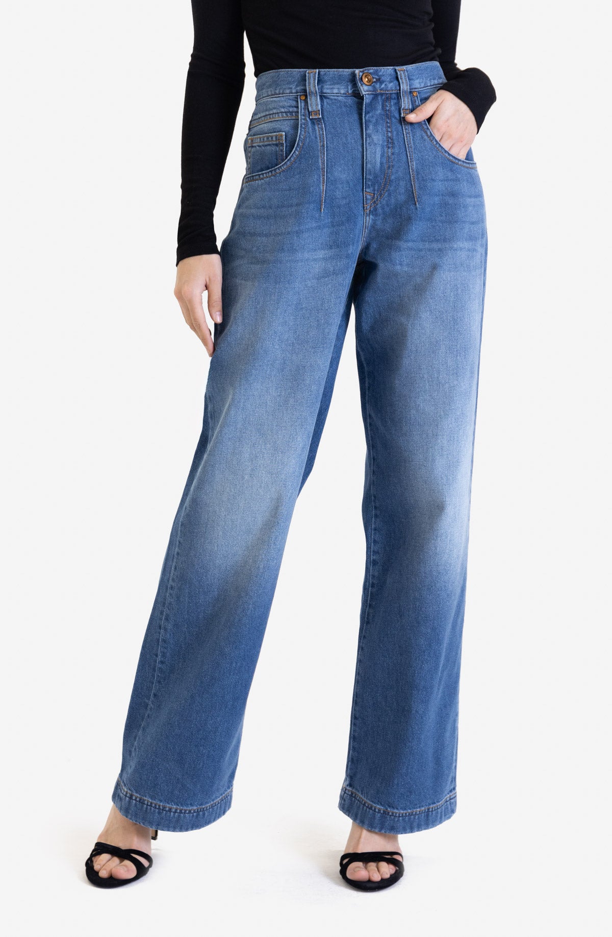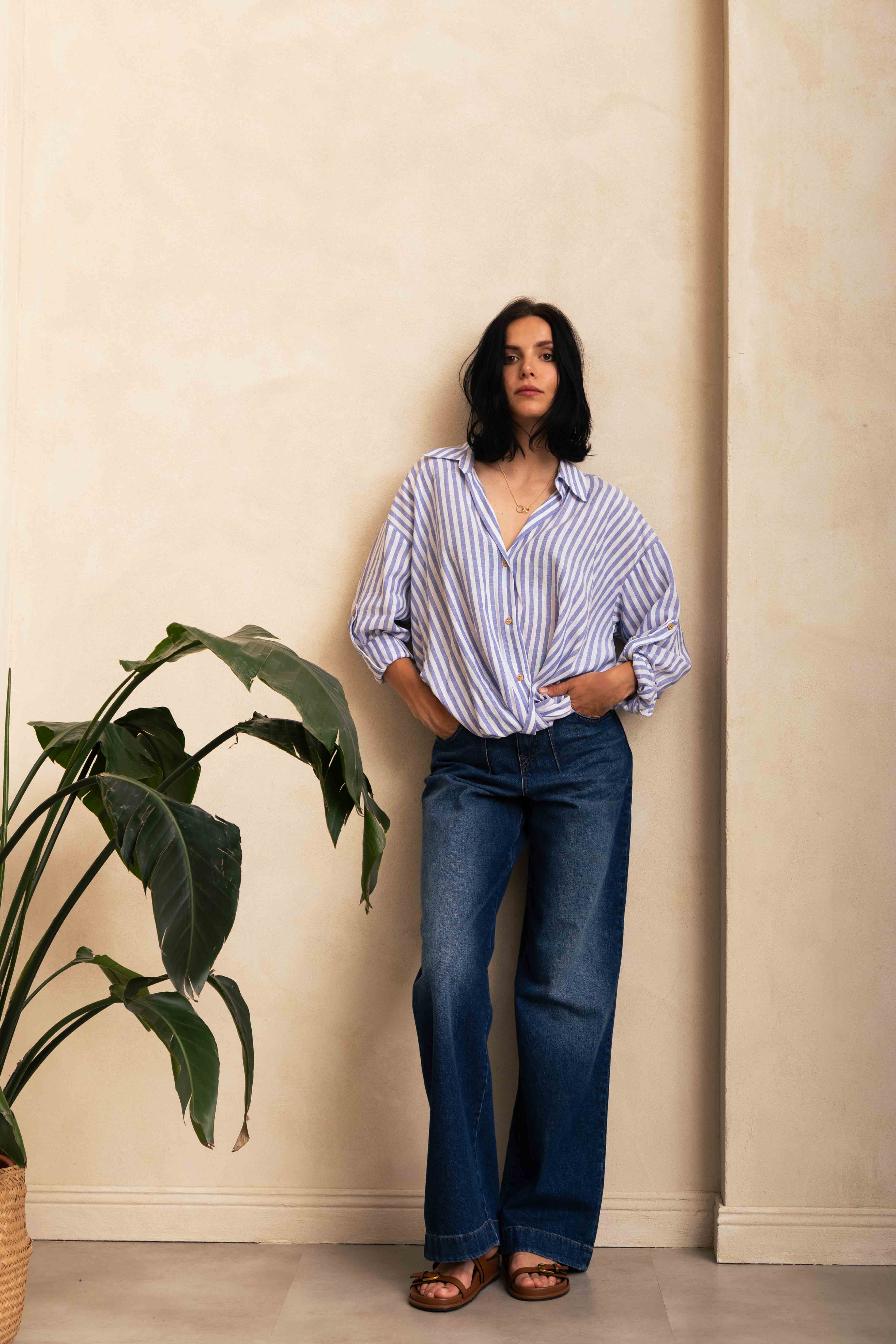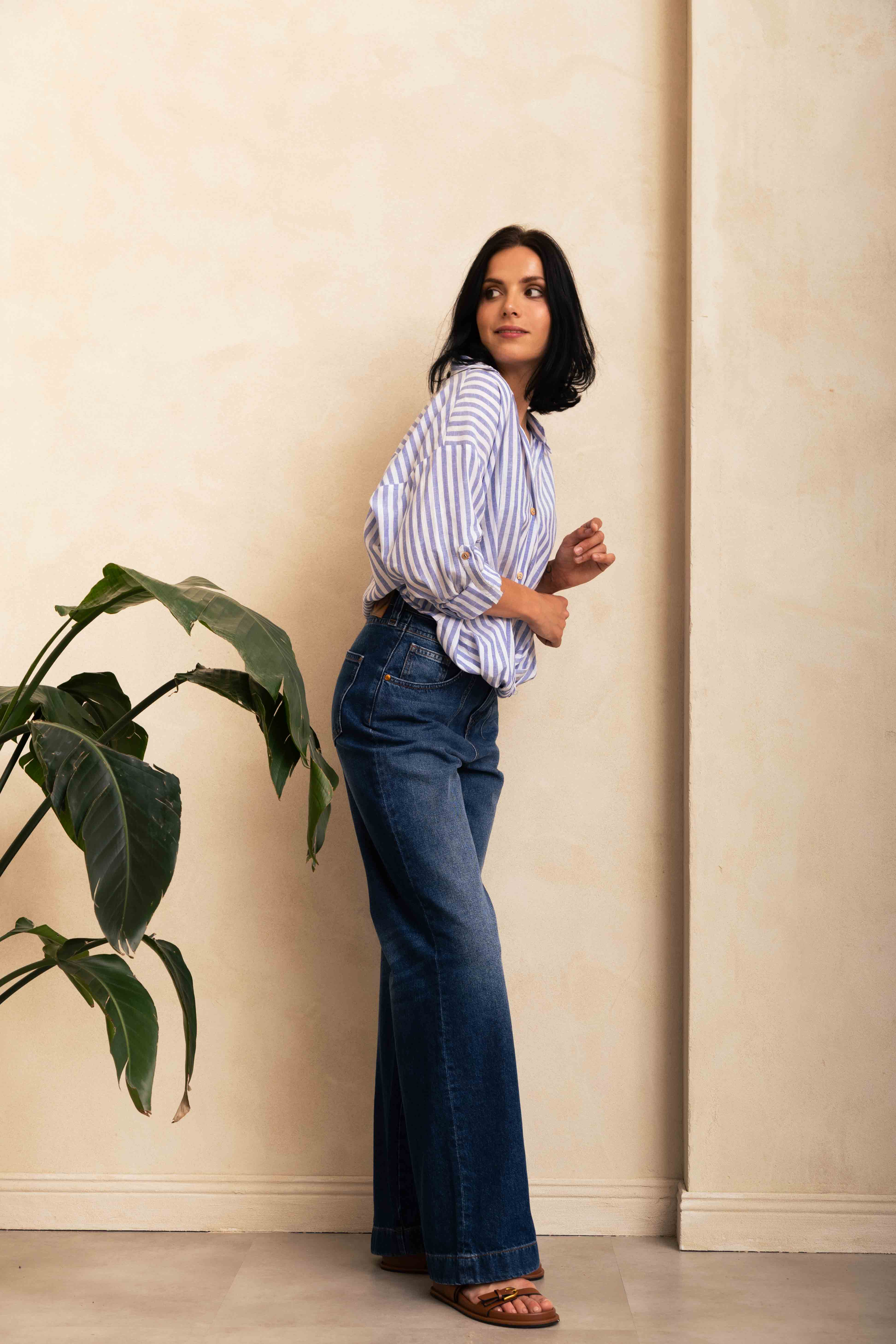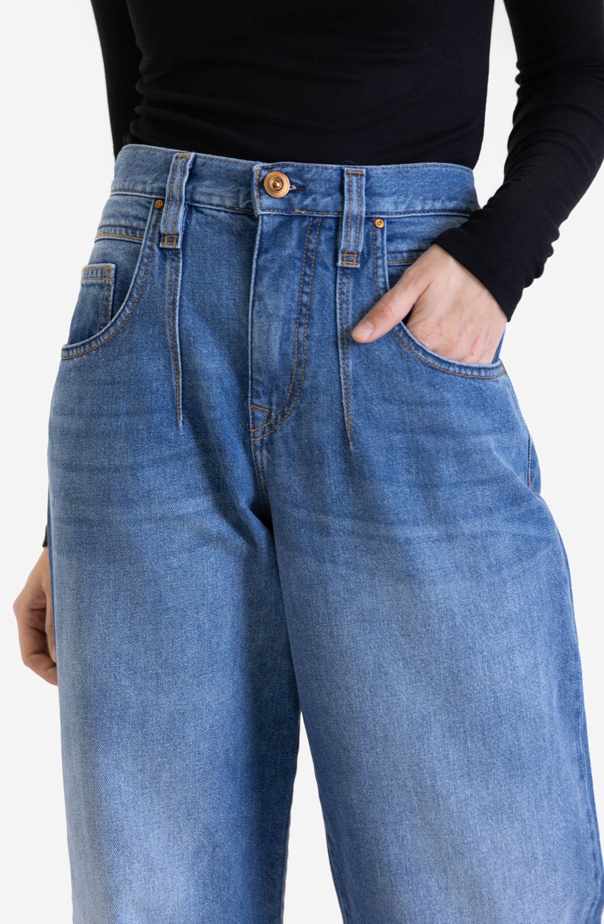 Spodnie typu WIDE LEG, bardzo szeroka nogawka zakończona eleganckim mankietem. Spodnie z bardzo wysokim stanem wykonane z cienkiego, bardzo miękkiego w dotyku 100% bawełnianego denimu. Pięknie modelują sylwetkę! W połączeniu z wyższymi butami nieziemsko wydłużają nogi! Nasza modelka ma 172 cm wzrostu i ma na sobie rozmiar S/32.