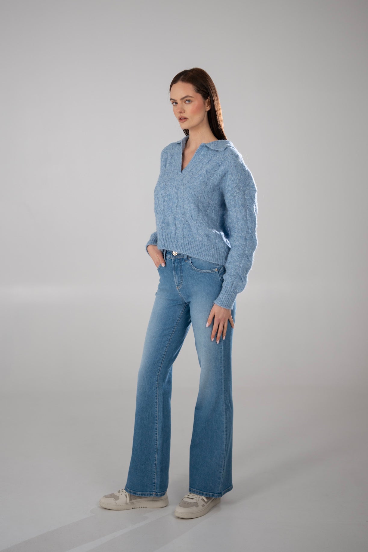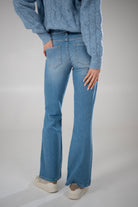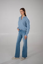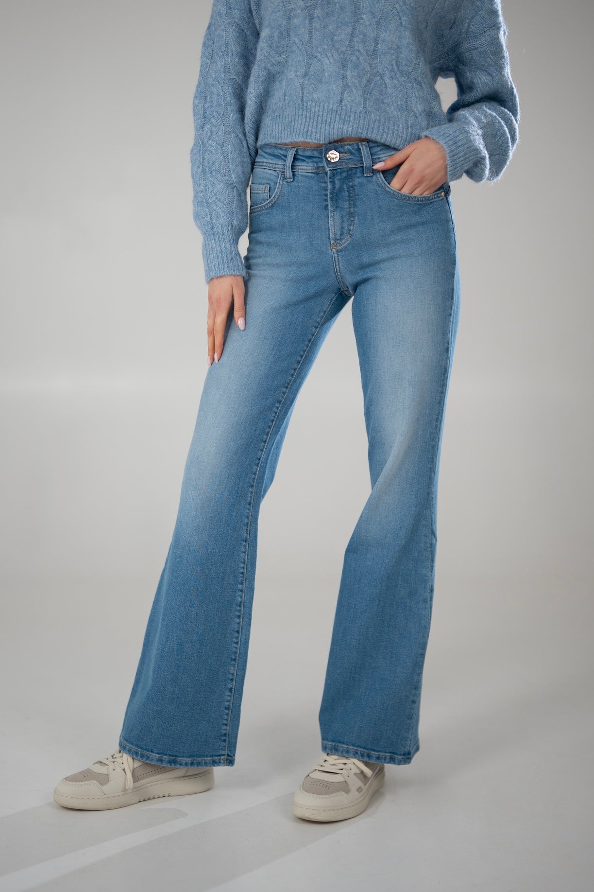 Dzwony MONA w przepięknym jasnoniebieskim kolorze - wykonane z bardzo miękkiego materiału. Jasnozłote akcesoria w postaci guzików i naszywki nadają spodniom letniego charakteru. Jeansy, które pięknie modelują sylwetkę. Mają średni stan i nogawkę, która rozszerza się od kolana w dół. Zaszewki na tyle spodni nadają pośladkom efekt "push up". Ela ma 170cm wzrostu i ma na sobie rozmiar S/32. Jagoda ma 176cm wzrostu i ma na sobie rozmiar S/32.