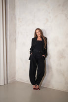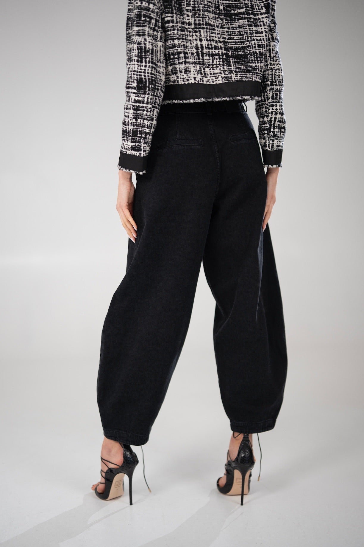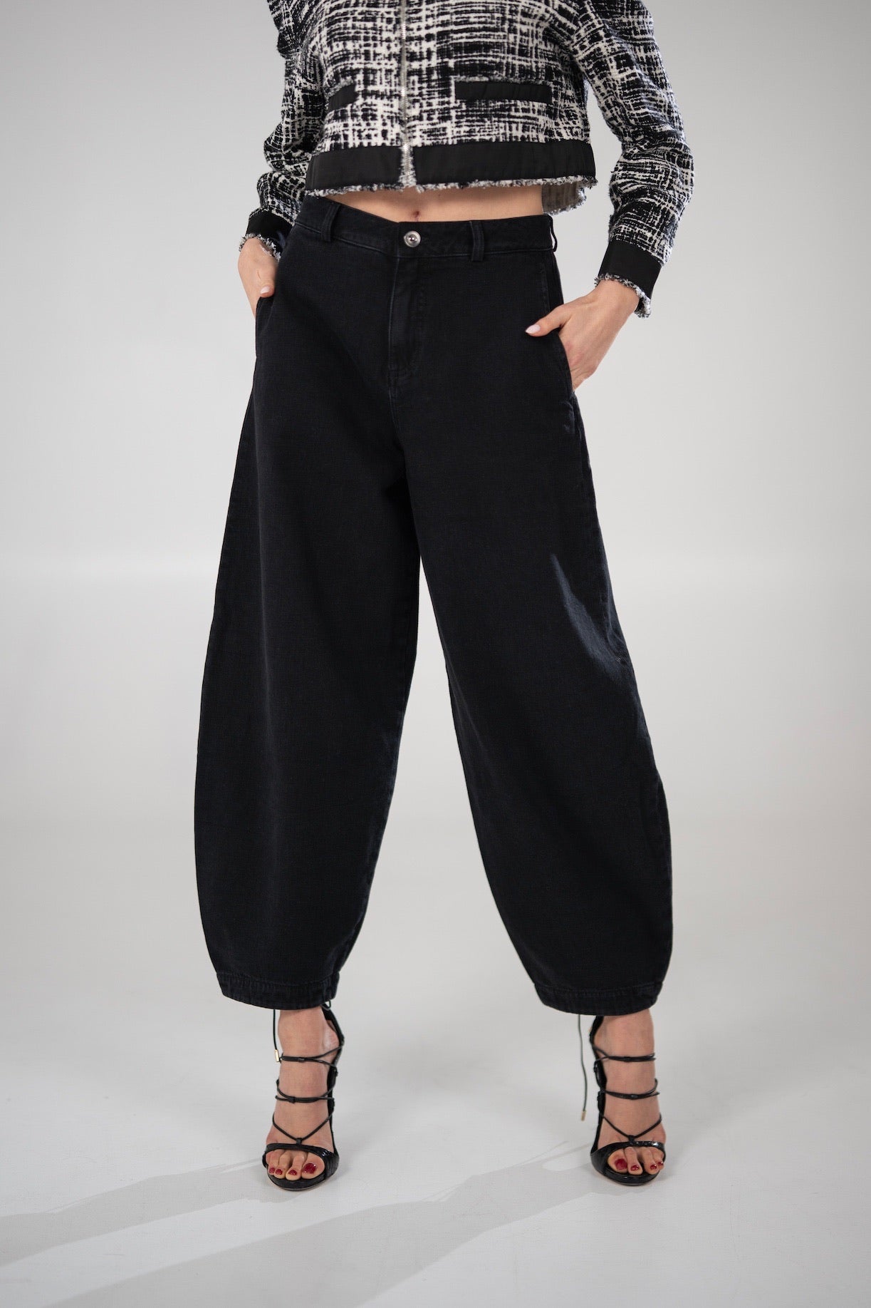 Spodnie RENE z nogawką typu BARREL z bardzo wysokim stanem i szeroką nogawką zawężaną ku dołowi. Wykonane z organicznej bawełny, która jest nie tylko miękka, ale i przyjemna i zdrowa dla ciała. Pięknie układają się na sylwetce, są bardziej dopasowane przy linii bioder. Możesz je nosić na co dzień do sportowych butów, latem do klapków lub na wyjście do szpilek. Rozmiar wypada standardowo. Ela ma 170 cm wzrostu i ma na sobie rozmiar S. Jagoda ma 176cm wzrostu i ma na sobie rozmiar S. MODELU RENE ZE WZGLĘDU NA NIESTANDARDOWE WYKOŃCZENIE DOŁU LAMOWANIEM NIE MA MOŻLIWOŚCI SKRÓCENIA.