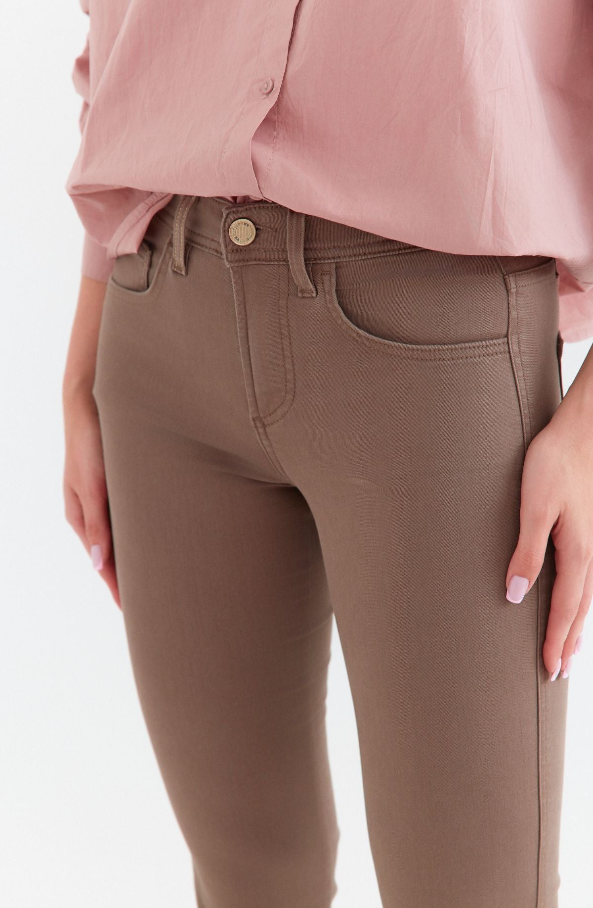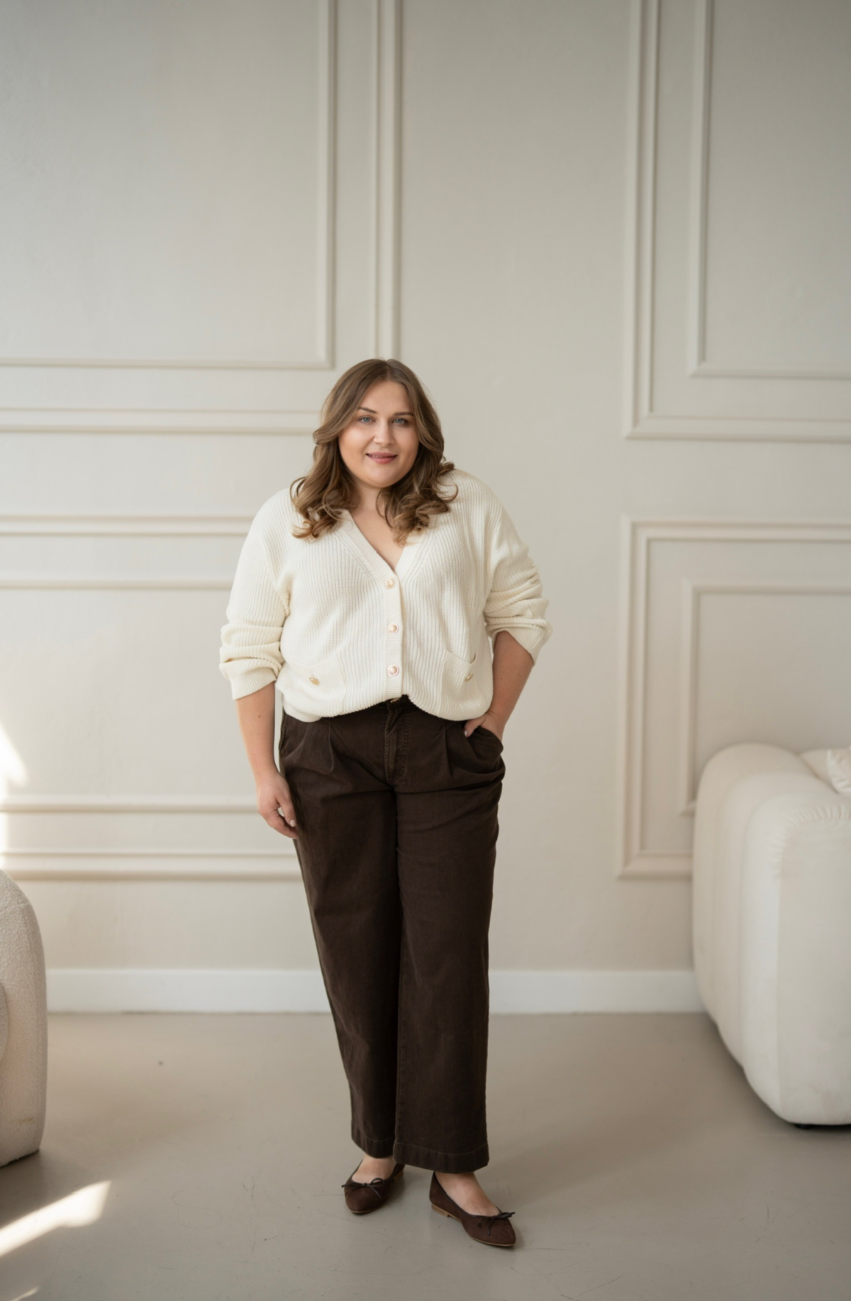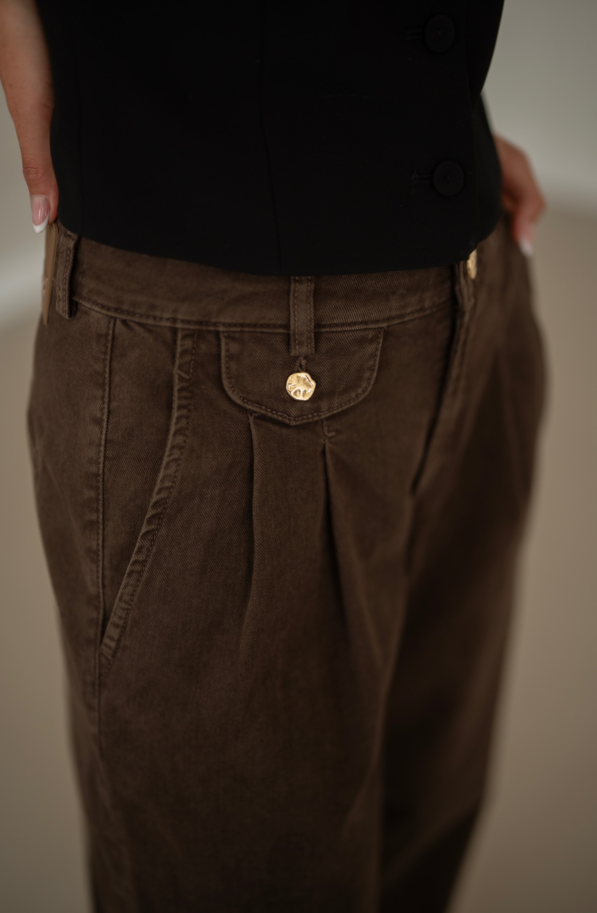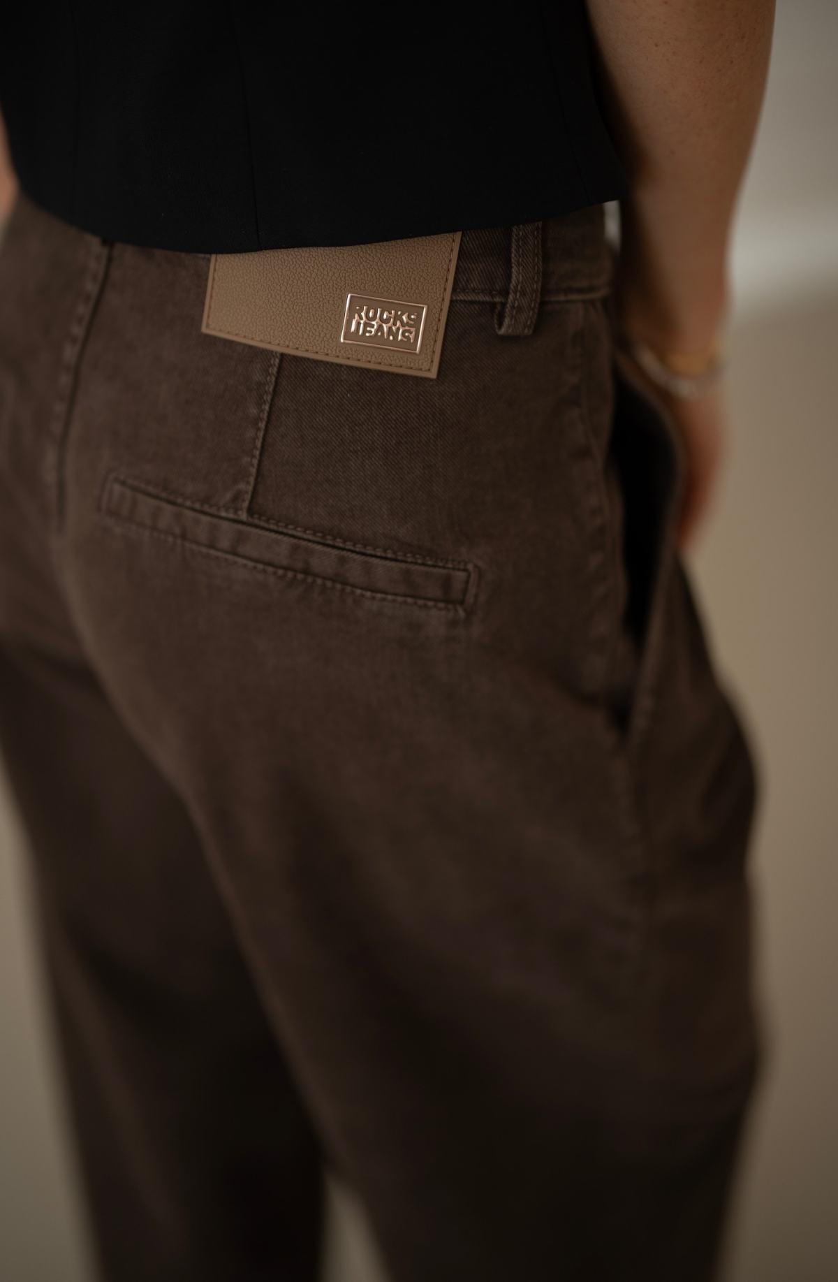 Zupełnie nowy fason w naszej kolekcji. Spodnie SISI mają wysoki stan i bardzo szeroką nogawkę zakończoną szerszym podwinięciem. Tkanina w eleganckim, chłodnym odcieniu brązu jest tak miękka i przyjemna w noszeniu, że nie będziesz chciała ich zdjąc!