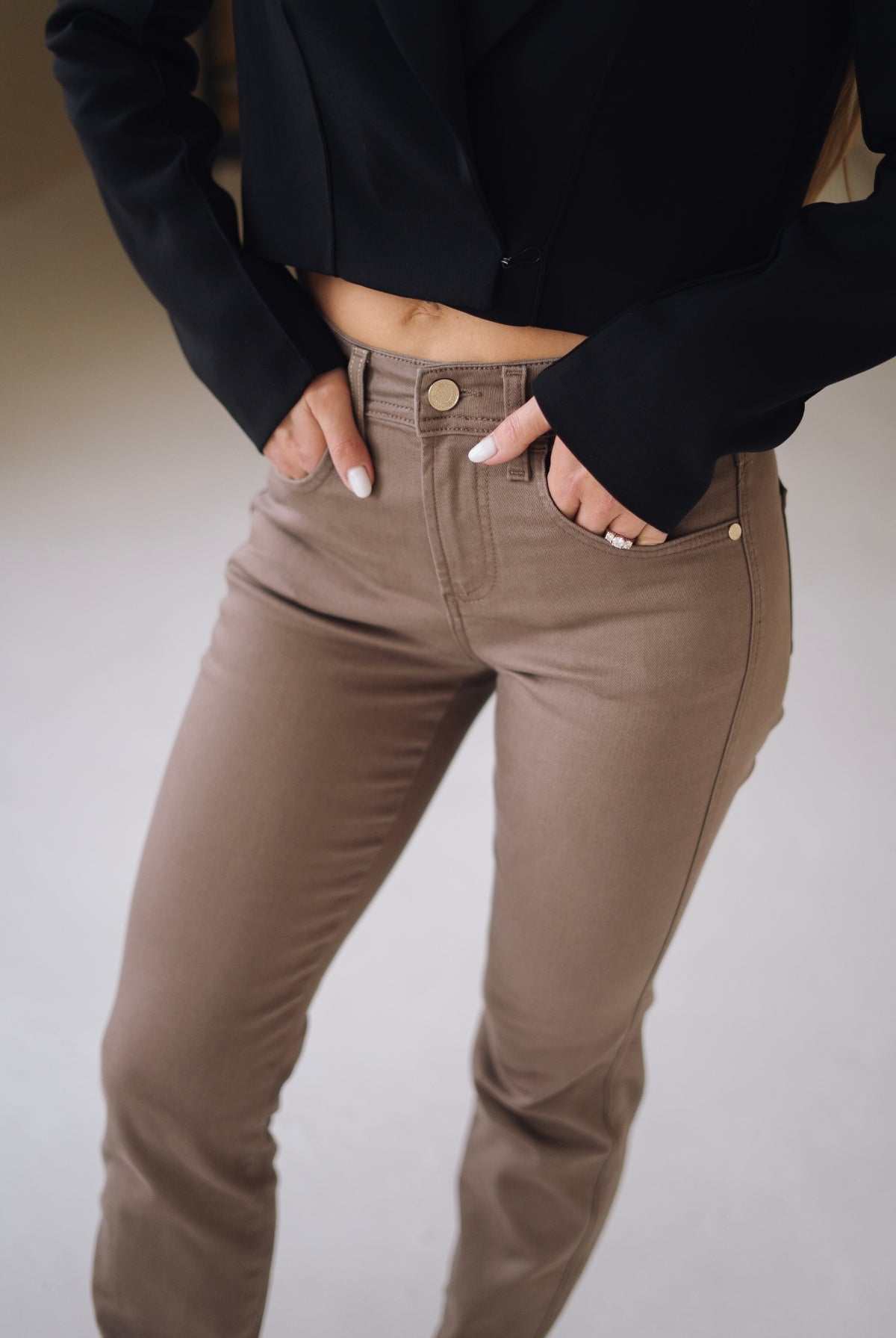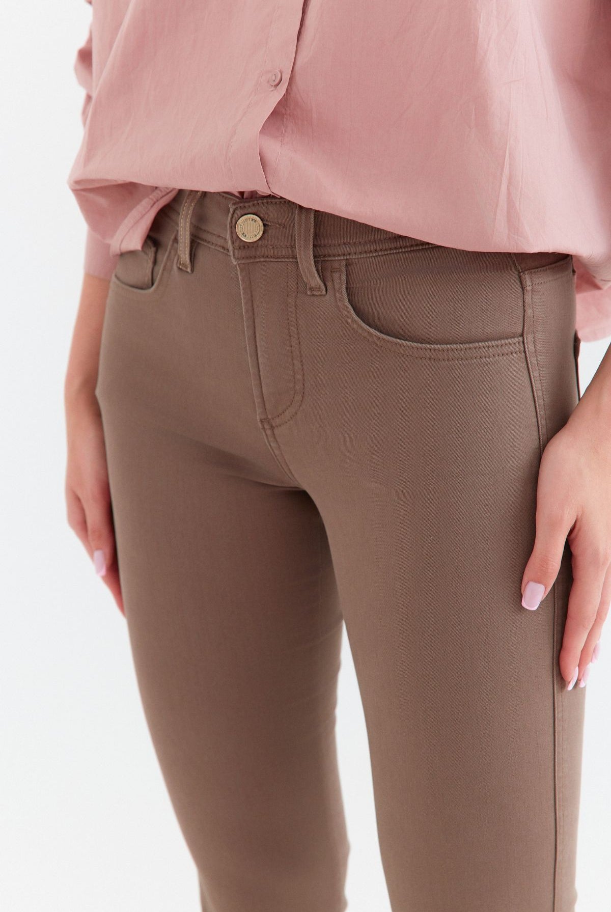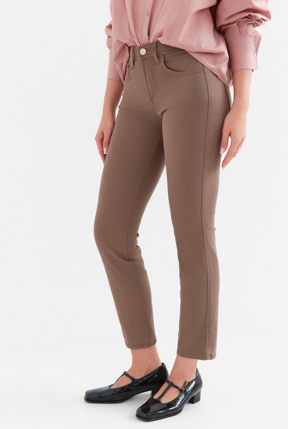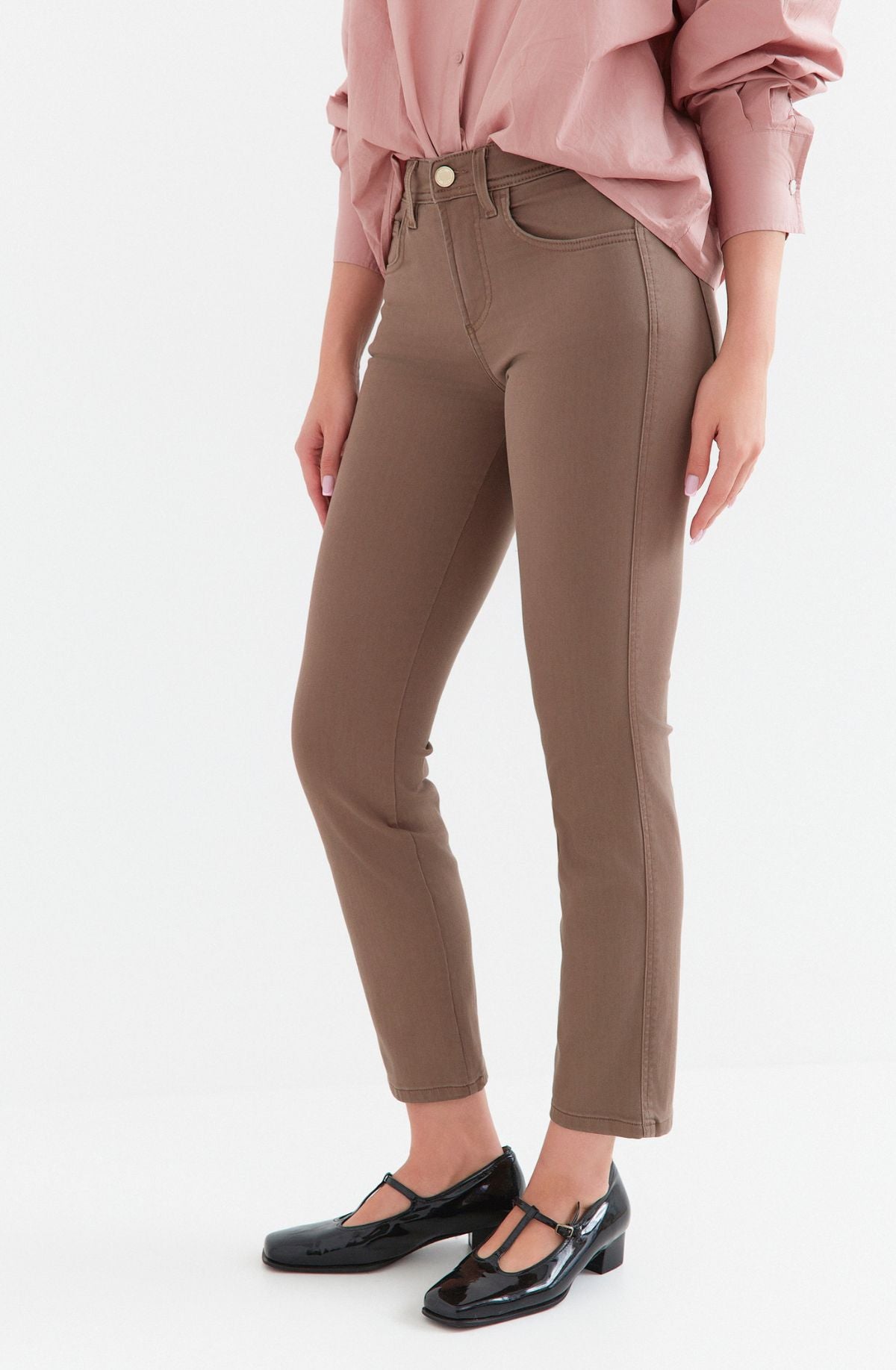 Zupełnie nowy fason w naszej kolekcji. Spodnie SISI mają wysoki stan i bardzo szeroką nogawkę zakończoną szerszym podwinięciem. Tkanina w eleganckim, chłodnym odcieniu brązu jest tak miękka i przyjemna w noszeniu, że nie będziesz chciała ich zdjąc!