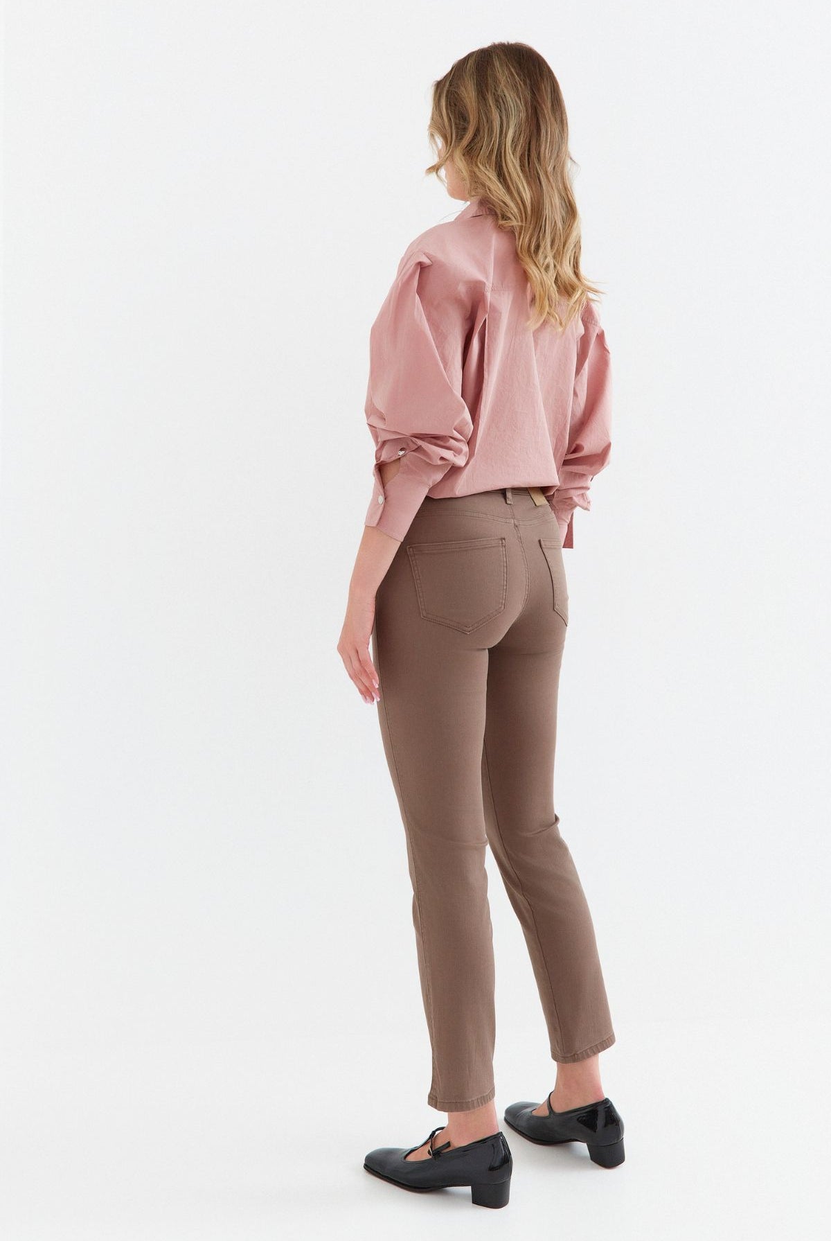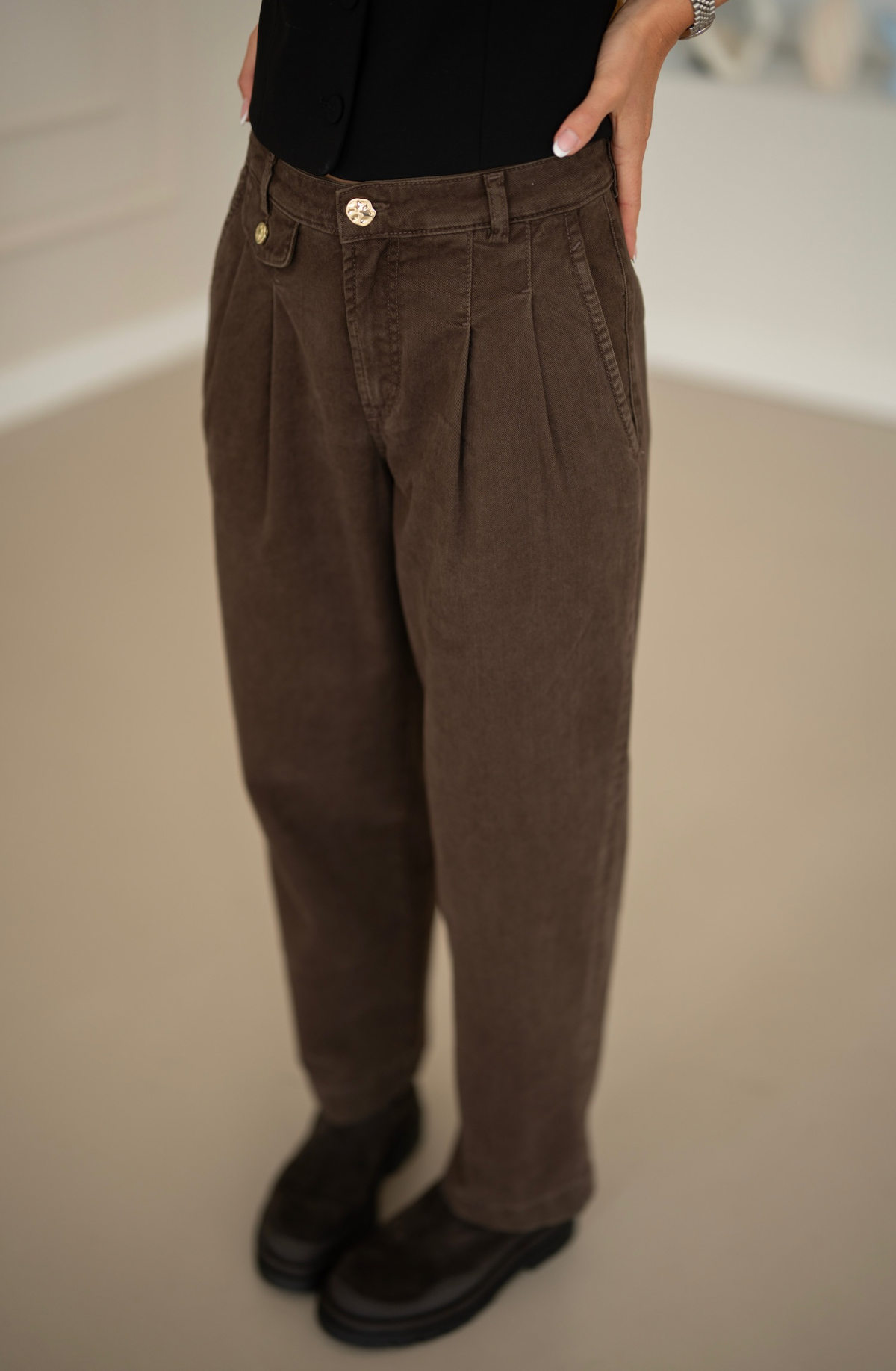 Z przodu zastosowaliśmy zaszewki, które pięknie zbierają tkaninę uwydatniając talię. Rzeźbione guziki w złotym kolorze oraz przepiękny odcień brązu nadają spodniom eleganckiego charakteru. Model ten świetnie sprawdzi się przy każdej figurze, ponieważ ma bardzo uniwersalny krój. U niższych osób sugerujemy podwinąć mankiet.